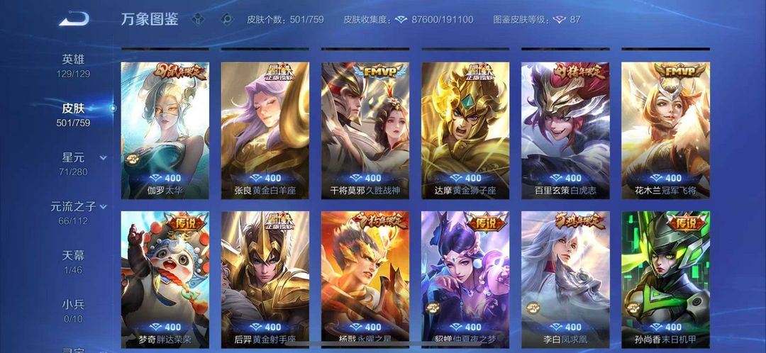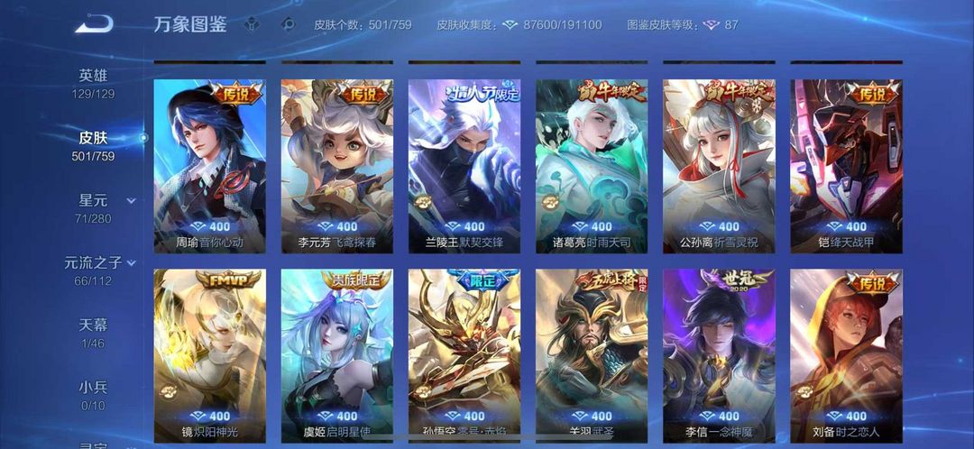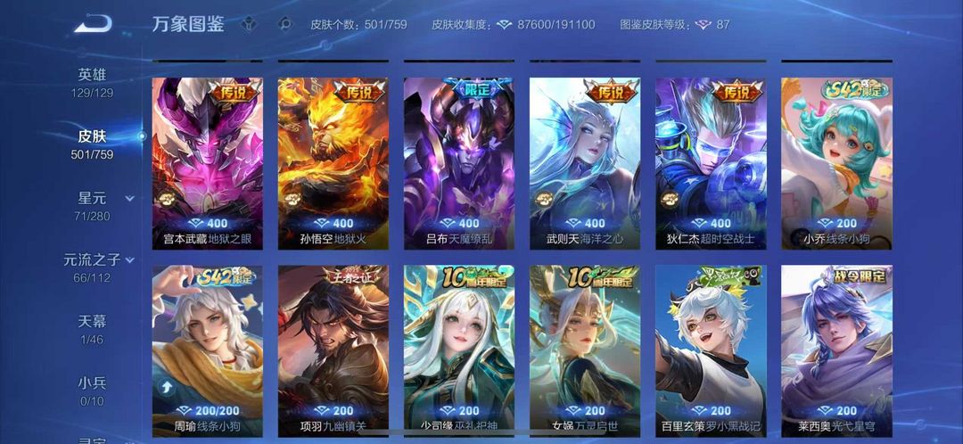女生号 贵10 多皮肤多传说 别拿那些空号v10来比 要看性价比 貂蝉武则天夏侯惇孙悟空李白鲁班小乔荣耀水晶 妲己九尾无双皮肤 80个传说 473皮肤