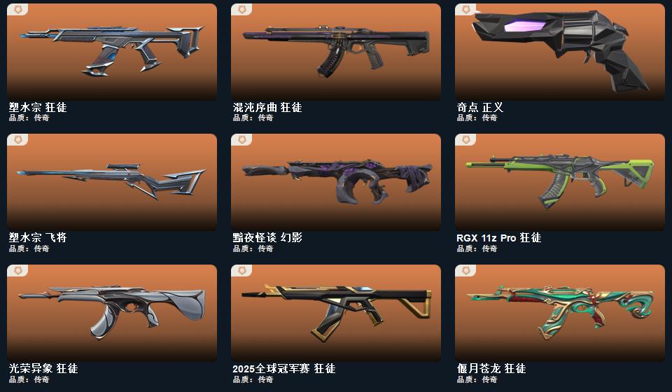 无畏契约★皮肤79/甜心猎手 短炮,星际猎兵 标配,瑰梦艺语 鬼魅,光环序列 狂怒,VCT25 x BLG 标配,喷火式 狂怒,阿特拉斯指挥部 标配,太空穿梭