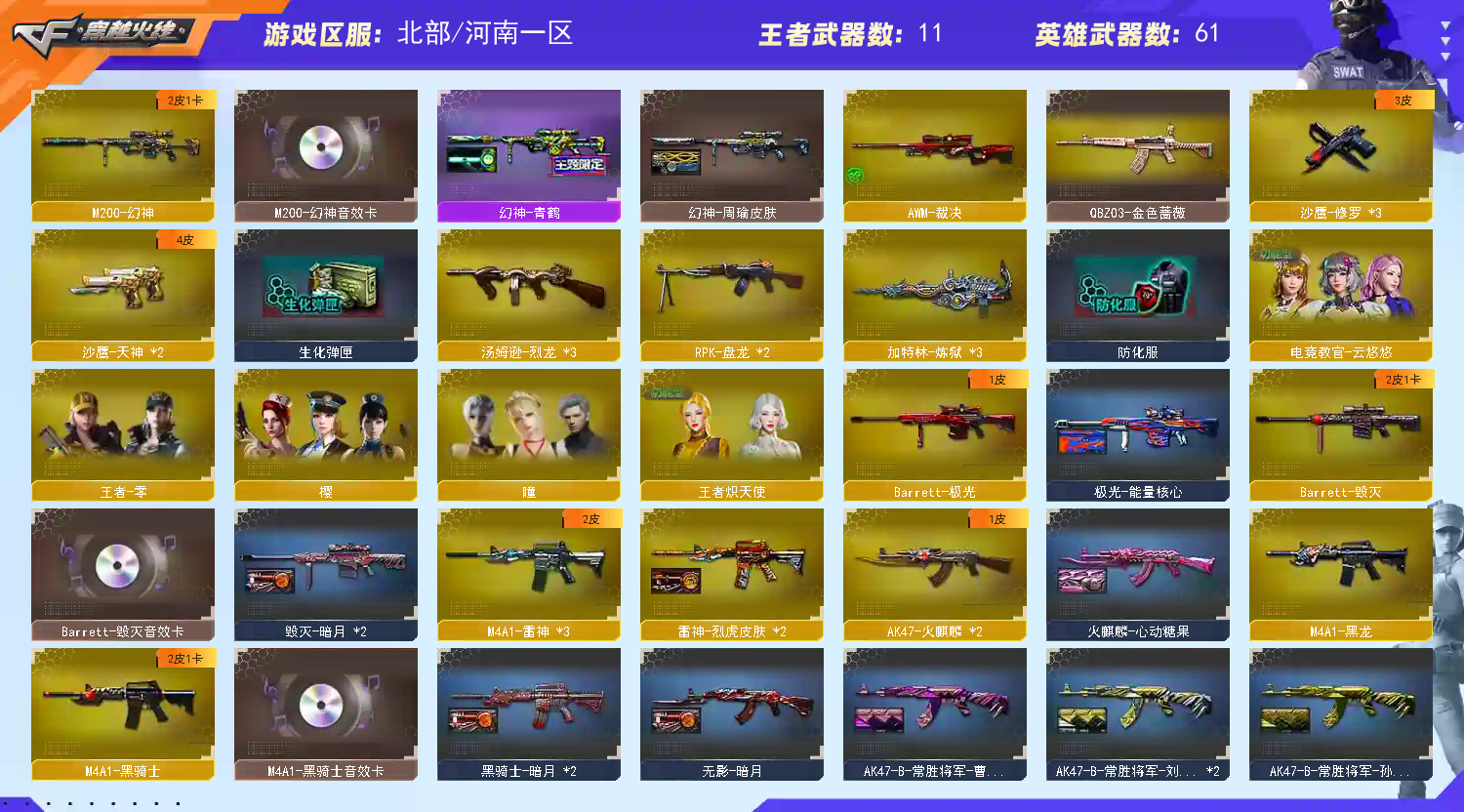 【河南一区】【可排位】【新锐1】【VIP6】【V武器数64】【幻神三件套】【幻神2皮】【死亡之眼】【竞技荣光套装X4套】【M200-幻神】【幻神-周瑜皮肤】【幻神-青鹤】【M200-幻神音效卡】【AWM-裁决】【QBZ03-金色蔷薇】【加特林-炼狱】【RPK-盘龙】【汤姆逊-烈龙】【烈龙-悦心-觉醒版】【死亡之眼】【电竞教官-云悠悠】【乔伊教练】【瞳】【王者-零】【王者炽天使】【樱】【M4A1-雷神】【雷神-烈虎皮肤】【AK47-火麒麟】【火麒麟-心动糖果】【火麒麟-CFSTAR】【M4A1-黑骑士】【黑骑士-暗月】【M4A1-黑骑士音效卡】【M4A1-黑龙】【Barrett-毁灭】【毁灭-暗月】【Barrett-毁灭音效卡】;电竞教官-云悠悠,RPK-盘龙,QBZ03-金色蔷薇,M200-幻神,