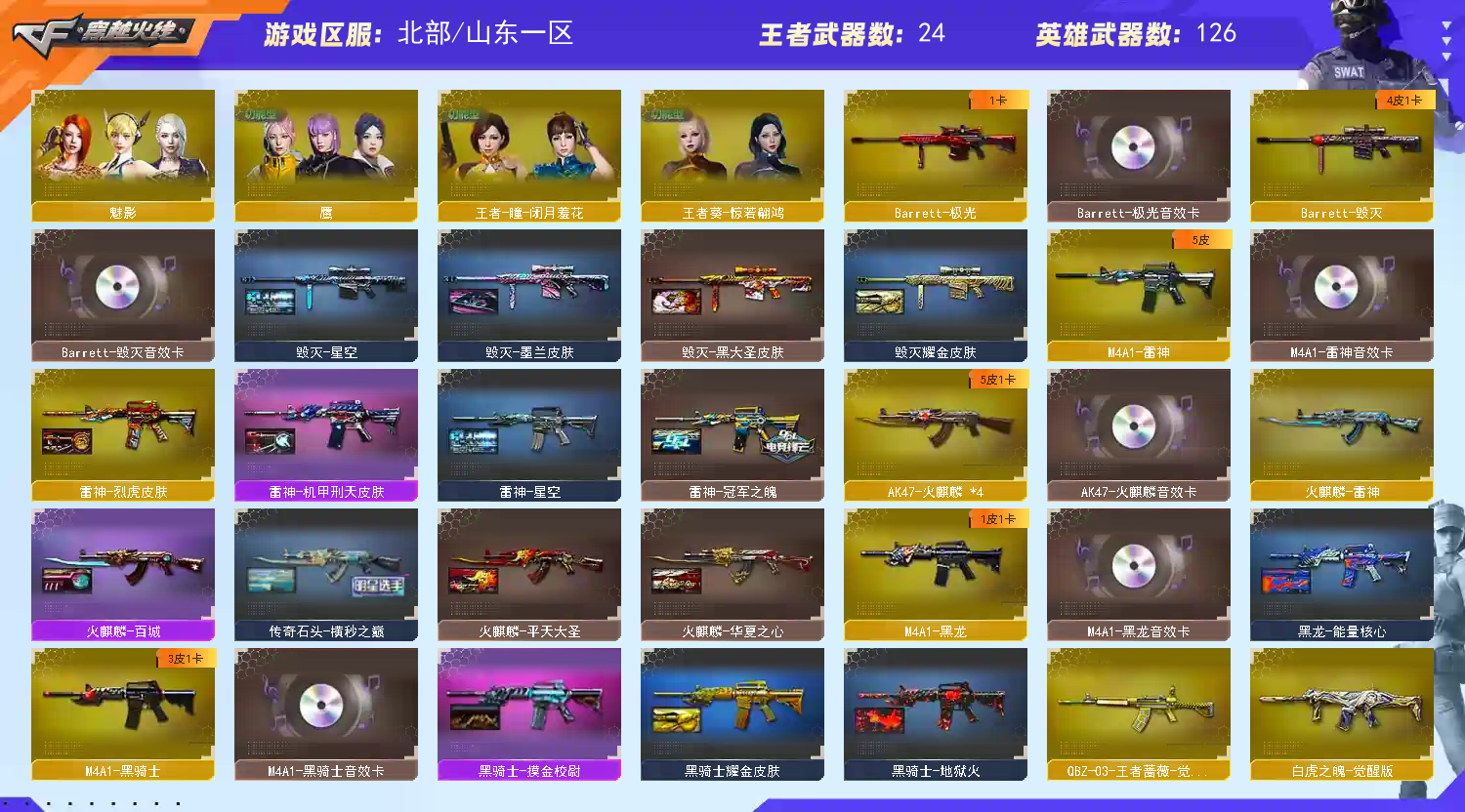 山东一区【可排位】【VIP6】【V武器数133】【幻神三件套】【幻神1皮】【6烈龙】【斯泰尔-蝴蝶】【6盘龙】【竞技荣光套装X4套】【幻灵套装X7套】【夜魔套装X1套】【传说女帝】【传说艾莉莎】【传说暗裔】【传说夜影】【M200-幻神】【幻神-AG-CFPLS17冠军】【M200-幻神音效卡】【M200-竞技荣光】【Kar98K-星神】【AWM-裁决】【Scar Light-白虎】【Scar Light-白虎音效卡】【王者白虎-觉醒版】【白虎之魄-觉醒版】【QBZ03-金色蔷薇】【QBZ03-金色蔷薇音效卡】【QBZ-03-王者蔷薇-觉醒版】【M4A1-青龙】【HK417-朱雀】【M4A1-幻灵】【USP-雷暴】【荣耀世冠-柯尔特】【柯尔特-竞技荣光】【COP 357-幻灵】【加特林-炼狱】【RPK-盘龙】【炼狱-悦蓝-觉醒版】【汤姆逊-烈龙】【斯泰尔-蝴蝶】【传说女帝】【传说艾莉莎】【电竞教官-云悠悠】【葵】【乔伊教练】【王者春】【王者-葵-貂蝉】【王者-瞳-闭月羞花】【王者葵-惊若翩鸿】【王者玲珑】【王者玲珑-小乔】【鹰】【影豹】【魅影】【M4A1-雷神】【雷神-冠军之魄】【雷神-赛博朋克】【雷神-烈虎皮肤】【雷神-机甲刑天皮肤】【雷神-星空】【M4A1-雷神音效卡】【AK47-火麒麟】【火麒麟-华夏之心】【火麒麟-AG战队皮肤】【传奇石头-横秒之巅】【火麒麟-平天大圣】【火麒麟-百城】【火麒麟-CFSTAR】【火麒麟-雷神】【AK47-火麒麟音效卡】【M4A1-黑骑士】【黑骑士-地狱火】【黑骑士耀金皮肤】【黑骑士-摸金校尉】【黑骑士-摸金校尉】【M4A1-黑骑士音效卡】【M4A1-黑龙】【黑龙-能量核心】【M4A1-黑龙音效卡】【Barrett-毁灭】【毁灭耀金皮肤】【毁灭-星空】【毁灭-黑大圣皮肤】【Barrett-毁灭音效卡】;USP-雷暴,荣耀世冠-柯尔特,传说女帝,电竞教官-云悠悠,传说艾莉莎,RPK-盘龙,QBZ03-金色蔷薇,