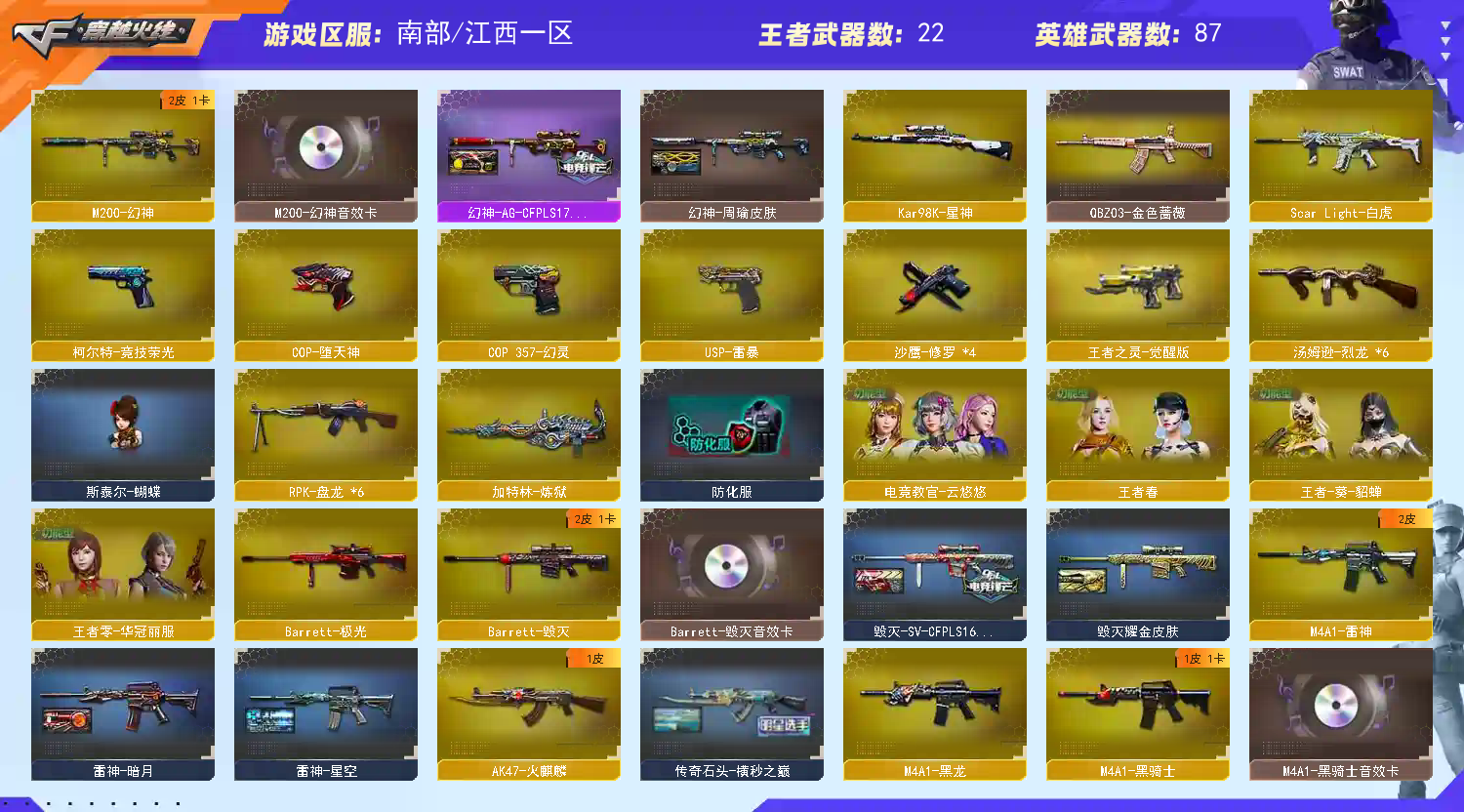 【江西一区】【可排位】【V武器数102】【幻神三件套】【幻神2皮】【6烈龙】【斯泰尔-蝴蝶】【死亡之眼】【6盘龙】【竞技荣光套装X2套】【幻灵套装X4套】【堕天神套装X6套】【堕天神套装X6套】【M200-幻神】【幻神-AG-CFPLS17冠军】【幻神-周瑜皮肤】【M200-幻神音效卡】【M200-竞技荣光】【王者幻神-觉醒版】【Kar98K-星神】【Scar Light-白虎】【QBZ03-金色蔷薇】【QBZ-03-王者蔷薇-觉醒版】【M4A1-雷霆王者-觉醒版】【M4A1-堕天神】【USP-雷暴】【柯尔特-竞技荣光】【COP 357-幻灵】【COP-堕天神】【加特林-炼狱】【RPK-盘龙】【魂·炼狱-玩具枪】【汤姆逊-烈龙】【斯泰尔-蝴蝶】【死亡之眼】【电竞教官-云悠悠】【王者春】【王者-葵-貂蝉】【王者零-华冠丽服】【M4A1-雷神】【雷神-星空】【雷神-暗月】【AK47-火麒麟】【传奇石头-横秒之巅】【M4A1-黑骑士】【黑骑士耀金皮肤】【M4A1-黑骑士音效卡】【M4A1-黑龙】【Barrett-毁灭】【毁灭-SV-CFPLS16冠军】【毁灭耀金皮肤】【Barrett-毁灭音效卡】;USP-雷暴,电竞教官-云悠悠,RPK-盘龙,QBZ03-金色蔷薇,M200-幻神,Scar Light-白虎,Kar98K-星神,