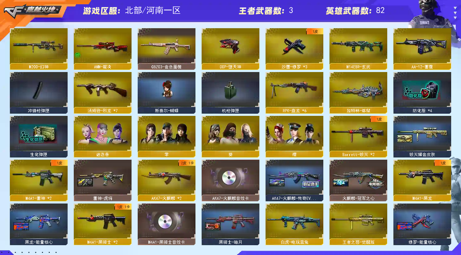首页 > 租号大厅 > 穿越火线 > 网通区/河南一区 > 极品号/生化号/幻神/6盘6烈/白虎/qbz金色蔷薇 m4千变 雷神 黑骑士 ak火麒麟