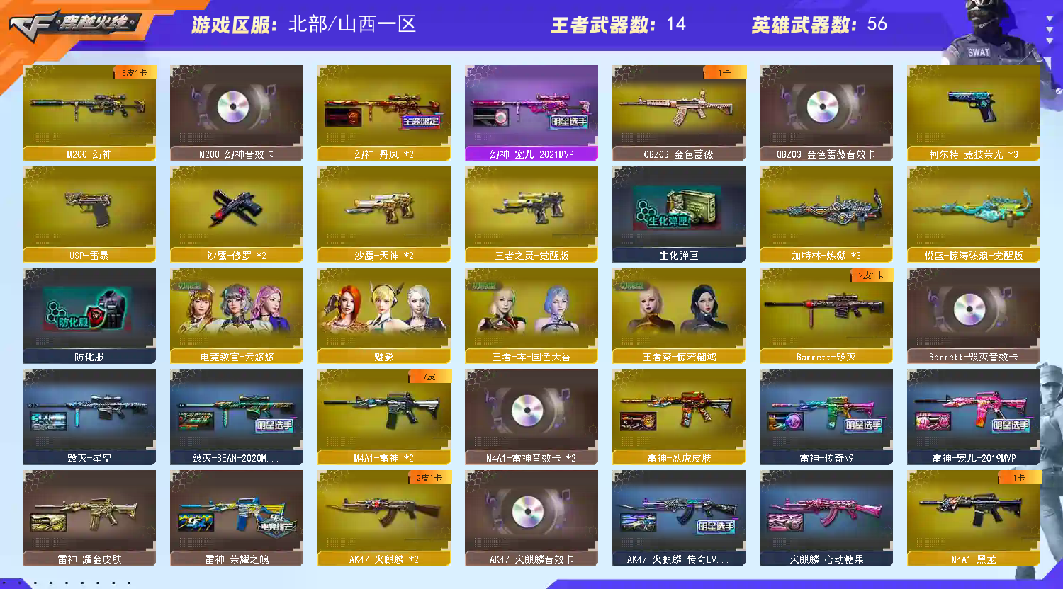 此号价值过大,已向公安机关报备,如有开G开辅助封号的,由平台提供,身份信息证据和地址进行报警处理并依法追究.;USP-雷暴,电竞教官-云悠悠,QBZ03-金色蔷薇,M200-幻神,