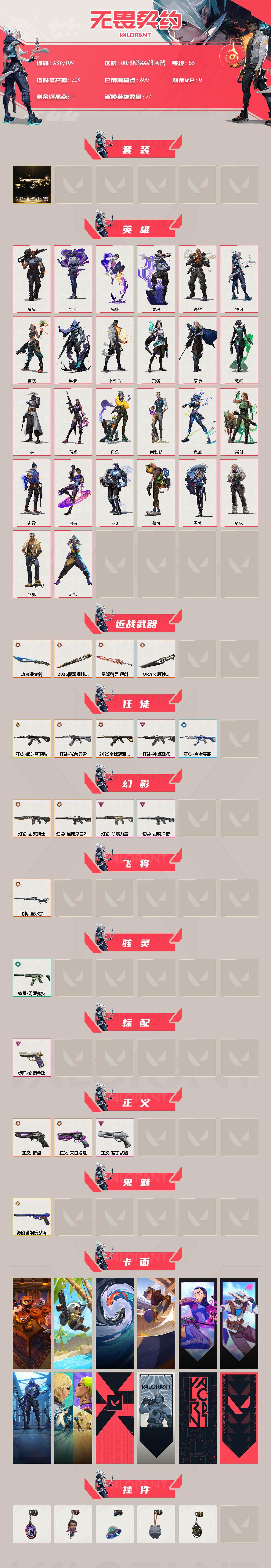 冻结三分钟内解除,短信通知重新上即可!喜欢收藏不迷路、游戏异常进小黑屋、时间不够请提前续租或者不要开局【套装】:2025全球冠军赛套装 【英雄】:幻棱,炼狱,维斯,暮蝶,钛狐,壹决,铁臂,捷风,雷兹,幽影,不死鸟,贤者,猎枭,蝰蛇,零,芮娜,奇乐,尚勃勒,霓虹,斯凯,夜露,星礈,K/O,盖可,黑梦,钢锁 【近战武器】:近战武器-2025全球冠军赛 蝴蝶刀,近战武器-ORA x 颗秒 军刀,近战武器-琉璃锻梦剑,近战武器-星际猎兵 短剑 【狂徒】:狂徒-超时空卫队,狂徒-2025全球冠军赛,狂徒-光荣异象,狂徒-冰点凝冻,狂徒-合金突袭 【幻影】:幻影-毁灭骑士,幻影-混沌序曲//2.0,幻影-灵魂冲击,幻影-侦察力量 【飞将】:飞将-塑水宗 【骇灵】:骇灵-无限竞技 【标配】:标配-紫阙金琅 【正义】:正义-奇点,正义-末日泡泡,正义-离子武器 【鬼魅】:鬼魅-源能者娱乐系统 【卡面】:南瓜盛典 卡面,树懒大作战 卡面,红鳞松叶 卡面,Clutch 卡面,无畏契约GO!一卷:芮娜 卡面,无畏契约GO!:零 卡面,暗枪 卡面,钢锁vs盖可 卡面,代号红色 卡面,新兵报到 卡面,V契约 卡面,无畏契约 卡面 【喷漆】:小丑猫 喷漆,高丽风情小蛙 喷漆,买装还是存钱 喷漆,无畏契约GO!一卷:芮娜 喷漆,红鳞 喷漆,无畏契约GO!一卷:贤者 喷漆,胜利属于无畏契约 喷漆,GLHF 喷漆,无畏契约 喷漆 【挂饰】:第九季//第三幕 纪念币 挂饰,无畏契约GO!一卷 芮娜 挂饰,天外飞客 挂饰,《双城之战》魄罗 挂饰,无畏契约 纪念币 挂饰;侦察力量 幻影,光荣异象 狂徒,塑水宗 飞将,奇点 正义,离子武器 正义,紫阙金琅 标配,