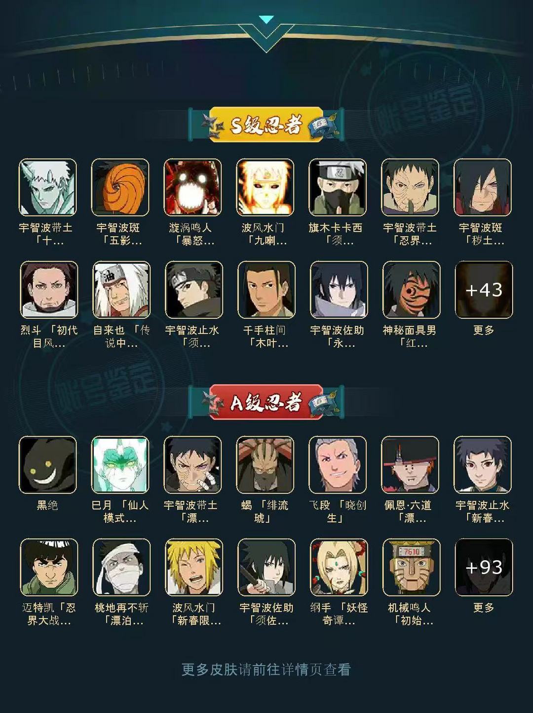 大蛇丸 「晓」;漩涡博人 「桃式显现」;日向雏田 「最终章」;猿飞阿斯玛;宇智波佐助 「万花筒写轮眼」 B忍者:日向雏田 「疾风传」;日向宁次 「中秋限定」;宇智波鼬 「红夜之刃」;君麻吕 「漂泊浪客」;旗木卡卡西 「暗部」;惠比寿;纲手 「木叶三忍」;黑土;日向雏田 「元气夏日」;山中井野 「新春限定」;漩涡鸣人 「第一尾」;犬塚花;木叶丸 「疾风传」;漩涡鸣人 「疾风传」;宇智波鼬 「暗部」;壹·叁 「火之意志继承者」;阿三;千代;奈良鹿丸 「疾风传」;漩涡玖辛奈 「新春限定」;漩涡鸣人 「中秋限定」;雨琉 「羁绊」;药师兜 「恶灵之影」;宇智波带土 「少年」;宇智波佐助 「忍者之路」;二位由木人 「二尾人柱力」;风祭萌黄 「木叶上忍」;夕日红 「冬日限定」;老紫 「四尾人柱力」;香燐;二位由木