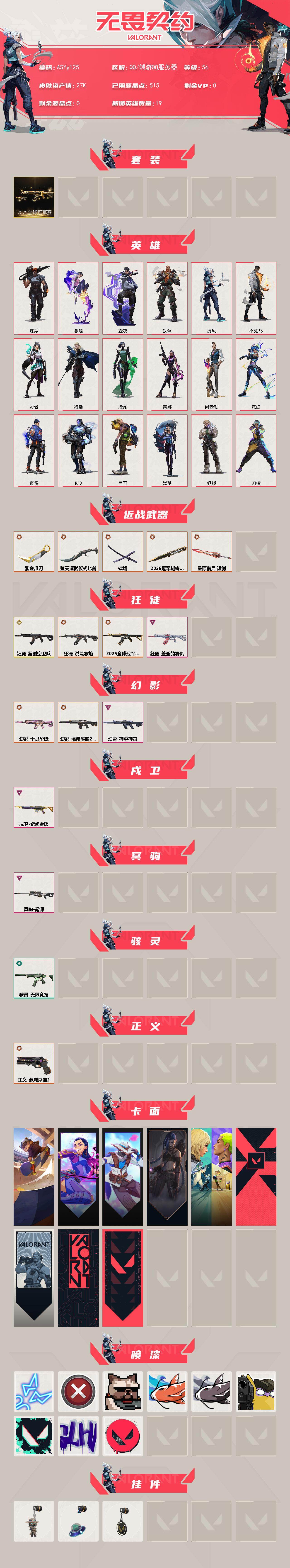 冻结三分钟内解除,短信通知重新上即可!喜欢收藏不迷路、游戏异常进小黑屋、时间不够请提前续租或者不要开局 【套装】:2025全球冠军赛套装 【英雄】:幻棱,炼狱,暮蝶,壹决,铁臂,捷风,不死鸟,贤者,猎枭,蝰蛇,芮娜,尚勃勒,霓虹,夜露,K/O,盖可,黑梦,钢锁 【近战武器】:近战武器-2025全球冠军赛 蝴蝶刀,近战武器-紫金爪刀,近战武器-镭切,近战武器-堕天遗武 仪式匕首,近战武器-星际猎兵 短剑 【狂徒】:狂徒-超时空卫队,狂徒-2025全球冠军赛,狂徒-洪荒怒焰,狂徒-盖亚的复仇 【幻影】:幻影-千灵华绽,幻影-混沌序曲//2.0,幻影-神中神罚 【戍卫】:戍卫-紫阙金琅 【冥驹】:冥驹-起源 【骇灵】:骇灵-无限竞技 【正义】:正义-混沌序曲//2.0 【卡面】:Clutch 卡面,无畏契约GO!卷:芮娜 卡面,无畏契约GO!卷:零 卡面,《双城之战》金克丝 卡面,钢锁vs盖可 卡面,代号红色 卡面,新兵报到 卡面,V契约 卡面,无畏契约 卡面 【喷漆】:霓光四射 喷漆,买装还是存钱 喷漆,关门放狗 喷漆,红鳞 喷漆,松叶 喷漆,放下武器 喷漆,胜利属于无畏契约 喷漆,GLHF 喷漆,无畏契约 喷漆 【挂饰】:无畏契约GO!卷 零 挂饰,天外飞客 挂饰,无畏契约 纪念币 挂饰;紫金爪刀,镭切,盖亚的复仇 狂徒,洪荒怒焰 狂徒,起源 冥驹,