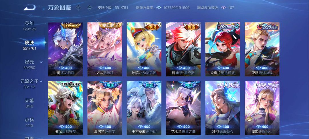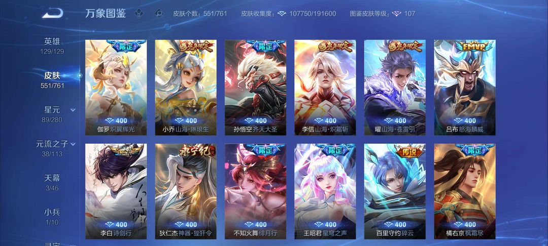 v10、12水555皮、死亡执政官、刘备星传说时之思念、小兵皮肤大耳狗甜茶、瑶无双真我赫兹、愿照·九州拓、怪盗基德、画中仙、至尊宝、凤求凰、神威、天魔缭乱