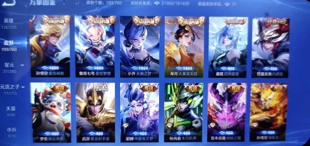 女生号 贵10 多皮肤多传说 别拿那些空号v10来比 要看性价比 貂蝉武则天夏侯惇孙悟空李白鲁班小乔荣耀水晶 妲己九尾无双皮肤 80个传说 473皮肤