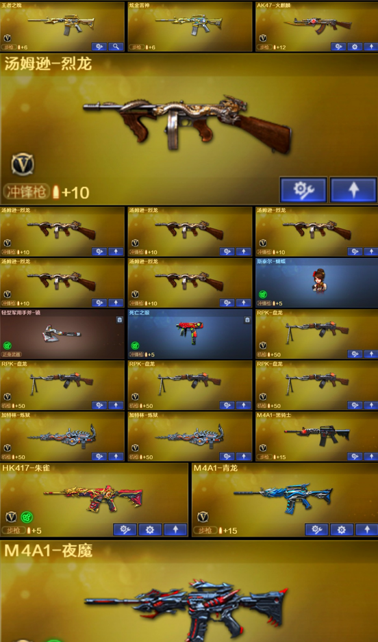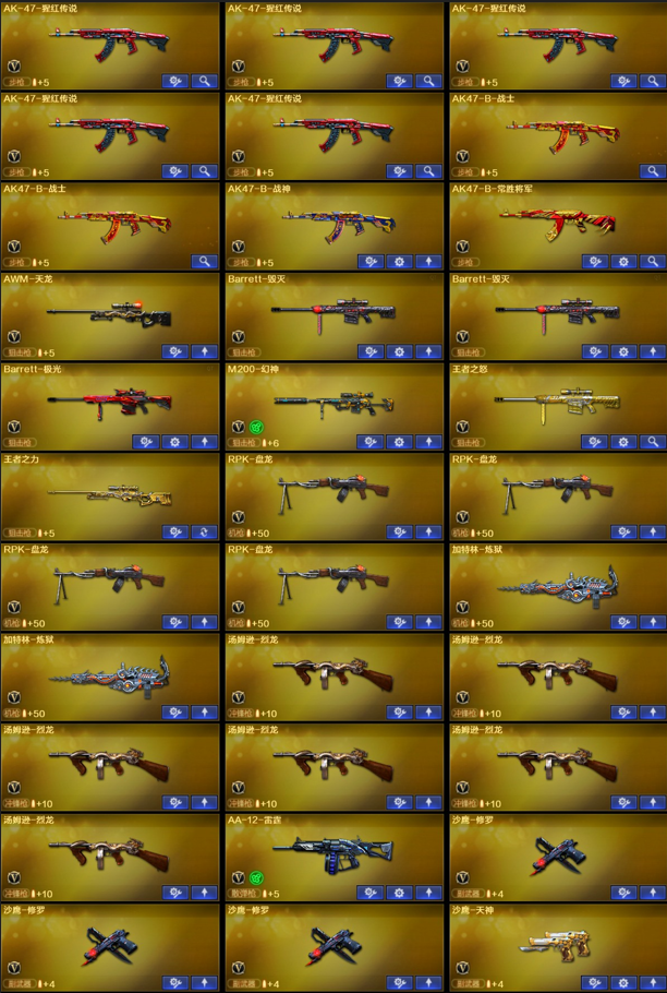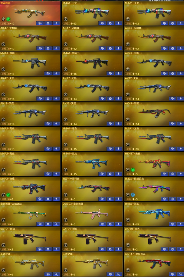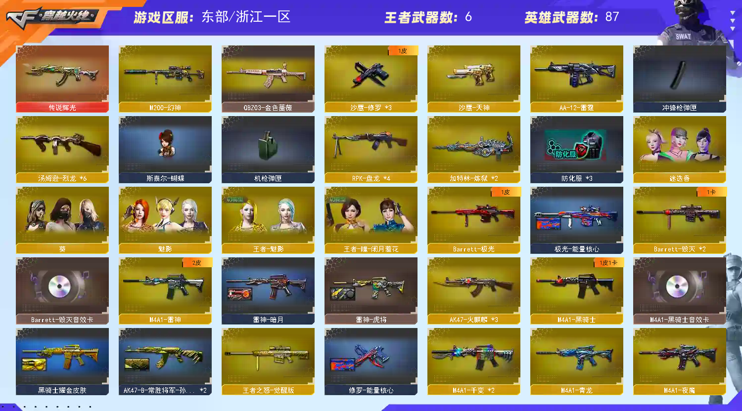 【稀有武器】:传说辉光/M200-幻神/M4A1-青龙/HK417-朱雀/M4A1-夜魔/修罗-古蛇迷踪/金色蔷薇-古蛇迷踪/QBZ03-金色蔷薇/AK47-火麒麟(3)/M4A1-雷神/M4A1-黑骑士/AK47-无影(3)/Barrett-毁灭(2)/Barrett-极光/RPK-盘龙(4)/加特林-炼狱(2)/汤姆逊-烈龙(6)/AA-12-雷霆/斩神刀-雷暴/马来剑-夜魔 【王者武器】:王者之魄-觉醒版/王者之怒-觉醒版/王者之力 【热门角色】:迷迭香/魅影/蛇隐宗/王者-魅影/职业选手/潘多拉 【热门音效卡】:Barrett-毁灭音效卡/M4A1-黑骑士音效卡 【其他亮点】:斯泰尔-蝴蝶;RPK-盘龙,QBZ03-金色蔷薇,M200-幻神,