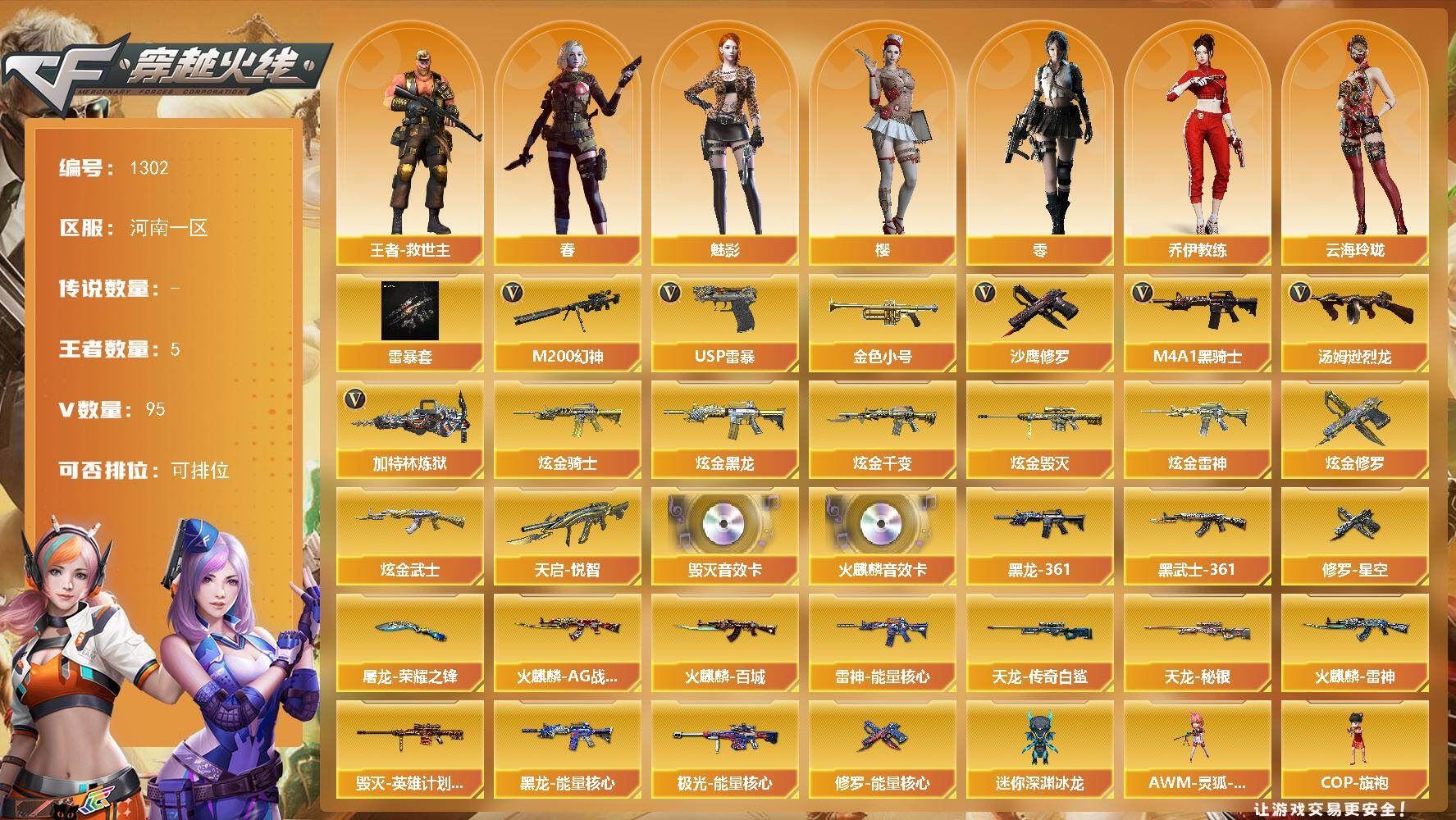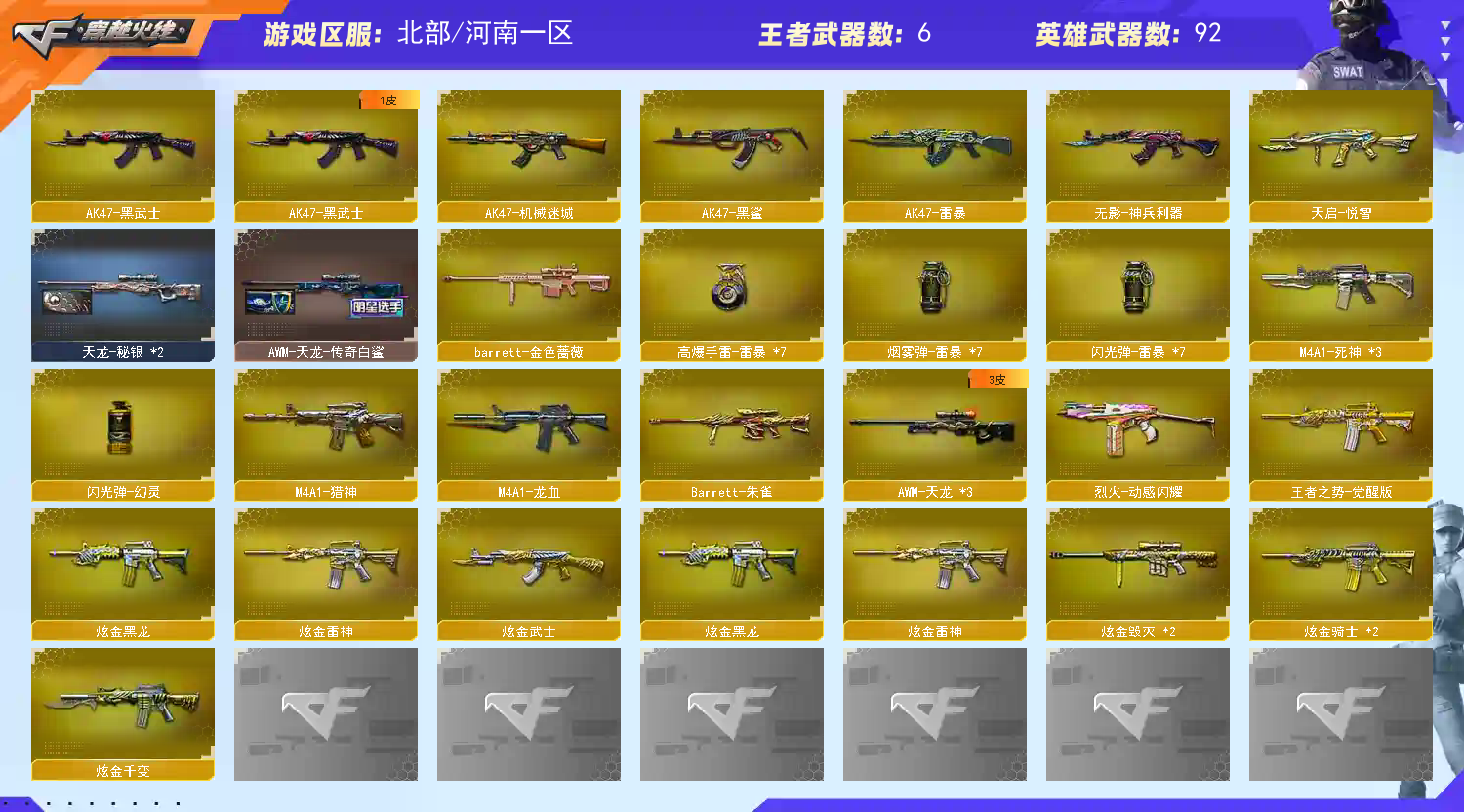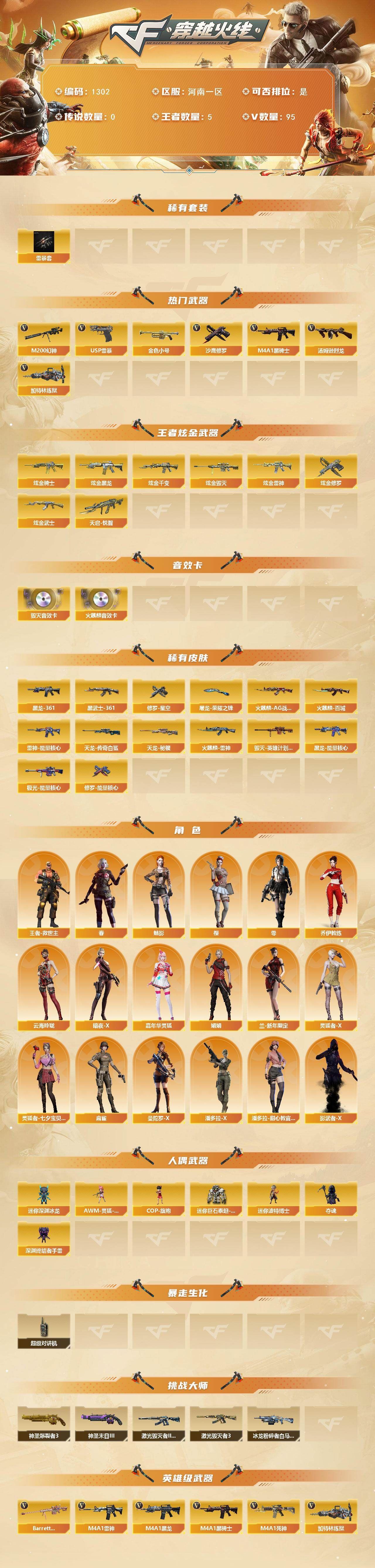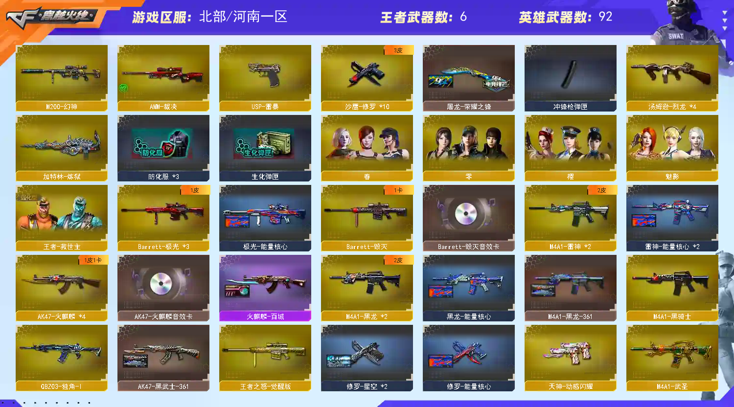 热门武器】:M200-幻神,金色小号,M4A1-黑骑士,汤姆逊-烈龙*4,加特林-炼狱,USP-雷暴,沙鹰-修罗*10【稀有套装】:雷暴套【王者炫金武器】:天启-悦智,炫金骑士*2,炫金黑龙,炫金千变,炫金雷神,炫金武士,炫金毁灭*2,炫金修罗【音效卡】:AK47-火麒麟音效卡,Barrett-毁灭音效卡【皮肤】:雷神-能量核心*2,火麒麟-AG战队皮肤,火麒麟-雷神,火麒麟-百城,毁灭-英雄计划 皮肤,黑龙-能量核心,M4A1-黑龙-361,AK47-黑武士-361,天龙-秘银*2,AWM-天龙-传奇白鲨,极光-能量核心,修罗-能量核心,修罗-星空*2,屠龙-荣耀之锋【角色】:零,樱,魅影,春,王者-救世主,乔伊教练,云海玲珑,暗夜-X,嘉年华灵狐,娟娟,兰-新年限定,灵狐者-X,灵狐者-七夕宝贝,麻雀,曼陀罗-X,潘多拉-X,潘多拉-甜心教官,影武者-X【人偶武器】:AWM-灵狐-15周年嘉年华,COP-旗袍,迷你深渊冰龙,迷你波特博士*2,夺魂*2,深渊终结者手雷*2,迷你巨石泰坦-魔花研究所【暴走生化】:超级对讲机【挑战大师】:神圣爆裂者III,冰龙粉碎者-白马银枪,激光毁灭者III-白马银枪,激光毁灭者III,神圣爆裂者-末日III【英雄级武器】:AK47-火麒麟*4,M4A1-黑龙*2,M4A1-雷神*2,M4A1-黑骑士,M4A1-死神*3,AK47-黑武士,M4A1-武圣,AK47-机械迷城,AK47-黑鲨,M4A1-龙血,AK47-雷暴,M4A1-猎神,烈火-动感闪耀,王者之势-觉醒版,AWM-天龙*3,Barrett-毁灭,Barrett-极光*3,AWM-裁决,M200-幻神,Barrett-朱雀,Barrett-金色蔷薇,王者之怒-觉醒版,加特林-炼狱,汤姆逊-烈龙*4,沙鹰-修罗*10,USP-雷暴,Glock18-武圣,天神-动感闪耀,屠龙*5,龙啸,擎天*2,麒麟刺*5,屠龙-动感闪耀,擎天-云海游龙,斩神刀-雷暴,王者之锋-觉醒版,王者之击-觉醒版,高爆手雷-雷暴*7,手雷-动感闪耀,手雷-云海游龙,闪光弹-雷暴*7,闪光弹-幻灵,烟雾弹-雷暴*7【道具】:全能枪王背包,炫彩背包,超级背包,黄金超能特工背包,绿色巨人,灵魂忍者,迷雾幽灵,夺命之镰*2,防化服*3,金色流光-枪王排位*2,星辰流光-枪王排位,枪王排位28赛季金色流光,语音特效-机器人,动感闪耀表情,云海游龙表情,C4-红龙,防弹头盔*4,防弹衣*4,C4工具钳*4,手雷包*4;USP-雷暴,M200-幻神,