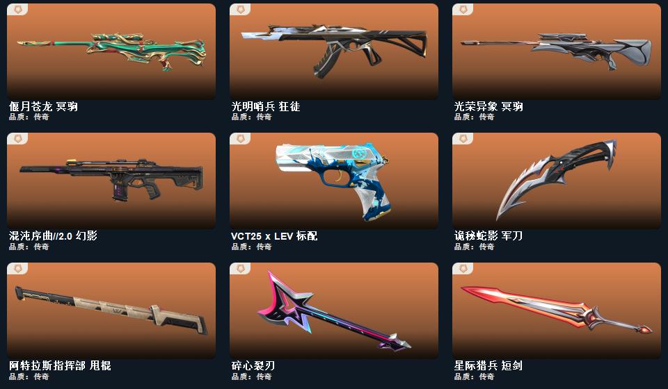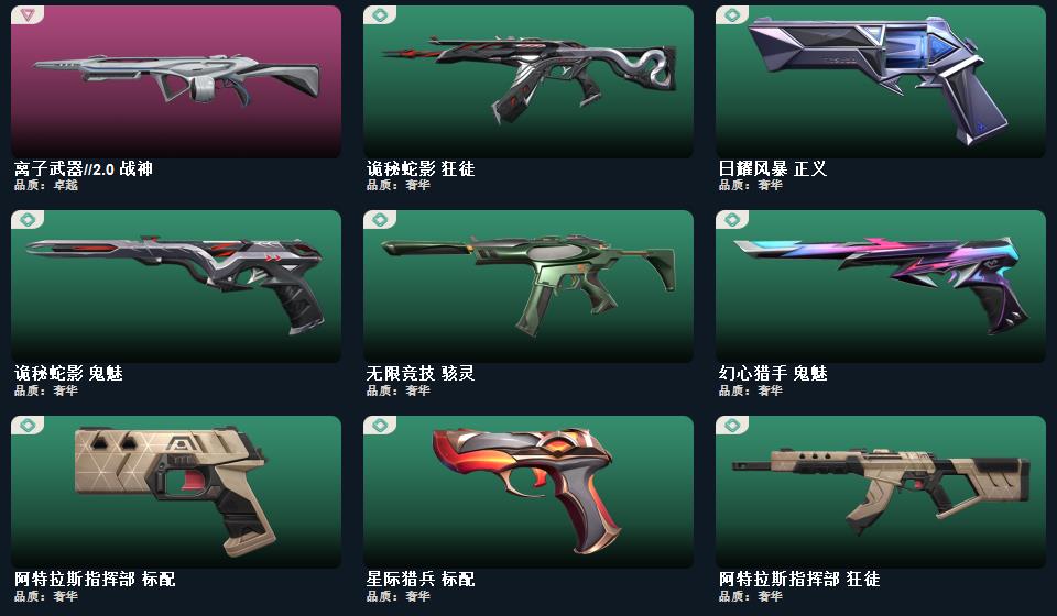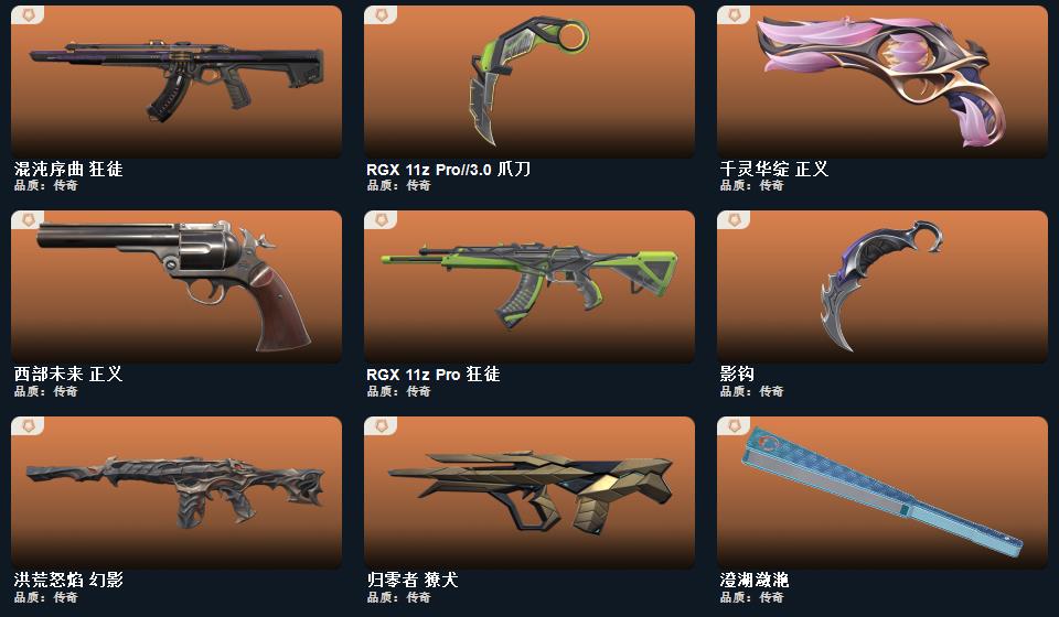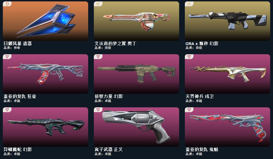 wegame无畏契约★碎心裂刃,星际猎兵 短剑,RGX 11z Pro//3.0 爪刀,阿特拉斯指挥部 甩棍,影钩,日耀风暴 遗器,诡秘蛇影 军刀,澄湖潋滟,梦魇恶魔 短炮,离子武器 正义,幻心猎手 鬼魅,诛心猎手 正义,甜心猎手 短炮,星际猎兵 标配,千灵华绽 正义,瑰梦艺语 鬼魅,光环序列 狂怒