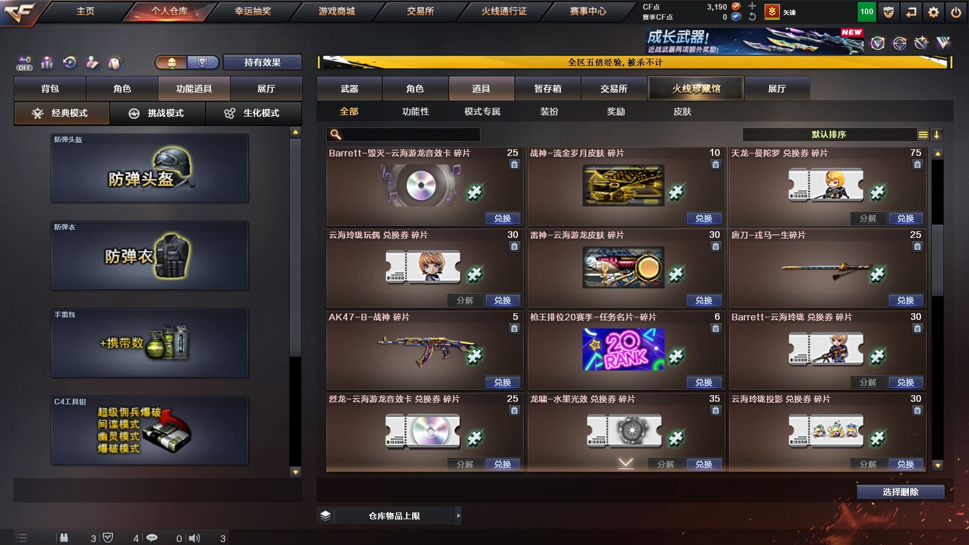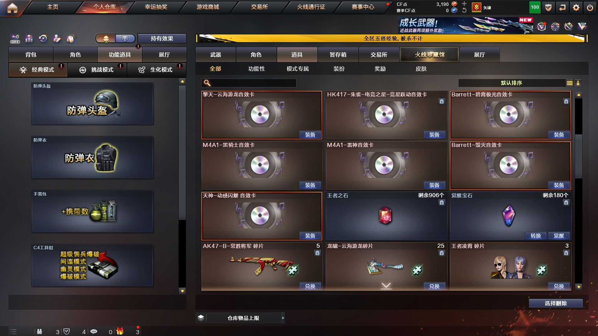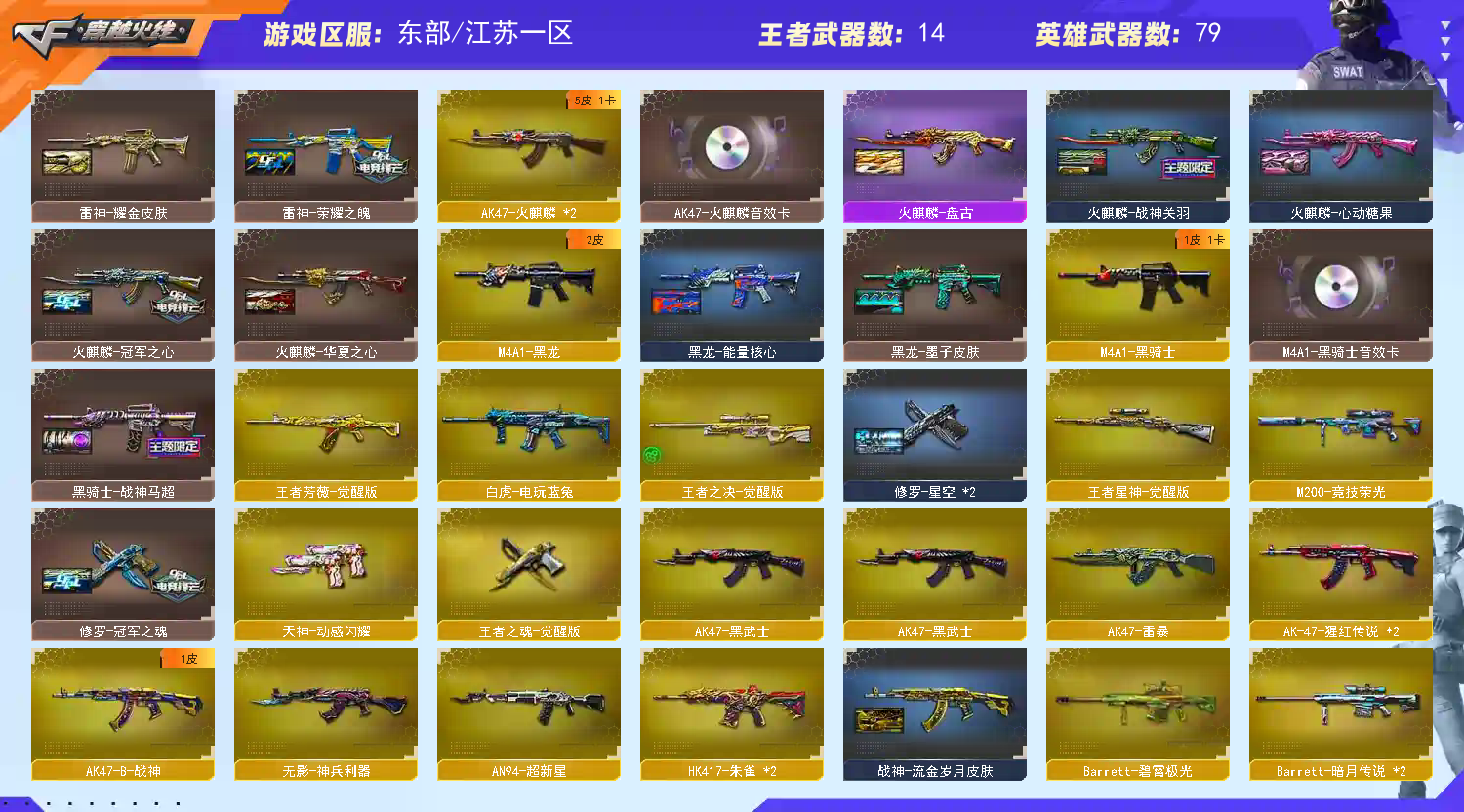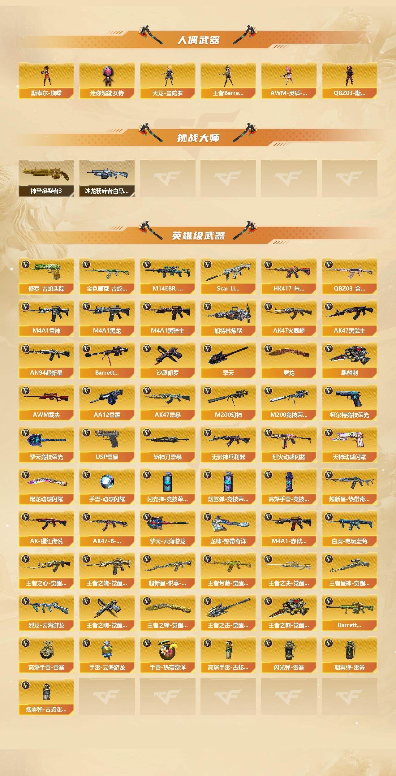 【传说武器】:传说辉光【热门武器】:传说辉光,QBZ03-金色蔷薇,M14EBR-玄武,Scar Light-白虎,HK417-朱雀*2,M200-幻神*2,金色蔷薇-古蛇迷踪,修罗-古蛇迷踪,M200-竞技荣光,白虎-电玩蓝兔,M4A1-黑骑士,加特林-炼狱,斯泰尔-蝴蝶,羊驼玩偶*2,USP-雷暴,沙鹰-修罗【王者炫金武器】:王者青龙,炫金雷神,炫金毁灭,炫金天龙【音效卡】:天神-动感闪耀 音效卡,擎天-云海游龙音效卡,AK47-火麒麟音效卡,M4A1-雷神音效卡,M4A1-黑骑士音效卡,Barrett-毁灭音效卡,HK417-朱雀音效卡,Barrett-碧霄极光音效卡【皮肤】:M200-幻神-黄忠皮肤,幻神-巅峰荣耀,白虎-电玩粉兔皮肤,金色蔷薇-电竞之星 皮肤,裁决-典雅胡桃 皮肤,雷神-荣耀之魄,雷神-耀金皮肤,M4A1-战神赵云,雷神-杨戬,雷神-航星皮肤,火麒麟-冠军之心,火麒麟-华夏之心,火麒麟-战神关羽,火麒麟-盘古,火麒麟-心动糖果,毁灭-荣耀之怒,毁灭-SV-CFPLS16冠军,毁灭-战神张飞,毁灭-风暴,毁灭-英雄计划 皮肤,M4A1-千变-孔明皮肤,黑龙-能量核心,黑龙-墨子皮肤,黑骑士-战神马超,无影耀金皮肤,超新星-深海萌鲨 皮肤,战神-流金岁月皮肤,AK47-B-常胜将军-孙权,修罗-星空*2,修罗-冠军之魂【角色】:葵,雨棠,鹰,王者-魅影,王者云悠悠,蛇隐宗,奇洋探员,乔伊教练,修道士,云海玲珑,初恋灵狐,风暴女,嘉年华灵狐,荆棘玫瑰,娟娟,兰-梨园特工,零-热舞青春,灵动武士,龙儿,潘多拉-X,潘多拉-甜心教官,蛇姬,斯沃特-X,新灵狐者,雪莉杨【人偶武器】:天龙-曼陀罗,王者Barrett-英勇金戈,斯泰尔-蝴蝶,AWM-灵狐-15周年嘉年华*2,迷你超能女侍,QBZ03-斯沃特【挑战大师】:神圣爆裂者III,冰龙粉碎者-白马银枪【英雄级武器】:AK47-火麒麟*2,M4A1-黑龙,M4A1-雷神*3,M4A1-黑骑士,AK47-黑武士,AN94-超新星,AK47-雷暴,HK417-朱雀*2,Scar Light-白虎,M14EBR-玄武,无影-神兵利器,超新星-热带奇洋,金色蔷薇-古蛇迷踪,QBZ03-金色蔷薇,烈火-动感闪耀,王者之心-觉醒版,王者之魄-觉醒版,超新星-悦享-觉醒版,AK-47-猩红传说*2,AK47-B-战神,白虎-电玩蓝兔,王者芳薇-觉醒版,Barrett-毁灭*2,AWM-裁决,M200-幻神*2,M200-竞技荣光,王者之决-觉醒版,王者星神-觉醒版,加特林-炼狱,烈龙-云海游龙,AA-12-雷霆,沙鹰-修罗,USP-雷暴,柯尔特-竞技荣光,王者之魂-觉醒版,天神-动感闪耀,修罗-古蛇迷踪,屠龙,擎天,麒麟刺,擎天-竞技荣光,屠龙-动感闪耀,擎天-云海游龙,龙啸-热带奇洋,斩神刀-雷暴,王者之锋-觉醒版,王者之击-觉醒版,王者之刺-觉醒版*2,高爆手雷-雷暴*5,高爆手雷-竞技荣光*6,手雷-动感闪耀,手雷-云海游龙,手雷-热带奇洋,高爆手雷-古蛇迷踪,闪光弹-雷暴*5,闪光弹-竞技荣光*2,烟雾弹-雷暴*5,烟雾弹-竞技荣光*2,烟雾弹-古蛇迷踪,M4A1-赤狱骑士,Barrett-碧霄极光【道具】:CFS限定背包,Q9战队炫彩背包,云海游龙炫彩背包,古蛇迷踪炫彩背包,奇洋探员-海龟背包,女皇终结者-背包,热带奇洋炫彩背包,超级背包,女皇终结者-魔龙之吻,绿色巨人,灵魂忍者,迷雾幽灵,夺命之镰,防化服*2,金色流光-枪王排位*2,星辰流光-枪王排位,巅峰赛先锋-金色流光,流光-鎏金之域,枪王排位28赛季金色流光,枪王排位29赛季金色流光,古蛇迷踪特效,蛇隐宗表情,电玩兔兔表情*2,热带奇洋表情,动感闪耀表情*2,云海游龙表情,EP战队名片,EP战队喷图,防弹头盔*2,防弹衣*2,C4工具钳*3,手雷包*3【特殊枪械】:蝴蝶斯泰尔+0烈龙,1白虎,1黑骑士,1炼狱,1蝴蝶斯泰尔;USP-雷暴,QBZ03-金色蔷薇,M200-幻神,Scar Light-白虎,