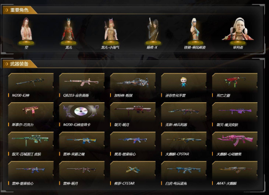 【广东一区/110V/vip1】【武圣套/6烈龙】【M200-幻神/M200-幻神音效卡】【QBZ03-金色蔷薇】【M4A1-雷神*4/雷神-荣耀之魄/雷神-暗月/雷神-能量核心】【Glock18-武圣】【Barrett-毁灭*2/毁灭-百城浙江 皮肤/毁灭-魔灵皮肤/毁灭-暗月】【AK47-火麒麟/火麒麟-CFSTAR*4/火麒麟-心动糖果】【M4A1-黑骑士*2/黑骑士-海王】【M4A1-黑龙*2/黑龙-能量核心】【AK47-无影/无影-神兵利器】【AK47-黑武士/黑武士-锦绣游龙】【AWM-天龙*2/天龙-CFSTAR*2/天龙-能量核心】【Barrett-极光】【AWM-裁决】【M4A1-死神/M4A1-千变】【汤姆逊-烈龙*6】【RPK-盘龙*3】【加特林-炼狱】【死亡之眼/迷你生化手雷*4】【沙鹰-修罗*5/修罗-CFSTAR*3】【沙鹰-天神*3/天神-动感闪耀】【麒麟刺】【擎天*2】【屠龙*5/屠龙-动感闪耀】【龙啸*3】【王者-瞳-闭月羞花/魅影/龙儿/龙儿-小淘气/暗夜-X/铁骑-乘风破浪/审判者/兰-海滩派对/幽/木兰/奇洋探员/乔伊教练/修道士/超能特工/零-水下丽影/兰-新年限定/麻雀/青霞仙子/灵狐者-黄金海岸/妲己/蜀雪/娟娟/潘多拉-X/斯沃特-X/救世主-X/影武者-X/铁骑荣耀/新娜塔莎/幻影/堕天使/复仇者】【M4A1-青龙/M4A1-龙血/M4A1-武圣】【白虎-电玩蓝兔*3/Scar Light-像素*2/AK47-B-常胜将军/AK47-B-身先士卒/AK47-B-战士*2/AK47-B-战神*2/AK-47-猩红传说*9】【AA-12-雷霆/AK47-黑鲨/AK12-天启】【AN94-超新星*2/超新星-热带奇洋】【Barrett-朱雀/Barrett-暗月传说*2】【Colt1911-小故障*3/Colt 1911-大黄蜂/柯尔特-萌杀/新USP-枪王排位奖励*5】【龙啸-热带奇洋/斩魔刀/斩神刀/金刚伞-电玩红兔】【神圣爆裂者III/神圣爆裂者-末日III*3/KAC-圣炎切割者III/激光毁灭者III*4/冰龙粉碎者-白马银枪/巨龙咆哮-深渊金/征服者】【斯泰尔-巧克力】【猫猫手套*2/Cat-刀锋/M4A1-雷神-精英刀锋*2/M37-葵/迷你裂空之翼/夺魂/金色小号】【王者青龙/王者之心/王者之刺/王者之魄/王者之势/王者之锋/王者之击/王者之啸/王者之武】【烟雾弹-云龙】【高爆手雷-雷霆王者/闪光弹-雷霆王者】【烟雾弹-幻灵】【手雷-热带奇洋】【炫金黑龙/炫金骑士】【透明头盔/透明护目镜/烟雾保护头盔/闪光护目镜*2/超级对讲机/超级背包/炫彩背包/防弹头盔*6/防弹衣*5/C4工具钳*5/手雷包*4/防化服*4】;RPK-盘龙,QBZ03-金色蔷薇,M200-幻神,
