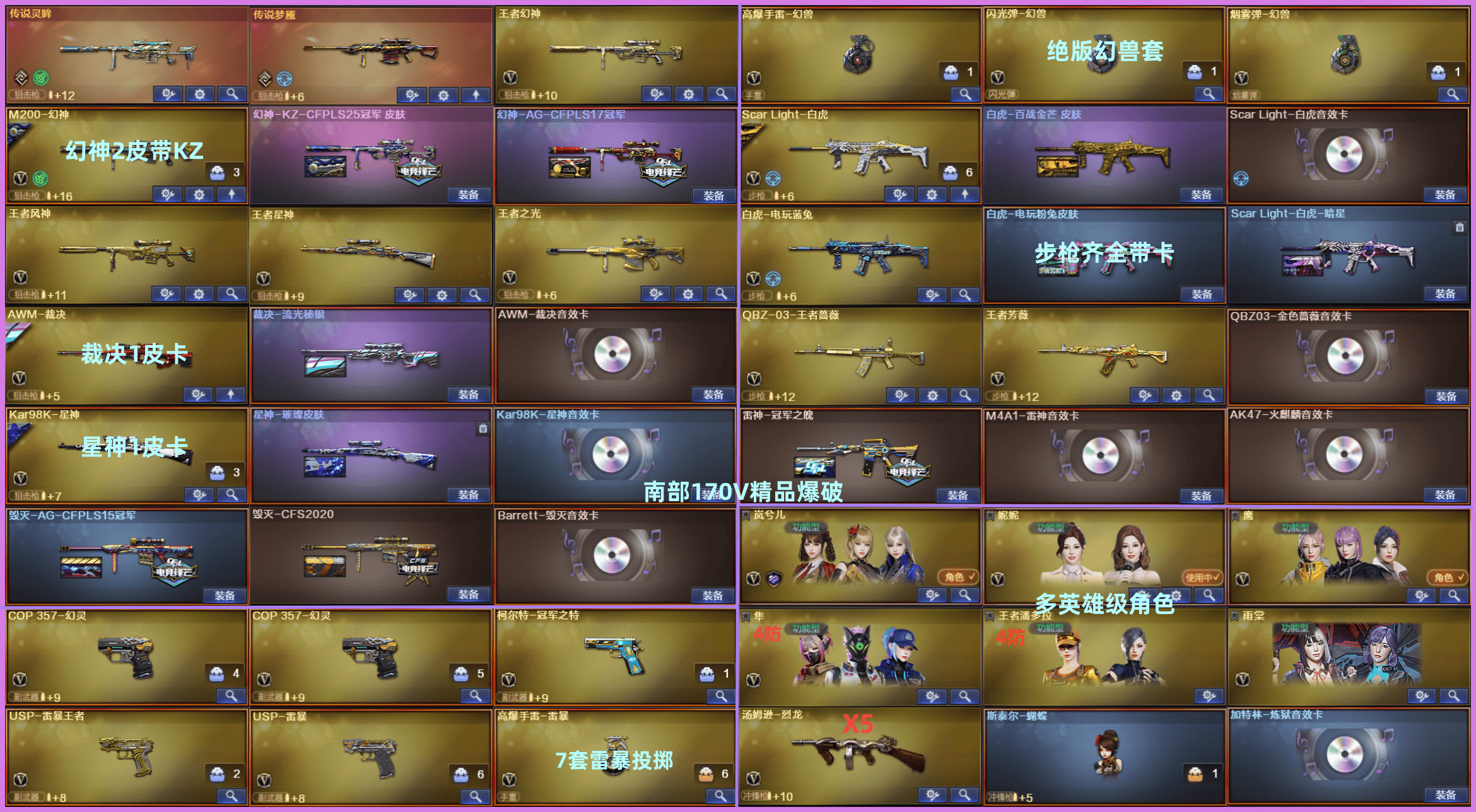 !!!!!!!!!!!!!!!!!!!! 租客必看: 【禁止使用鼠标宏,DMA,外挂进行游戏,造成损失后果自负!!!】 【订单时间快到了禁止再开排位赛,导致账号禁赛的租客将被永久拉黑!】 !!!!!!!!!!!!!!!!!!!! ① 南部 【爆破精品全套】号: ✅爆破: ✨传说武器 传说灵眸 | 传说梦魇 ✨绝版幻兽套 | 7套雷暴投掷物 ✨英雄级角色 4防隼 | 4防王者潘多拉 | 岚兮儿 | 妮妮 | 鹰 | 雨棠 | 王者零-华冠丽服 | 王者樱-热浪之夏 ✨幻神2皮 | 幻神-KZ-CFPLS25冠军 | 幻神-AG-CFPLS17冠军 ✨星神1皮卡 | 星神-璀璨 | 星神音效卡 ✨裁决1皮卡 | 裁决-流光秘银 | 裁决音效卡 ✨白虎3皮卡 | 白虎-百战金芒 | 白虎-暗星 | 白虎-电玩粉兔 | 白虎音效卡 | 白虎-电玩蓝兔 ✨金色蔷薇带卡 | 金色蔷薇音效卡 | QBZ03-王者蔷薇 | 王者芳薇 ✨雷神 | 雷神-冠军之魄 | 雷神音效卡 ✨火麒麟 | 火麒麟-冠军之心 | 火麒麟音效卡 ✨5质量副武器: 1)柯尔特*1 = 柯尔特-冠军之特 2)USP*2 = USP雷暴王者 | USP雷暴 3)COP*2 = COP幻灵*2 ✨5烈龙 | 斯泰尔蝴蝶 | 炼狱音效卡 ② 有什么问题请填写真实理由【不要无故撤单】否则拉黑,本店将拉黑【恶意撤单/排位离线】的不文明租客;