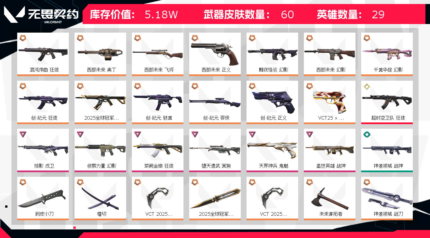 25冠军套混沌紫金5ak⭐VCT爪刀2026篆刀⭐西部未来套⭐创纪元套⭐幻影暗夜侦察⭐戍卫掠影