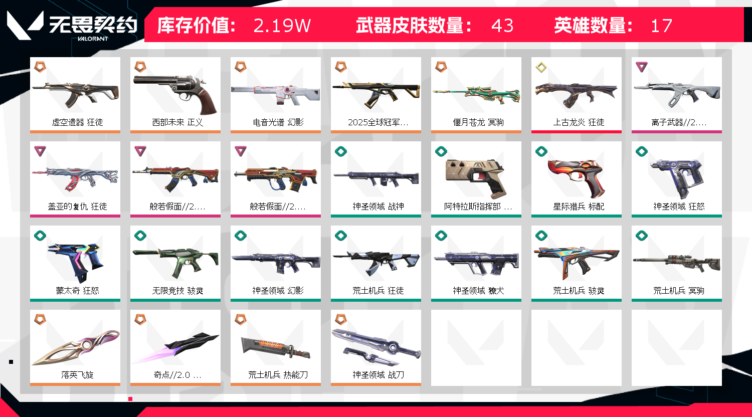 冻结三分钟内解除,短信通知重新上即可!喜欢收藏不迷路、游戏异常进小黑屋、时间不够请提前续租或者不要开局【英雄】:幻棱,炼狱,暮蝶,钛狐,壹决,捷风,雷兹,幽影,不死鸟,贤者,猎枭,霓虹,夜露,钢锁 【近战武器】:近战武器-奇点//2.0 蝴蝶刀,近战武器-落英飞旋,近战武器-荒土机兵 热能刀,近战武器-神圣领域 战刀 【狂徒】:狂徒-上古龙炎,狂徒-2025全球冠军赛,狂徒-虚空遗器,狂徒-般若假面//2.0,狂徒-盖亚的复仇,狂徒-离子武器//2.0,狂徒-荒土机兵 【幻影】:幻影-电音光谱,幻影-神圣领域,幻影-纳米击,幻影-电音光谱 【戍卫】:戍卫-逆冲蛮牛,戍卫-月球哨兵 【獠犬】:獠犬-般若假面//2.0,獠犬-神圣领域,獠犬-逆冲蛮牛 【冥驹】:冥驹-偃月苍龙,冥驹-荒土机兵,冥驹-星云暗涌 【莽侠】:莽侠-月球哨兵 【战神】:战神-神圣领域 【奥丁】:奥丁-纳米击 【判官】:判官-纳米击x 【雄鹿】:雄鹿-逆冲蛮牛,雄鹿-月球哨兵 【骇灵】:骇灵-荒土机兵,骇灵-无限竞技,骇灵-星云暗涌 【蜂刺】:蜂刺-星云暗涌 【标配】:标配-荒土机兵 【正义】:正义-西部未来,正义-纳米击,正义-月球哨兵 【鬼魅】:鬼魅-诡秘蛇影,鬼魅-星云暗涌 【狂怒】:狂怒-神圣领域,狂怒-逆冲蛮牛 【卡面】:终章:激斗汉堡 卡面,进入射程 卡面,分崩离析 卡面,纳米击 卡面,抑制技术 卡面,激斗汉堡 卡面,瓦娃雪糕 P2 卡面,从黄昏到黎明 卡面,荒土机兵 卡面,银弹猎手 卡面,逆冲蛮牛 卡面,《双城之战》拥抱 卡面,精灵大战 卡面,欢迎来到底城 卡面,南瓜盛典 卡面,Clutch 卡面,聚合之力 卡面,无畏契约GO!一卷:芮娜 卡面,无畏契约GO!一卷:零 卡面,战术小伙伴 卡面,无畏契约GO!一卷:贤者 卡面,萌彩剪影 卡面,代号红色 卡面,新兵报到 卡面,V契约 卡面,无畏契约 卡面 【喷漆】:小小心意 喷漆,战“素”兔 喷漆,宇宙的指引 喷漆,请求重启 喷漆,逆冲蛮牛 喷漆,纳米击 喷漆,鼻尖上的蝴蝶 喷漆,简笔画黯兽 喷漆,独守蝰腹 喷漆,他们将落荒而逃 喷漆,通缉:战术鹅 喷漆,荒土机兵 喷漆,别挡我吃球! 喷漆,嗨宝南瓜灯 喷漆,嘭! 喷漆,都算到了 喷漆,控场勿近 喷漆,霓光四射 喷漆,买装还是存钱 喷漆,无畏契约GO!一卷:贤者 喷漆,胜利属于无畏契约 喷漆,GLHF 喷漆,无畏契约 喷漆 【挂饰】:终章:猫猫木乃伊 挂饰,荒土机兵 挂饰,悠闲鸡块 挂饰,猫猫木乃伊 挂饰,水壶 挂饰,纳米击 挂饰,逆冲蛮牛 挂饰,可爱糖糖 挂饰,伞绳 挂饰,《双城之战》小蛋糕 挂饰,第九季//第三幕 纪念币 挂饰,Z世代特饮 挂饰,传世莲华 挂饰,天外飞客 挂饰,《双城之战》魄罗 挂饰,海豹的认可 挂饰,无畏契约 纪念币 挂饰;盖亚的复仇 狂徒,虚空遗器 狂徒,离子武器//2.0 狂徒,西部未来 正义,