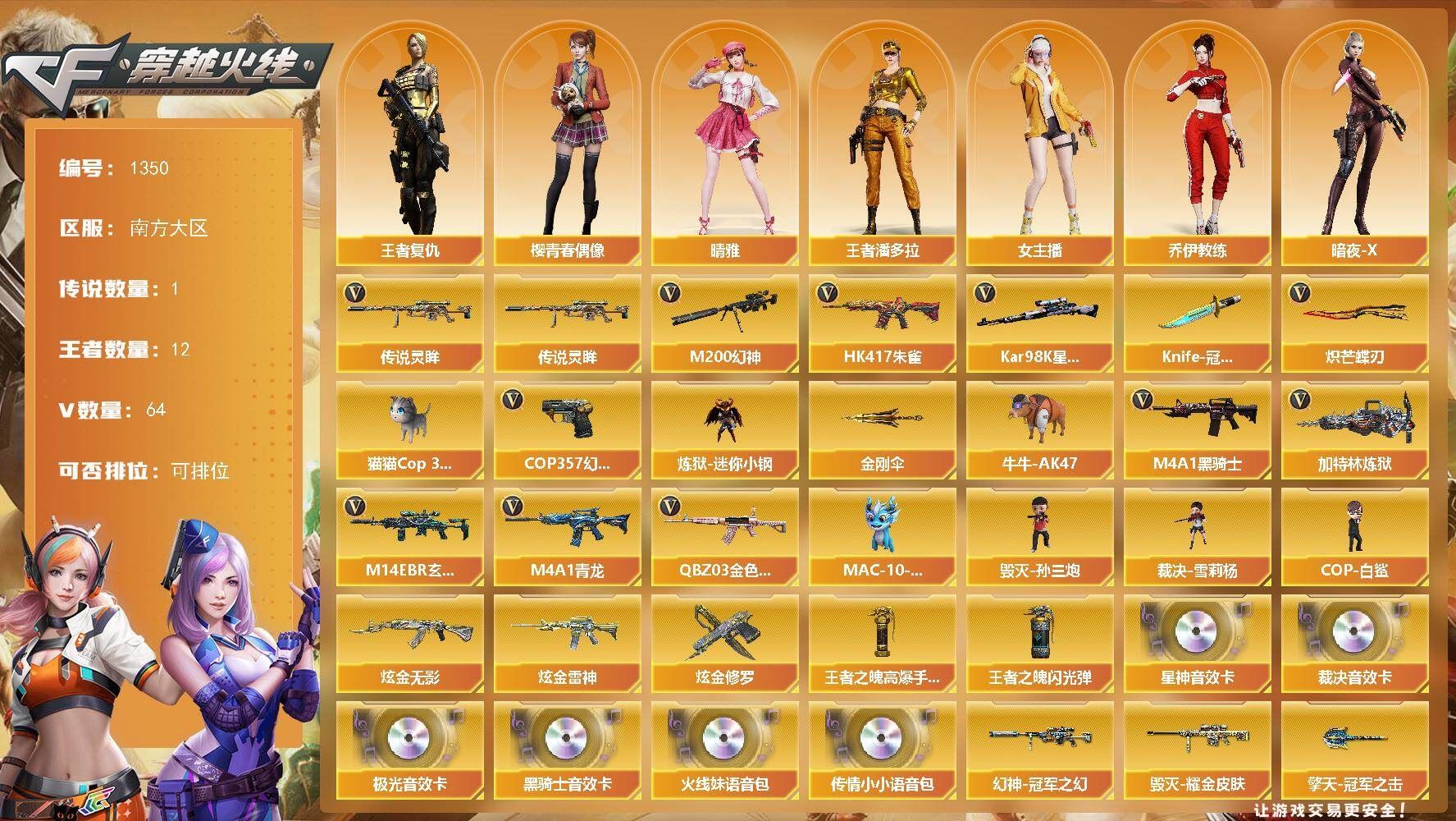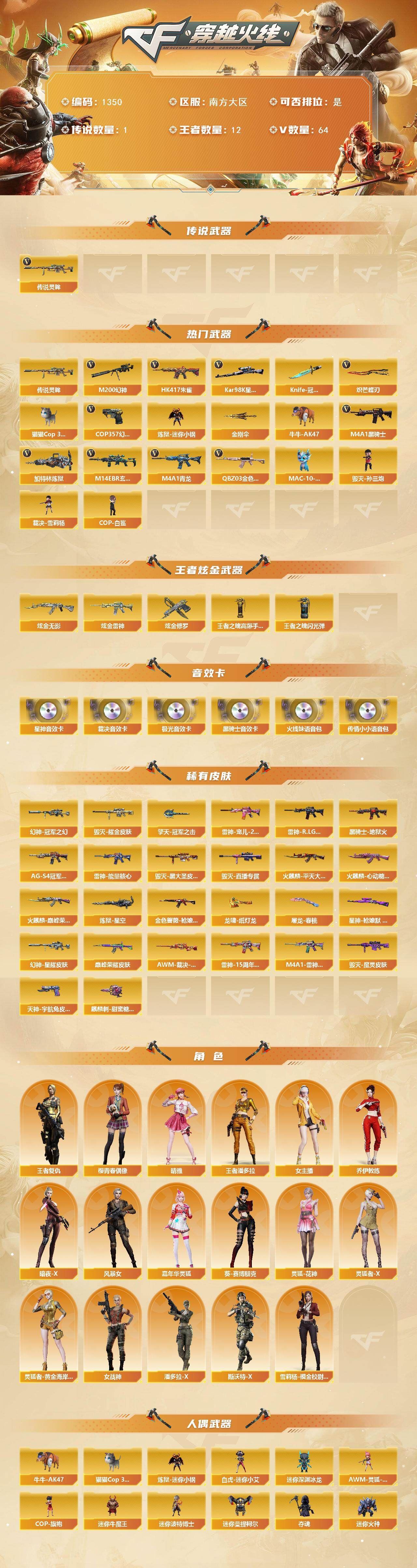 传说武器】:传说灵眸【热门武器】:传说灵眸,QBZ03-金色蔷薇,M14EBR-玄武,HK417-朱雀,M4A1-青龙,M200-幻神,Kar98K-星神,炼狱-迷你小钢,牛牛-AK47,M4A1-黑骑士*2,加特林-炼狱*3,猫猫Cop 357,MAC-10-龙宝,毁灭-孙三炮,裁决-雪莉杨,COP-白鲨,COP 357-幻灵,Knife-冠军之刃,炽芒蝶刃,金刚伞【王者炫金武器】:炫金无影,炫金雷神,炫金修罗,王者之魄高爆手雷*2,王者之魄闪光弹*3【音效卡】:M4A1-黑骑士音效卡,Barrett-极光音效卡,AWM-裁决音效卡,Kar98K-星神音效卡,火线妹语音包,传情小小语音包【皮肤】:幻神-冠军之幻,幻神-星耀 皮肤,金色蔷薇-枪娘阿敏 皮肤*2,QBZ03-巅峰荣耀皮肤,AWM-裁决-凤灵皮肤,星神-枪娘默 皮肤,雷神-能量核心,雷神-宠儿-2019MVP,雷神-R.LGD-CFPLS18冠军,雷神-15周年嘉年华 皮肤,M4A1-雷神-巅峰荣耀皮肤,火麒麟-平天大圣,火麒麟-巅峰荣耀,火麒麟-心动糖果,毁灭耀金皮肤,毁灭-黑大圣皮肤*2,毁灭-魔灵皮肤,毁灭-直播专属,黑骑士-地狱火,黑骑士-AG-S4冠军典藏,炼狱-星空,天神-宇航兔皮肤,屠龙-春桃 皮肤,龙啸-纸灯龙皮肤,擎天-冠军之击,麒麟刺-甜蜜糖果 皮肤【角色】:晴雅四防,王者复仇,王者潘多拉四防,乔伊教练,暗夜-X,风暴女,嘉年华灵狐,葵-赛博朋克四防,灵狐-花神,灵狐者-X,灵狐者-黄金海岸,女战神,女主播,潘多拉-X,斯沃特-X,雪莉杨-摸金校尉,樱-青春偶像四防【人偶武器】:COP-白鲨,毁灭-孙三炮,裁决-雪莉杨,白虎-迷你小艾,炼狱-迷你小钢,MAC-10-龙宝,AWM-灵狐-15周年嘉年华,COP-旗袍,牛牛-AK47,猫猫Cop 357,迷你深渊冰龙,迷你牛魔王,迷你波特博士,迷你曼提柯尔,夺魂,迷你火种,迷你生化手雷*2,迷你深渊冰龙-王绿豆,QBZ03-斯沃特,灵狐娃娃手雷【暴走生化】:超级对讲机【挑战大师】:冰龙粉碎者-白马银枪,激光毁灭者III-白马银枪,试炼破坏者III,神圣爆裂者-末日III【英雄级武器】:M4A1-千变,AK47-火麒麟*2,M4A1-雷神,M4A1-黑骑士*2,AK47-黑武士,AK12-天启,AN94-超新星,AK47-机械迷城,AK47-黑鲨,M4A1-龙血,M4A1-青龙,HK417-朱雀,M14EBR-玄武,QBZ03-天罚,无影-神兵利器,QBZ03-金色蔷薇,王者之心-觉醒版,QBZ-03-王者蔷薇-觉醒版,白虎之魄-觉醒版,王者猎神-觉醒版,AWM-天龙,Barrett-毁灭,AWM-裁决,M200-幻神,Kar98K-星神,王者之怒-觉醒版,王者之光-觉醒版,王者风神-觉醒版,加特林-炼狱*3,AA-12-雷霆,沙鹰-天神,COP 357-幻灵,USP-神工天巧*2,屠龙*2,龙啸*2,擎天,麒麟刺*3,幻灵之锋,炽芒蝶刃,唐刀-神工天巧,高爆手雷-幻灵,高爆手雷-神工天巧*7,闪光弹-神工天巧*6,烟雾弹-神工天巧*6【道具】:炫彩背包,黄金超能特工背包,女皇终结者-魔龙之吻,妩媚妖姬,绿色巨人,灵魂忍者,变异宝贝,迷雾幽灵*2,生化弹匣,夺命之镰,防化服*2,金色流光-枪王排位*2,星辰流光-枪王排位,枪王排位29赛季金色流光,C4-高无钳,C4-红龙,防弹头盔*3,防弹衣*3,C4工具钳*3,手雷包*3【特殊枪械】:2黑骑士,3炼狱,;炽芒蝶刃,Knife-冠军之刃,晴雅,QBZ03-金色蔷薇,M200-幻神,传说灵眸,Kar98K-星神,