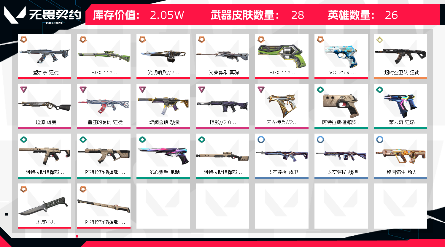 允许 英雄21 武器皮肤数量26;剥皮小刀,起源 雄鹿,盖亚的复仇 狂徒,塑水宗 狂徒,紫阙金琅 骇灵,RGX 11z Pro//3.0 莽侠,