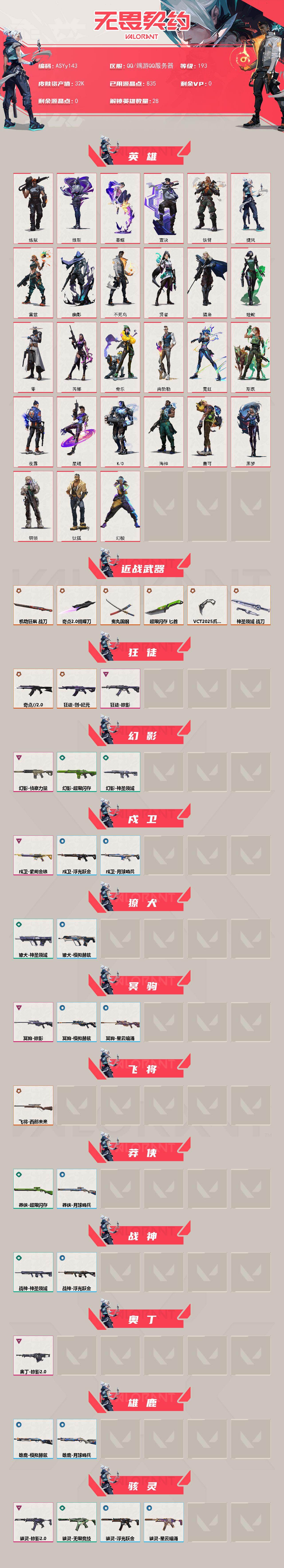 冻结三分钟内解除,短信通知重新上即可!喜欢收藏不迷路、游戏异常进小黑屋、时间不够请提前续租或者不要开局 【套装】:VCT 2025 赛季套装,奇点//2.0套装 【英雄】:幻棱,炼狱,维斯,暮蝶,钛狐,壹决,铁臂,捷风,雷兹,幽影,不死鸟,贤者,猎枭,蝰蛇,零,芮娜,奇乐,尚勃勒,霓虹,斯凯,夜露,星礈,K/O,海神,盖可,黑梦,钢锁 【近战武器】:近战武器-奇点//2.0 蝴蝶刀,近战武器-VCT 2025 爪刀,近战武器-鬼丸国纲,近战武器-超限闪存 匕首,近战武器-机动狂飙 战刀,近战武器-神圣领域 战刀 【狂徒】:狂徒-奇点//2.0,狂徒-创·纪元,狂徒-掠影 【幻影】:幻影-侦察力量,幻影-超限闪存,幻影-神圣领域 【戍卫】:戍卫-紫阙金琅,戍卫-浮光跃金,戍卫-月球哨兵 【獠犬】:獠犬-神圣领域,獠犬-模拟赫兹 【冥驹】:冥驹-掠影,冥驹-模拟赫兹,冥驹-星云暗涌 【飞将】:飞将-西部未来 【莽侠】:莽侠-超限闪存,莽侠-月球哨兵 【战神】:战神-神圣领域,战神-浮光跃金 【奥丁】:奥丁-掠影//2.0 【雄鹿】:雄鹿-模拟赫兹,雄鹿-月球哨兵 【骇灵】:骇灵-掠影//2.0,骇灵-无限竞技,骇灵-浮光跃金,骇灵-星云暗涌 【蜂刺】:蜂刺-超限闪存,蜂刺-星云暗涌 【标配】:标配-浮光跃金 【VCT手枪】:标配-VCT25 x BLG 【正义】:正义-西部未来,正义-离子武器,正义-超限闪存,正义-纳米击,正义-月球哨兵 【鬼魅】:鬼魅-奇点//2.0,鬼魅-模拟赫兹,鬼魅-星云暗涌 【狂怒】:狂怒-神圣领域 【卡面】:终章:激斗汉堡 卡面,进入射程 卡面,逆冲蛮牛 卡面,《双城之战》拥抱 卡面,精灵大战 卡面,欢迎来到底城 卡面,南瓜盛典 卡面,唱片的故事 卡面,钢弓与箭弦 卡面,排除故障 卡面,奇点//2.0 卡面,战术桌游 卡面,悠享食光 卡面,修车达人 卡面,热舞环节 卡面,模拟赫兹 卡面,浮光跃金 卡面,超限闪存 卡面,维斯工牌 卡面,正义的化身 卡面,树懒大作战 卡面,红鳞松叶 卡面,Clutch 卡面,采蜜小蜂队 卡面,梦幻奶茶 卡面,源能反应 卡面,零点嗅探设计图 卡面,无畏契约GO!第卷:芮娜 卡面,盖可工牌 卡面,无畏契约GO!第卷:零 卡面,无垠星环 卡面,《双城之战》金克丝 卡面,蝰蛇vs幽影 卡面,无畏契约GO!第卷:贤者 卡面,钢锁vs盖可 卡面,别冒尖 卡面,代号红色 卡面,新兵报到 卡面,V契约 卡面,无畏契约 卡面 【喷漆】:嗨宝南瓜灯 喷漆,啊? 喷漆,嘭! 喷漆,都算到了 喷漆,通缉:战术熊 喷漆,控场勿近 喷漆,皮蛋呼呼 喷漆,像素星礈 喷漆,图谋不轨的零 喷漆,伤心心 喷漆,小丑猫 喷漆,模拟赫兹 喷漆,高丽风情小熊 喷漆,奇点//2.0 喷漆,蹲到一个 喷漆,全力集中 喷漆,超限闪存 喷漆,RUA一下 喷漆,熊抱 喷漆,蛋糕还是爆能器? 喷漆,高丽风情小虎 喷漆,记在小本本 喷漆,防弹鹅 喷漆,高丽风情小蛙 喷漆,五人成星 喷漆,审判之爪 喷漆,拼一枪 喷漆,我的刀呢? 喷漆,霓光四射 喷漆,买装还是存钱 喷漆,无畏契约GO!第卷:零 喷漆,无畏契约GO!第卷:贤者 喷漆,松叶 喷漆,无畏契约GO!第卷:奇乐 喷漆,辣得好下饭 喷漆,胜利属于无畏契约 喷漆,GLHF 喷漆,无畏契约 喷漆 【挂饰】:终章:猫猫木乃伊 挂饰,悠闲鸡块 挂饰,伞绳 挂饰,《双城之战》小蛋糕 挂饰,第九季//第三幕 纪念币 挂饰,拳击战术熊 挂饰,工具腰带 挂饰,无畏契约GO!一卷 芮娜 挂饰,无畏契约GO!一卷 零 挂饰,暗藏猫腻 挂饰,高丽风情 挂饰,奇点//2.0 挂饰,熔岩灯 挂饰,超限闪存 挂饰,瞬云履 挂饰,迷你K/O 挂饰,模拟赫兹 挂饰,第九季//第二幕 纪念币 挂饰,薰衣草之心 挂饰,第九季//一幕 纪念币 挂饰,荧光棒 挂饰,第八季//第三幕 纪念币 挂饰,天外飞客 挂饰,红鳞松叶 挂饰,《双城之战》魄罗 挂饰,海豹的认可 挂饰,无畏契约 纪念币 挂饰;VCT 2025 爪刀,掠影 狂徒,侦察力量 幻影,西部未来 飞将,西部未来 正义,离子武器 正义,