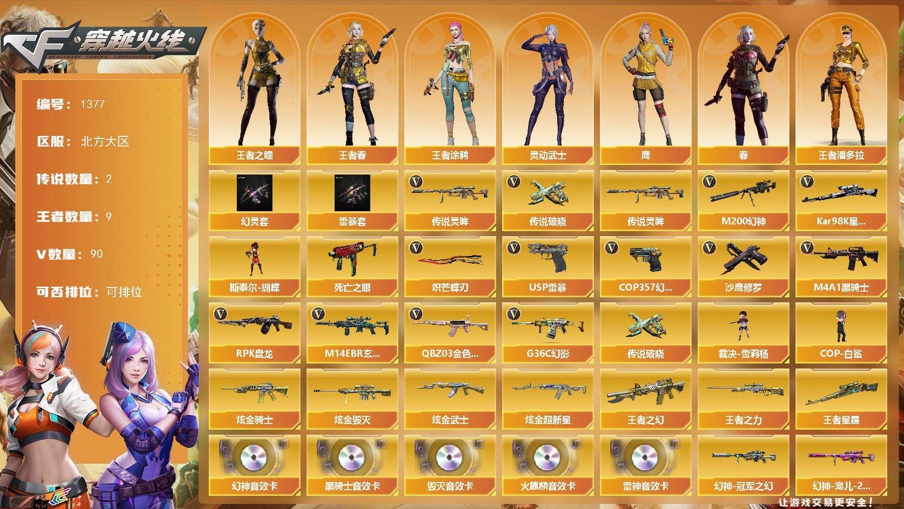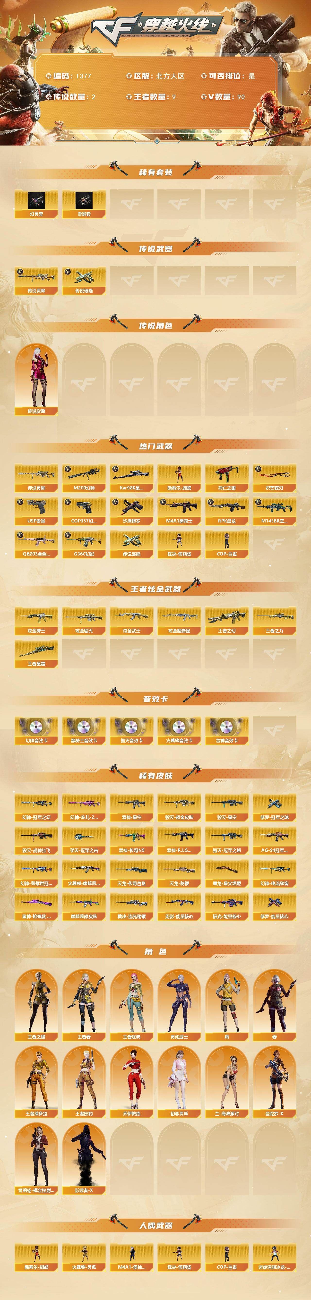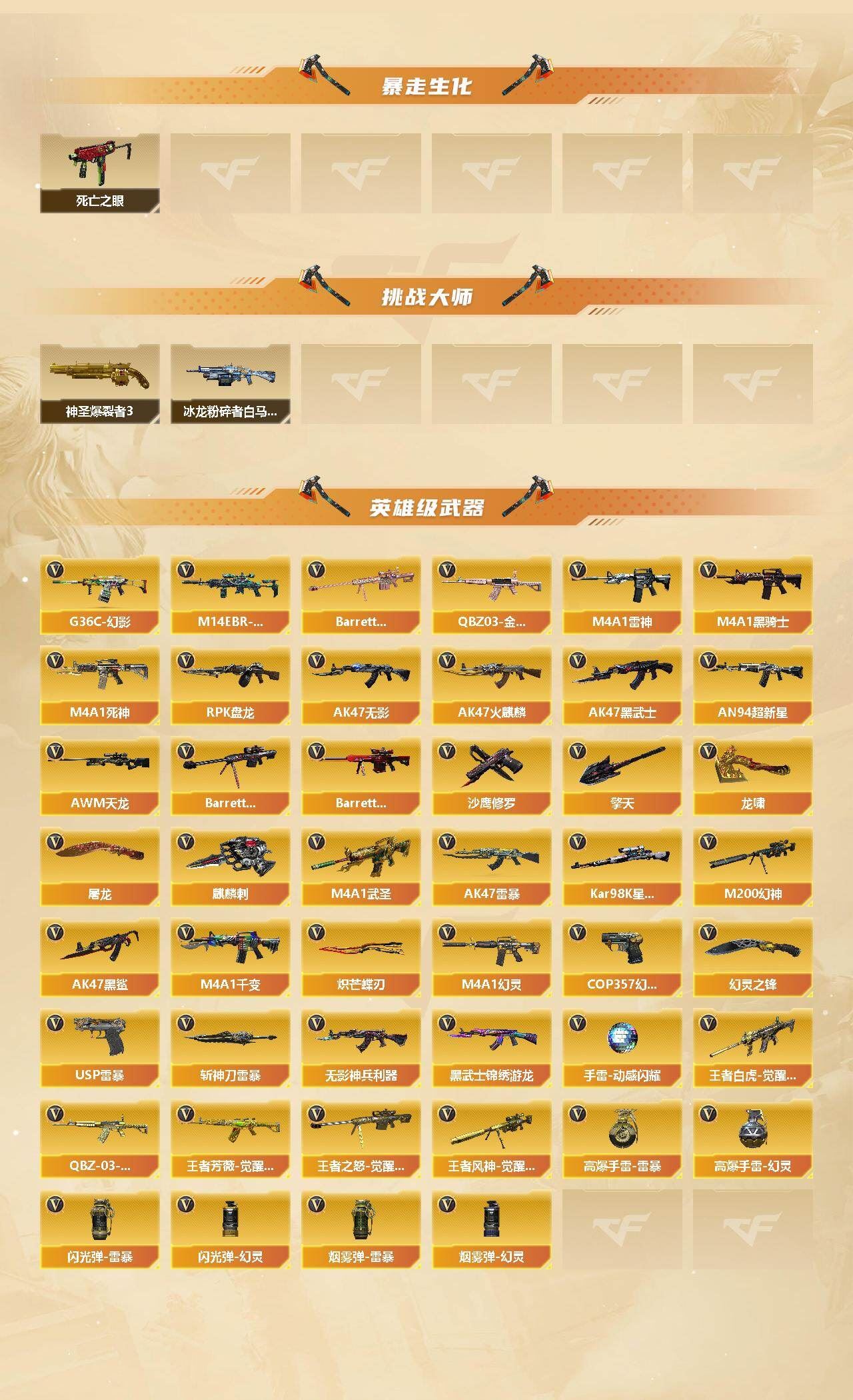 【传说武器】:传说灵眸,传说破晓【传说角色】:传说影煞【热门武器】:传说灵眸,传说破晓,M200-幻神,死亡之眼,Kar98K-星神,G36C-幻影,QBZ03-金色蔷薇,M14EBR-玄武,M4A1-黑骑士,RPK-盘龙*4,斯泰尔-蝴蝶,裁决-雪莉杨,COP-白鲨,USP-雷暴,COP 357-幻灵*3,沙鹰-修罗*3,炽芒蝶刃*3【稀有套装】:雷暴套,幻灵套【王者炫金武器】:王者之幻,王者之力*2,王者星霆,炫金骑士,炫金武士,炫金超新星,炫金毁灭【音效卡】:M200-幻神音效卡,AK47-火麒麟音效卡,M4A1-雷神音效卡,M4A1-黑骑士音效卡,Barrett-毁灭音效卡【皮肤】:幻神-冠军之幻,幻神-宠儿-2021MVP,M200-幻神-荣耀世冠白鲨,幻神-电流骇客 皮肤,QBZ03-巅峰荣耀皮肤,裁决-流光秘银,星神-枪娘默 皮肤,雷神-星空*2,雷神-传奇N9,雷神-R.LGD-CFPLS18冠军,火麒麟-巅峰荣耀,毁灭耀金皮肤,毁灭-星空,毁灭-冠军之怒,毁灭-战神张飞,黑骑士-AG-S4冠军典藏,无影-能量核心,天龙-秘银,AWM-天龙-传奇白鲨,极光-能量核心,修罗-能量核心,修罗-冠军之魂,屠龙-星火燎原*2,擎天-冠军之击【角色】:春,四防鹰,王者之瞳,四防王者春,王者涂鸦,四防王者影豹,四防王者潘多拉,乔伊教练,初恋灵狐,兰-海滩派对,灵动武士,曼陀罗-X,雪莉杨-摸金校尉,影武者-X【人偶武器】:COP-白鲨,裁决-雪莉杨,火麒麟-灵狐,M4A1-雷神-精英刀锋,斯泰尔-蝴蝶,迷你深渊冰龙-王绿豆【暴走生化】:死亡之眼【挑战大师】:神圣爆裂者III,冰龙粉碎者-白马银枪【英雄级武器】:M4A1-千变,AK47-火麒麟*2,M4A1-雷神*3,M4A1-黑骑士,AK47-无影,M4A1-死神,AK47-黑武士*4,AN94-超新星,M4A1-武圣,AK47-黑鲨*2,AK47-雷暴,M4A1-幻灵,M14EBR-玄武,无影-神兵利器,G36C-幻影,黑武士-锦绣游龙,QBZ03-金色蔷薇,王者白虎-觉醒版,QBZ-03-王者蔷薇-觉醒版,王者芳薇-觉醒版,AWM-天龙,Barrett-毁灭*4,Barrett-极光*3,M200-幻神,Kar98K-星神,Barrett-金色蔷薇,王者之怒-觉醒版,王者风神-觉醒版,RPK-盘龙*4,沙鹰-修罗*3,USP-雷暴,COP 357-幻灵*3,屠龙,龙啸,擎天,麒麟刺*2,幻灵之锋*3,炽芒蝶刃*3,【道具】:全能枪王背包,超级背包,夺命之镰,防化服,金色流光-枪王排位*2,星辰流光-枪王排位,巅峰赛先锋-金色流光,枪王排位28赛季金色流光,C4-沙漠,防弹头盔,防弹衣,C4工具钳,手雷包;USP-雷暴,炽芒蝶刃,传说影煞,RPK-盘龙,QBZ03-金色蔷薇,G36C-幻影,M200-幻神,