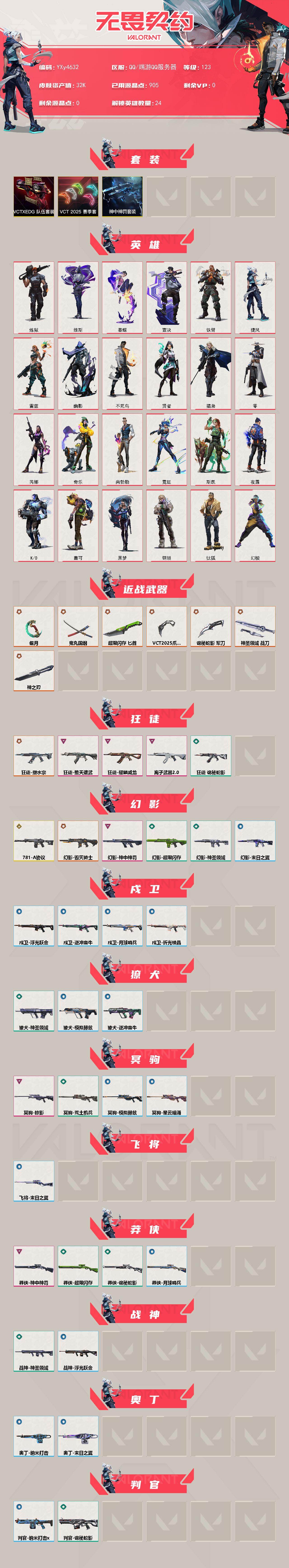 冻结三分钟内解除,短信通知重新上即可!喜欢收藏不迷路、游戏异常进小黑屋、时间不够请提前续租或者不要开局【套装】:VCT 2025 赛季套装,VCTxEDG 队伍套装,神中神罚套装 【英雄】:幻棱,炼狱,维斯,暮蝶,钛狐,壹决,铁臂,捷风,雷兹,幽影,不死鸟,贤者,猎枭,零,芮娜,奇乐,尚勃勒,霓虹,斯凯,夜露,K/O,盖可,黑梦,钢锁 【近战武器】:近战武器-神之刃,近战武器-VCT 2025 爪刀,近战武器-鬼丸国纲,近战武器-超限闪存 匕首,近战武器-偃月,近战武器-诡秘蛇影 军刀,近战武器-神圣领域 战刀 【狂徒】:狂徒-塑水宗,狂徒-堕天遗武,狂徒-耀鳞威龙,狂徒-离子武器//2.0,狂徒-诡秘蛇影 【幻影】:幻影-781-A协议,幻影-毁灭骑士,幻影-神中神罚,幻影-超限闪存,幻影-神圣领域,幻影-末日之翼 【戍卫】:戍卫-浮光跃金,戍卫-逆冲蛮牛,戍卫-月球哨兵,戍卫-折光棱晶 【獠犬】:獠犬-神圣领域,獠犬-模拟赫兹,獠犬-逆冲蛮牛 【冥驹】:冥驹-掠影,冥驹-荒土机兵,冥驹-模拟赫兹,冥驹-星云暗涌 【飞将】:飞将-末日之翼 【莽侠】:莽侠-神中神罚,莽侠-超限闪存,莽侠-诡秘蛇影,莽侠-月球哨兵 【战神】:战神-神圣领域,战神-浮光跃金 【奥丁】:奥丁-纳米击,奥丁-末日之翼 【判官】:判官-诡秘蛇影,判官-纳米=击x 【雄鹿】:雄鹿-模拟赫兹,雄鹿-逆冲蛮牛,雄鹿-月球哨兵 【骇灵】:骇灵-神中神罚,骇灵-荒土机兵,骇灵-浮光跃金,骇灵-星云暗涌 【蜂刺】:蜂刺-超限闪存,蜂刺-星云暗涌,蜂刺-折光棱晶 【标配】:标配-超能偶像,标配-荒土机兵,标配-浮光跃金,标配-折光棱晶 【VCT手枪】:标配-VCT x EDG 【正义】:正义-超限闪存,正义-月球哨兵 【鬼魅】:鬼魅-天界神兵,鬼魅-诡秘蛇影,鬼魅-模拟赫兹,鬼魅-星云暗涌 【狂怒】:狂怒-神中神罚,狂怒-神圣领域,狂怒-逆冲蛮牛 【短炮】:短炮-末日之翼 【卡面】:纳米击 卡面,抑制技术 卡面,激斗汉堡 卡面,瓦娃雪糕 P2 卡面,荒土机兵 卡面,银弹猎手 卡面,《双城之战》拥抱 卡面,精灵大战 卡面,欢迎来到底城 卡面,南瓜盛典 卡面,VCT CN首冠 卡面,唱片的故事 卡面,钢弓与箭弦 卡面,无畏契约:暮蝶 卡面,排除故障 卡面,战术桌游 卡面,悠享食光 卡面,修车达人 卡面,热舞环节 卡面,模拟赫兹 卡面,浮光跃金 卡面,超限闪存 卡面,维斯工牌 卡面,正义的化身 卡面,终章:生意人麦宝 卡面,铁之华 卡面,时间到 卡面,最高舞台 卡面,声感陷阱设计图 卡面,梦幻奶茶 卡面,零点嗅探设计图 卡面,无畏契约GO!一卷:芮娜 卡面,无畏契约GO!第卷:零 卡面,龍记 卡面,完美调谐 卡面 ,暗枪 卡面,夯实根基 卡面,"Luie" 卡面,铁臂设计图 卡面,代号红色 卡面,冰淇淋店 卡面,新兵报到 卡面,V契约 卡面,无畏契约 卡面 【喷漆】:请求重启 喷漆,逆冲蛮牛 喷漆,纳米击 喷漆,简笔画黯兽 喷漆,独守蝰腹 喷漆,他们将落荒而逃 喷漆,通缉:战术企 喷漆,荒土机兵 喷漆,别挡我吃球! 喷漆,嘭! 喷漆,都算到了 喷漆,控场勿近 喷漆,皮蛋呼呼 喷漆,像素星礈 喷漆,图谋不轨的零 喷漆,伤心心 喷漆,小丑猫 喷漆,模拟赫兹 喷漆,高丽风情小熊 喷漆,蹲到一个 喷漆,全力集中 喷漆,超限闪存 喷漆,RUA一下 喷漆,熊抱 喷漆,蛋糕还是爆能器? 喷漆,高丽风情小虎 喷漆,记在小本本 喷漆,防弹鹅 喷漆,高丽风情小蛙 喷漆,超级粉丝 喷漆,捷风差距 喷漆,惊声尖叫 喷漆,拼一枪 喷漆,买装还是存钱 喷漆,醒狮贺春 喷漆,蕊形灯 喷漆,老铁困了 喷漆,胜利属于无畏契约 喷漆,GLHF 喷漆,无畏契约 喷漆 【挂饰】:猫猫木乃伊 挂饰,水壶 挂饰,纳米击 挂饰,逆冲蛮牛 挂饰,伞绳 挂饰,《双城之战》小蛋糕 挂饰,第九季//第三幕 纪念币 挂饰,拳击战术熊 挂饰,工具腰带 挂饰,无畏契约GO!一卷 芮娜 挂饰,无畏契约GO!一卷 零 挂饰,暗藏猫腻 挂饰,高丽风情 挂饰,熔岩灯 挂饰,超限闪存 挂饰,瞬云履 挂饰,迷你K/O 挂饰,模拟赫兹 挂饰,第九季//第二幕 纪念币 挂饰,薰衣草之心 挂饰,终章:这瓜保熟 挂饰,糖葫芦 挂饰,袖珍捷风 挂饰,迷你浓缩 挂饰,第九季//一幕 纪念币 挂饰,VCT x EDG 挂饰,第八季//第三幕 纪念币 挂饰,天外飞客 挂饰,好运福爪 挂饰,《双城之战》魄罗 挂饰,瞄这里 挂饰,第八季//一幕 纪念币 挂饰,第七季//第三幕 纪念币 挂饰,第七季//第二幕 纪念币 挂饰,无畏契约 纪念币 挂饰;VCT 2025 爪刀,堕天遗武 狂徒,塑水宗 狂徒,离子武器//2.0 狂徒,天界神兵 鬼魅,