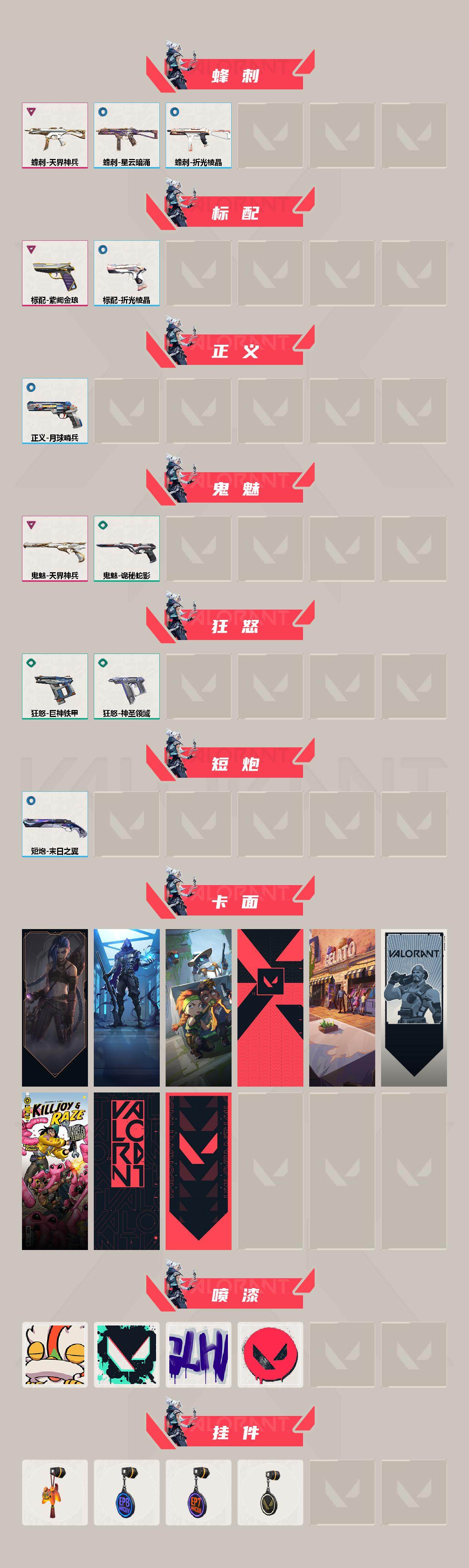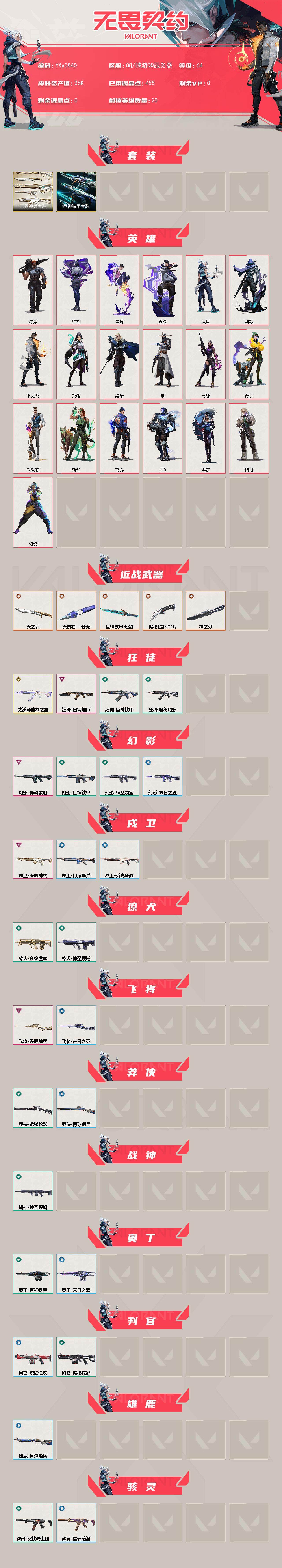 冻结三分钟内解除,短信通知重新上即可!喜欢收藏不迷路、游戏异常进小黑屋、时间不够请提前续租或者不要开局 【套装】:天界神兵套装,巨神铁甲套装 【英雄】:幻棱,炼狱,维斯,暮蝶,壹决,捷风,幽影,不死鸟,贤者,猎枭,零,芮娜,奇乐,尚勃勒,斯凯,夜露,K/O,黑梦,钢锁 【近战武器】:近战武器-神之刃,近战武器-无畏契约GO!一卷 苦无,近战武器-巨神铁甲 短剑,近战武器-天玄刀,近战武器-诡秘蛇影 军刀 【狂徒】:狂徒-艾沃莉的梦之翼,狂徒-日冕雄师,狂徒-巨神铁甲,狂徒-诡秘蛇影 【幻影】:幻影-异鳞魔蛇,幻影-巨神铁甲,幻影-神圣领域,幻影-末日之翼 【戍卫】:戍卫-天界神兵,戍卫-月球哨兵,戍卫-折光棱晶 【獠犬】:獠犬-金纹世家,獠犬-神圣领域 【飞将】:飞将-天界神兵,飞将-末日之翼 【莽侠】:莽侠-诡秘蛇影,莽侠-月球哨兵 【战神】:战神-神圣领域 【奥丁】:奥丁-巨神铁甲,奥丁-末日之翼 【判官】:判官-诡秘蛇影,判官-炽红快攻 【雄鹿】:雄鹿-月球哨兵 【骇灵】:骇灵-冥铁骑士团,骇灵-星云暗涌 【蜂刺】:蜂刺-天界神兵,蜂刺-星云暗涌,蜂刺-折光棱晶 【标配】:标配-紫阙金琅,标配-折光棱晶 【正义】:正义-月球哨兵 【鬼魅】:鬼魅-天界神兵,鬼魅-诡秘蛇影 【狂怒】:狂怒-巨神铁甲,狂怒-神圣领域 【短炮】:短炮-末日之翼 【卡面】:《双城之战》金克丝 卡面,暗枪 卡面,别冒尖 卡面,代号红色 卡面,冰淇淋店 卡面,新兵报到 卡面,友军火力 卡面,V契约 卡面,无畏契约 卡面 【喷漆】:醒狮贺春 喷漆,胜利属于无畏契约 喷漆,GLHF 喷漆,无畏契约 喷漆 【挂饰】:好运福爪 挂饰,第八季//第幕 纪念币 挂饰,第七季//第二幕 纪念币 挂饰,无畏契约 纪念币 挂饰;异鳞魔蛇 幻影,天界神兵 戍卫,天界神兵 蜂刺,天界神兵 飞将,天界神兵 鬼魅,紫阙金琅 标配,