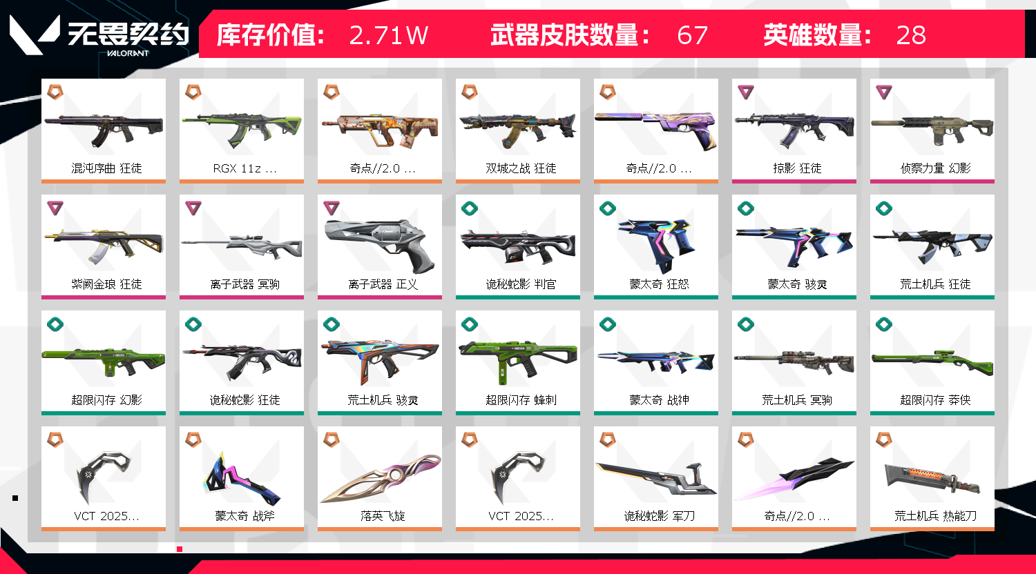 q区2w7价值狂徒显卡掠夺奇点双城混沌紫金侦查幻影 离子大狙正义天玄刀奇点蝴蝶vct爪刀落英飞旋;VCT 2025 爪刀,掠影 狂徒,侦察力量 幻影,紫阙金琅 狂徒,RGX 11z Pro 狂徒,混沌序曲 狂徒,离子武器 冥驹,