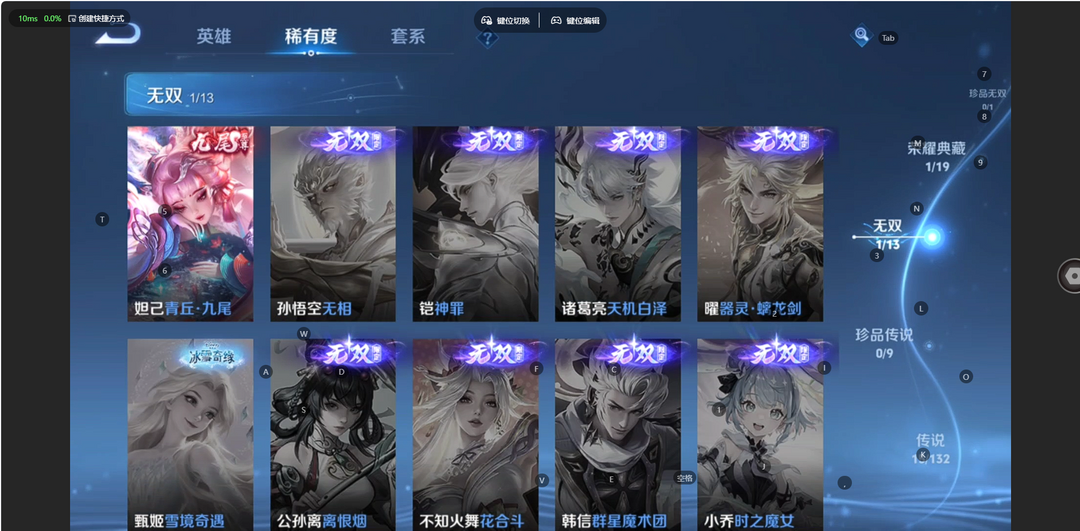 v10、524皮5水4无双、遇见神鼓、齐天大圣、白虎志、韩信荣耀典藏、72传说、愿照·九州拓、时之魔女、瑶无双、青丘、九尾、神器明辉仪
