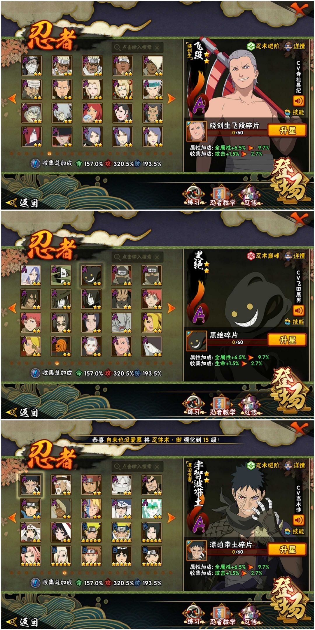 S忍者:【大野木 「忍界大战」,漩涡鸣人 「九喇嘛连结」,千手柱间 「木叶创立」,大筒木舍人 「最终章」,宇智波佐助 「永恒万花筒」,宇智波斑 「木叶创立」,宇智波带土 「忍界大战」,千手柱间 「秽土转生」,大筒木桃式,罗砂 「四代目风影」,宇智波鼬 「秽土转生」,自来也 「舞之豪杰」,佩恩·天道 「超」,药师兜 「仙人模式」,艾 「三代目雷影」,半藏 「秽土转生」,千手扉间 「秽土转生」,纲手 「百豪」,无 「二代目土影」,宇智波斑 「五影会谈」,漩涡鸣人 「暴怒·第六尾」,烈斗 「初代目风影」,宇智波止水 「须佐能乎」,艾 「忍界大战」,自来也 「传说中的三忍」,漩涡鸣人·宇智波佐助,艾 「四代目雷影」,波风水门,波风水门 「秽土转生」,大蛇丸,纲手,鬼灯幻月 「二代目水影」,金角银角 「秽土转生」,佩恩 「天道」,千手扉间,千手柱间,自来也 「仙人模式」,宇智波斑,宇智波鼬 「须佐能乎」,猿飞日斩,猿飞日斩 「秽土转生」,自来也,神秘面具男 「红夜之刃」,宇智波斑 「秽土转生·解」,春野樱 「忍界大战」,大筒木金式,波风水门 「九喇嘛连结」,旗木卡卡西 「须佐能乎」,迈特凯 「死