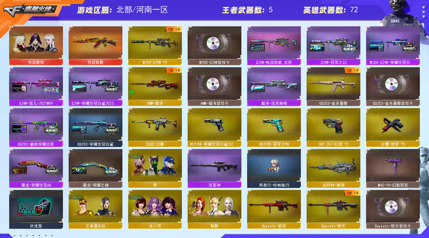 【幻神五皮三件套!!!】【金色蔷薇三件套!!!】【传说武器!!!】【裁决三件套!!!】【M200幻神+幻神音效卡+宠儿皮肤+荣耀世冠白鲨2023皮肤+冠军之幻皮肤+荣耀世冠白鲨皮肤+电流骇客皮肤+冠军之特+炽芒蝶刃+传说影煞】【qbz03金色蔷薇+金色蔷薇音效卡+巅峰荣耀皮肤+荣耀世冠白鲨皮肤】【传说夜影】【G36C幻影】【火麒麟+巅峰荣耀皮肤】【黑龙+黑龙音效卡+冠军之武皮肤】【雷神+雷神音效卡+宠儿皮肤+巅峰荣耀皮肤+荣耀之魄皮肤】【毁灭+毁灭音效卡+CFPLS15冠军皮肤+冠军之怒皮肤】【裁决+裁决音效卡+流光秘银皮肤】【无影 超新星 黑鲨 青龙 无影神兵利器 黑武士锦绣游龙 超新星热带奇洋 源雷神III 穹宇 玫瑰精灵 王者之心 猩红传说 战神 王者之烈 白虎电玩蓝兔 极光 巴雷特朱雀 炼狱 烈龙 王者之霆】——【柯尔特冠军之特 沙鹰修罗*3 cop357幻灵 天神动感闪耀 客人他荣耀世冠白鲨2023】——【炽芒蝶刃 屠龙 擎天 斩神刀雷暴 麒麟刺堕天神 屠龙动感闪耀 擎天云海游龙 龙啸热带奇洋 王者云击】——【热门武器/小人枪】【炫金火麒麟 炫金毁灭 cop白鲨】——【角色】【4防(隼 王者潘多拉)】【传说影煞 关小雨 魅影】;柯尔特-荣耀世冠白鲨2023,柯尔特-冠军之特,炽芒蝶刃,Knife-冠军之刃,传说影煞,隼,QBZ03-金色蔷薇,