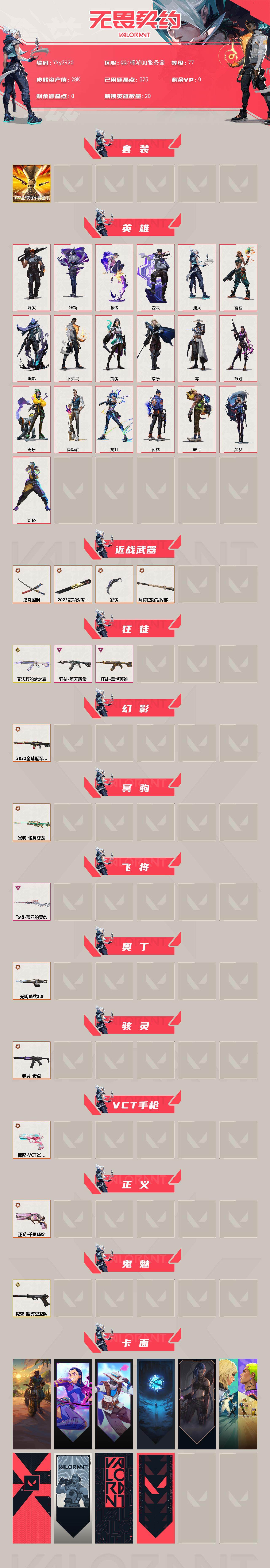 冻结三分钟内解除,短信通知重新上即可!喜欢收藏不迷路、游戏异常进小黑屋、时间不够请提前续租或者不要开局 【套装】:2022全球冠军赛套装 【英雄】:幻棱,炼狱,维斯,暮蝶,壹决,捷风,雷兹,幽影,不死鸟,贤者,猎枭,零,芮娜,奇乐,尚勃勒,霓虹,夜露,盖可,黑梦 【近战 武器】:近战武器-2022全球冠军赛 蝴蝶刀,近战武器-影钩,近战武器-鬼丸国纲,近战武器-阿特拉斯指挥部 甩棍 【狂徒】:狂徒-艾沃莉的梦之翼,狂徒-堕天遗武,狂徒-盖世英雄 【幻影】:幻影-2022全球冠军赛 【冥驹】:冥驹-偃月苍龙 【飞将】:飞将-盖亚的复仇 【奥丁】:奥丁-光明哨兵//2.0 【骇灵】:骇灵-奇点 【VCT手枪】:标配-VCT25 x BLG 【正义】:正义-千灵华绽 【鬼魅】:鬼魅-超时空卫队 【卡面】:暂别喧嚣 卡面,无畏契约GO!一卷:芮娜 卡面,无畏契约GO!一卷:零 卡面,无垠星环 卡面,《双城之战》金克丝 卡面,钢锁vs盖可 卡面,代号红色 卡面,新兵报到 卡面,V契约 卡面,无畏契约 卡面 【喷漆】:禁止喷漆 喷漆,买装还是存钱 喷漆,酷熊冲浪 喷漆,无畏契约GO!一卷:零 喷漆,胜利属于无畏契约 喷漆,GLHF 喷漆,无畏契约 喷漆 【挂饰】:薰衣草之心 挂饰,天外飞客 挂饰,无畏契约 纪念币 挂饰;堕天遗武 狂徒,千灵华绽 正义,