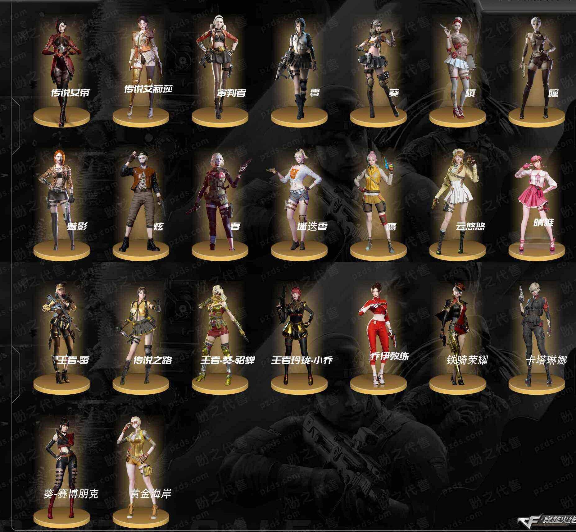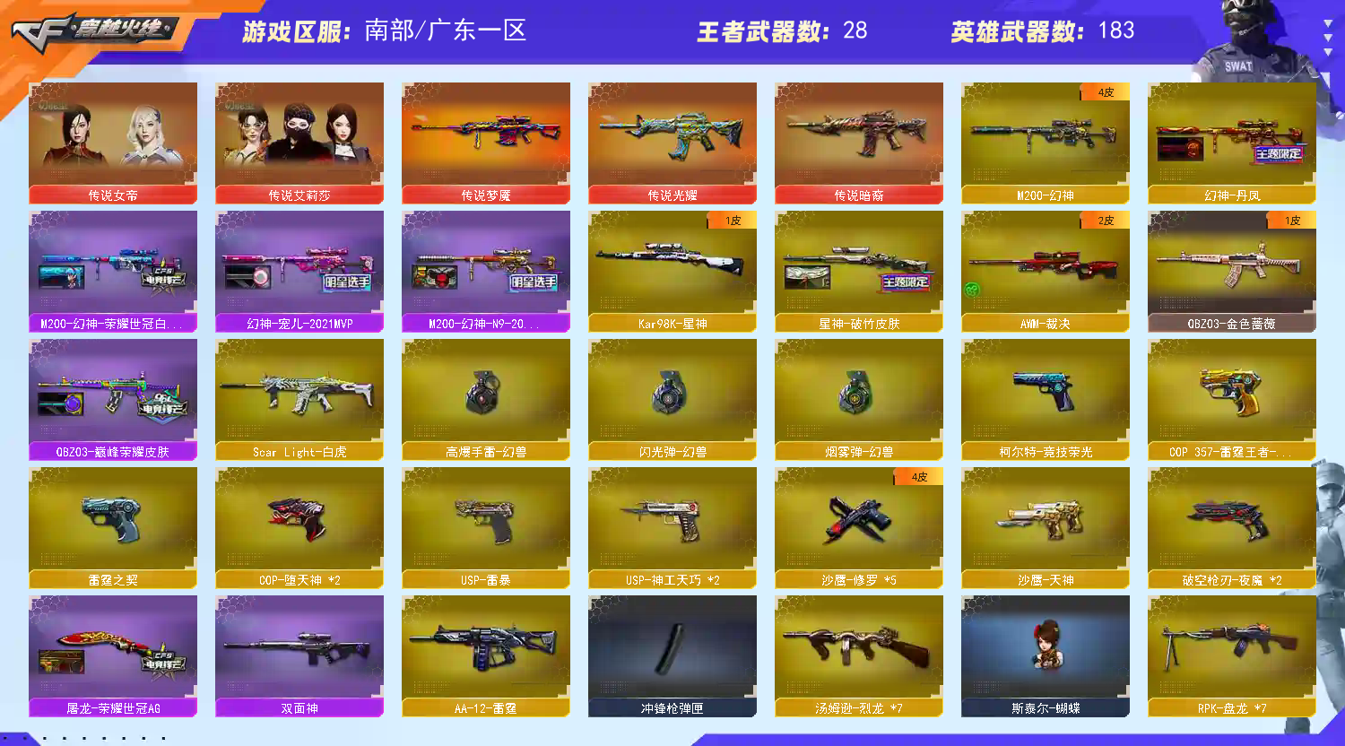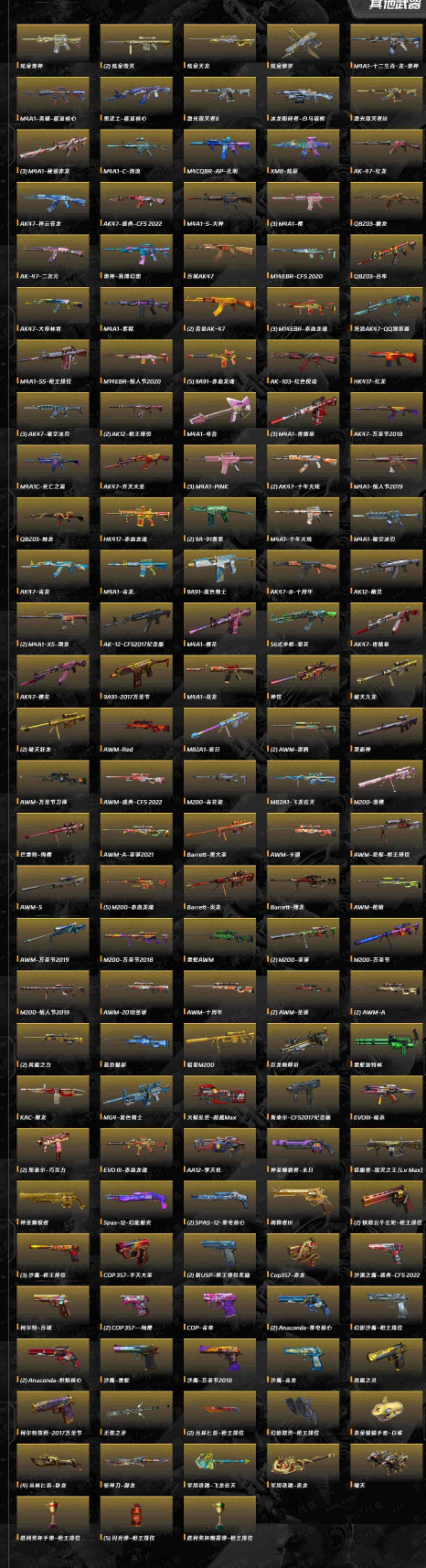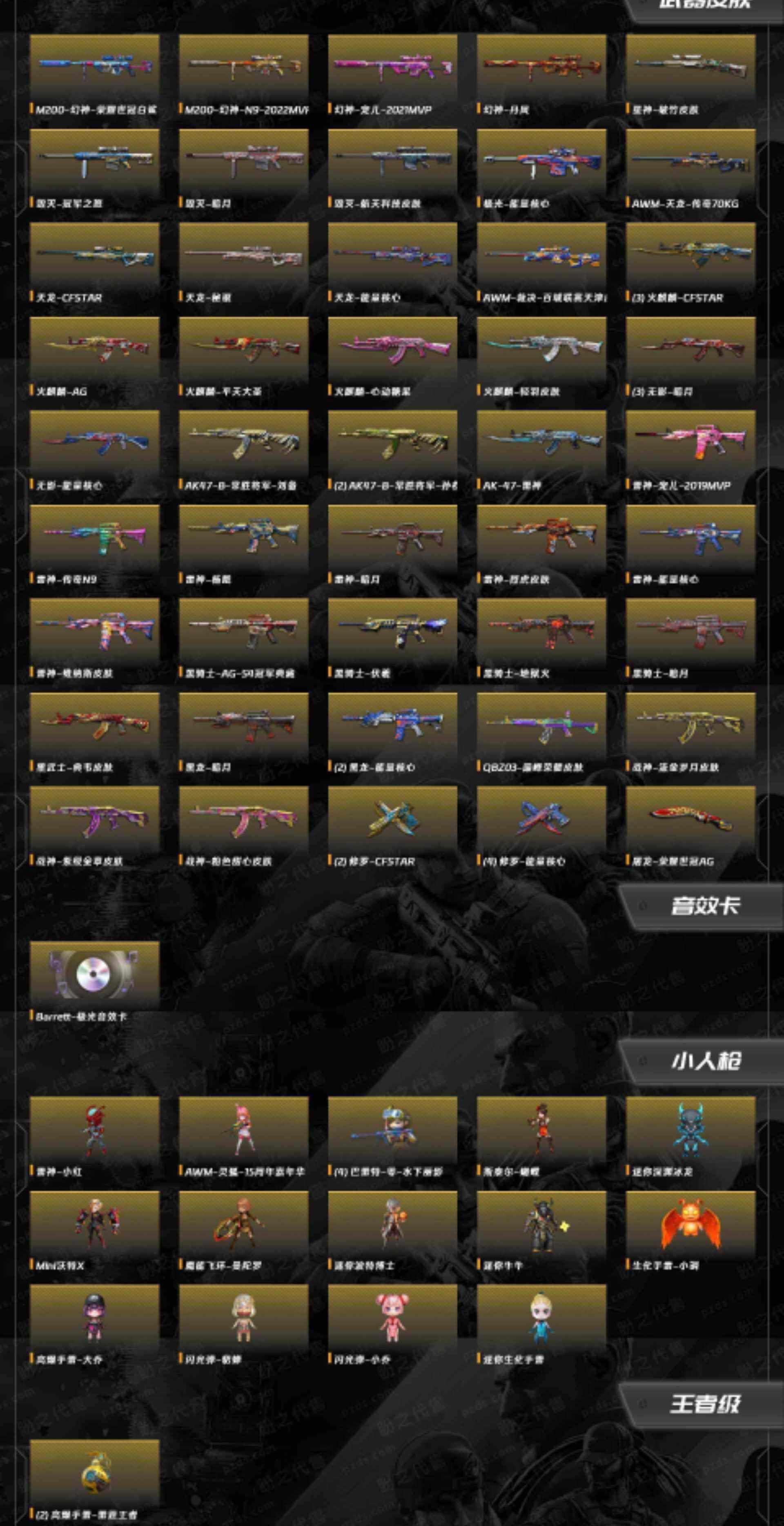 重要套装】堕天神套装/竞技荣光套装/雷暴套装 【重要角色】传说女帝/传说艾莉莎/审判者/_零/_葵/_樱/_瞳/魅影/_炫/_春/_迷迭香/鹰/电竞教官-云悠悠/_晴雅/王者-零/王者零-传说之路/王者-葵-貂蝉/王者玲珑-小乔/乔伊教练/铁骑荣耀/卡塔琳娜/葵-赛博朋克/灵狐者-黄金海岸 【传说武器】传说暗裔/传说光耀/传说梦魇 【英雄武器】_M200-幻神/M200-竞技荣光/Barrett-毁灭(4)/Barrett-极光/barrett-金色蔷薇/Barrett-暗月传说/王者之怒-觉醒版/王者星神-觉醒版/Kar98K-星神/AWM-天龙/AWM-裁决/王者之力-觉醒版/王者之决-觉醒版/M4A1-神工天巧/M4A1-堕天神/M4A1-青龙/M4A1-雷神(7)/荣耀世冠-雷神/M4A1-死神(4)/M4A1-黑龙(2)/M4A1-龙血/M4A1-千变/M4A1-黑骑士(4)/M4A1-雷霆/M4A1-猎神/M4A1-玫瑰精灵(2)/王者之魄-觉醒版/王者之武-觉醒版/王者之势-觉醒版(2)/王者冰魄-觉醒版/王者风势-觉醒版/王者之幻-觉醒版/HK417-朱雀/_Scar Light-白虎/白虎之魄-觉醒版/AK12-天启/AK47-火麒麟(4)/AK47-无影/无影-神兵利器/AK47-雷暴/AK47-黑鲨(2)/AK47-黑武士/AK-47-猩红传说(7)/AK47-B-身先士卒/AK47-B-常胜将军/AK47-B-战士(2)/AK47-B-战神/AN94-超新星/QBZ03-金色蔷薇/王者之心-觉醒版/王者之影-觉醒版/QBZ-03-王者蔷薇-觉醒版/王者之鲨-觉醒版/烈火-动感闪耀/RPK-盘龙(7)/汤姆逊-烈龙(7)/AA-12-雷霆/加特林-炼狱/COP-堕天神(2)/COP 357-雷霆王者-觉醒版/雷霆之契/天神-动感闪耀/沙鹰-天神/沙鹰-修罗(5)/沙鹰-幻兽/破空枪刃-夜魔(2)/柯尔特-竞技荣光/USP-雷暴/USP-神工天巧(2)/麒麟刺(2)/麒麟刺-堕天神(2)/龙啸(2)/龙啸-堕天神/王者之啸-觉醒版/擎天(2)/擎天-竞技荣光/王者之击-觉醒版(2)/屠龙-动感闪耀/屠龙(5)/雷霆之锋/幻灵之锋/王;USP-雷暴,传说女帝,电竞教官-云悠悠,晴雅,传说艾莉莎,RPK-盘龙,QBZ03-金色蔷薇,
