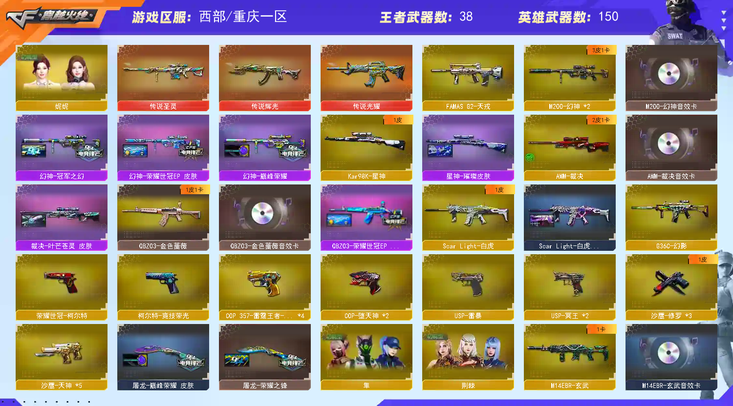 【亮点解析 幻神3皮带卡 裁决三件套 武器齐全 生化满配 】【m200幻神+音效卡+荣耀世冠ep+巅峰荣耀+冠军之幻】【98k星神+璀璨】【m200竞技荣光套+usp雷暴+四防云悠悠】【王者幻神 】【6烈龙 炼狱 6盘龙 斯太尔蝴蝶 隼】【传说光耀 传说辉光 传说圣灵】【g36c幻影】【scar白虎+暗星】【qbz金色蔷薇+卡+荣耀世冠ep】【qbz天罚】【天戎】【玄武+卡】【朱雀】【火麒麟+卡+巅峰荣耀】【黑龙+冠军之武】【雷神+卡+白鲨冠军+荣耀之魄】【黑骑士+卡+冠军之势】【毁灭+卡+荣耀之怒 】【极光】【裁决+卡+叶芒苍灵 】【武器:黑骑士 天启 青龙 堕天神 王者之心 王者之魄 王者之势 王者之幻 王者冰魄 王者炎心 荣耀世冠火麒麟 荣耀世冠雷神 王者白虎 qbz王者蔷薇 毁灭】【18手枪:修罗*3 天神*5 雷暴 堕天神*2 竞技荣光 usp冥王*2 王者之魂 荣耀世冠柯尔特 雷霆王者*4】【24刀具:屠龙*6 擎天*4 麒麟刺 斩神刀雷暴 堕天神 幻灵之峰 王者之啸 王者之击*2 荣耀世冠龙啸 王者玉锋 】【8雷套:雷暴雷 堕天神*7】【小人枪:雷神精英刀锋 火麒麟绝迹 炼狱小刚 】【音效卡:玄武音效卡 雷神音效卡 幻神音效卡 火麒麟音效卡 黑骑士音效卡 裁决音效卡 毁灭音效卡 金色蔷薇音效卡 】【四防角色:云悠悠 王者葵貂蝉 王者瞳闭月羞花 王者魅影 职业经理 】;USP-雷暴,荣耀世冠-柯尔特,隼,电竞教官-云悠悠,妮妮,RPK-盘龙,QBZ03-金色蔷薇,
