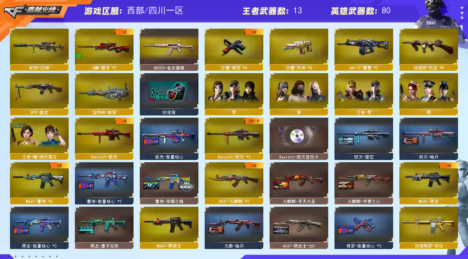 火麒麟/雷神/毁灭/天龙经典皮肤;RPK-盘龙,QBZ03-金色蔷薇,M200-幻神,