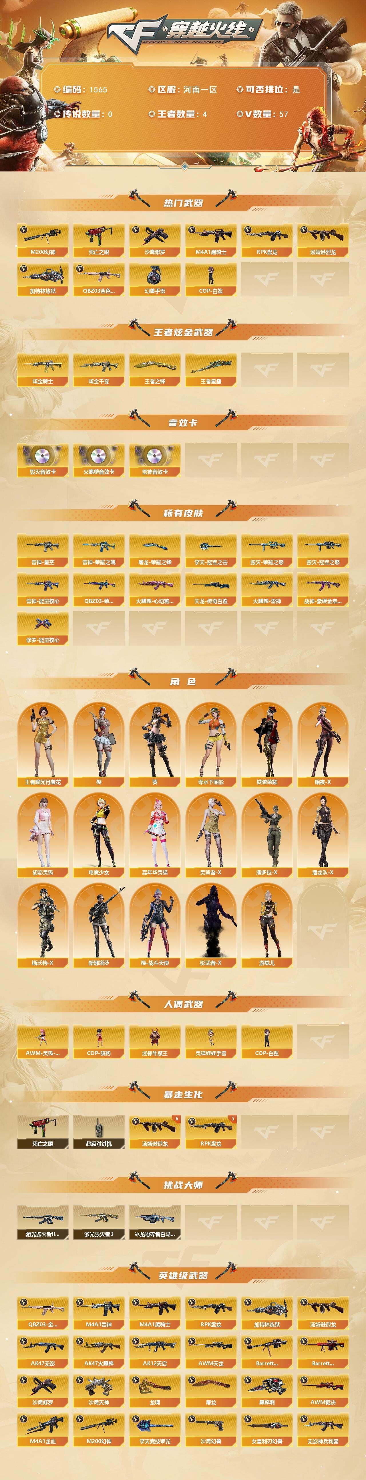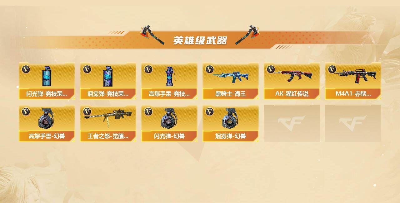 【热门武器】:QBZ03-金色蔷薇,M200-幻神,死亡之眼,M4A1-黑骑士,汤姆逊-烈龙*6,RPK-盘龙*5,加特林-炼狱*2,COP-白鲨,沙鹰-修罗*3,高爆手雷-幻兽【王者炫金武器】:王者星霆,王者之锋*2,炫金骑士,炫金千变*2【音效卡】:AK47-火麒麟音效卡,M4A1-雷神音效卡,Barrett-毁灭音效卡【皮肤】:QBZ03-荣耀世冠白鲨,雷神-能量核心,雷神-荣耀之魄,雷神-星空,火麒麟-雷神,火麒麟-心动糖果,毁灭-荣耀之怒,毁灭-冠军之怒,战神-紫绶金章皮肤,AWM-天龙-传奇白鲨,修罗-能量核心,屠龙-荣耀之锋*2,擎天-冠军之击【角色】:葵,樱,王者-瞳-闭月羞花,暗夜-X,初恋灵狐,电竞少女,嘉年华灵狐,零-水下丽影,灵狐者-X,潘多拉-X,潜龙队-X,斯沃特-X,铁骑荣耀,新娜塔莎,樱-战斗天使,影武者-X,游珑儿【人偶武器】:COP-白鲨,AWM-灵狐-15周年嘉年华,COP-旗袍,迷你牛魔王,灵狐娃娃手雷*2【暴走生化】:死亡之眼,超级对讲机【挑战大师】:冰龙粉碎者-白马银枪,激光毁灭者III-白马银枪,激光毁灭者III【英雄级武器】:AK47-火麒麟*2,M4A1-雷神*2,M4A1-黑骑士,AK47-无影,AK12-天启,M4A1-龙血,无影-神兵利器,QBZ03-金色蔷薇,AK-47-猩红传说,黑骑士-海王,AWM-天龙,Barrett-毁灭,Barrett-极光,AWM-裁决,M200-幻神,王者之怒-觉醒版,RPK-盘龙*5,加特林-炼狱*2,汤姆逊-烈龙*6,沙鹰-修罗*3,沙鹰-天神,沙鹰-幻兽,屠龙*5,龙啸*3,麒麟刺,擎天-竞技荣光,女皇利刃-幻兽,高爆手雷-幻兽,高爆手雷-竞技荣光,闪光弹-幻兽,闪光弹-竞技荣光,烟雾弹-幻兽,烟雾弹-竞技荣光,M4A1-赤狱骑士【道具】:BS战队炫彩背包,CFS限定背包,EP战队炫彩背包,EDG炫彩背包,亚洲杯纪念炫彩背包,全能枪王背包*2,战舰背包,炫彩背包,哔哩哔哩名片,女皇终结者-魔龙之吻,救世主-黑桃战神,妩媚妖姬,绿色巨人,灵魂忍者,变异宝贝,迷雾幽灵,夺命之镰*2,防化服*4,金色流光-枪王排位*2,星辰流光-枪王排位,枪王排位28赛季金色流光,枪王排位29赛季金色流光,EP战队名片,EP战队喷图,EP战队击杀图标,防弹头盔*5,防弹衣*5,C4工具钳*3,手雷包*3【特殊枪械】:1黑骑士,6烈龙,5盘龙,2炼狱,;RPK-盘龙,QBZ03-金色蔷薇,M200-幻神,