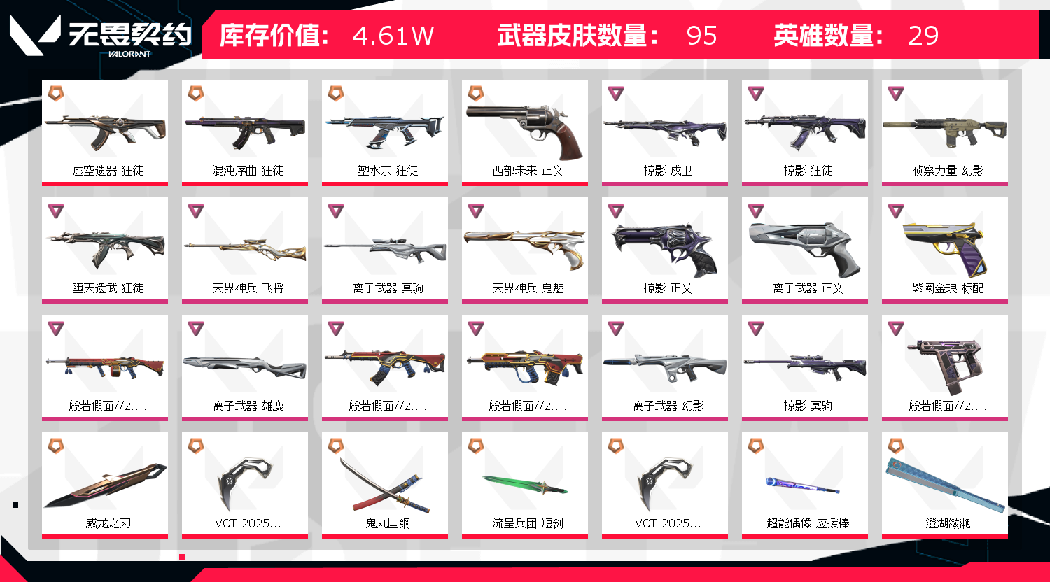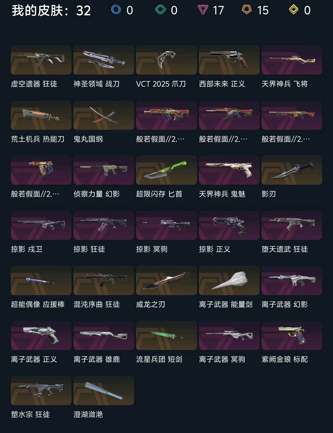 ⭐冻结请点击协助,会自动解冻,等几分钟重新登入即可⭐ 请勿挂机,严🈲游戏中挂机拉黑!!! 账号R点请勿使用,本店铺及时补充新套装,若使用R点无法升级新套装,攒R点辛苦,望谅解! 老板不要杀太多,现在风控的严重,杀多了会临时冻结,到时候我可能不在无法解冻!使用外挂脚本导致游戏账号封禁直接向平台提取ip地址! 本账号经过网络财产备案,一经发现直接报警处理立案追责,根据账号价值全额赔偿感谢支持谢谢合作谢谢合作!!!!禁止利用账号进行开挂、使用辅助违规软件诈骗等违规操作!;威龙之刃,VCT 2025 爪刀,虚空遗器 狂徒,掠影 戍卫,掠影 狂徒,侦察力量 幻影,堕天遗武 狂徒,