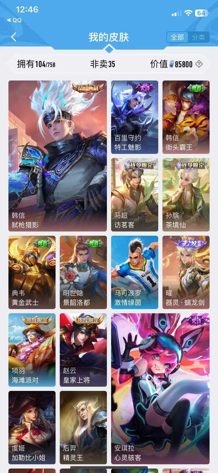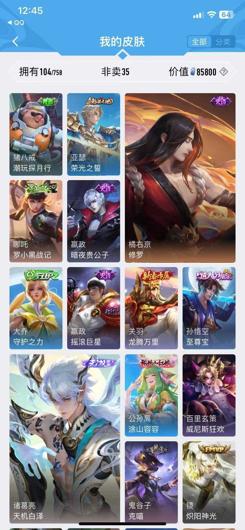 诸葛亮无双♥李白无双♥曜无双♥纵目迁山♥云诺千山♥至尊宝♥万灵启世♥修罗魅语♥韩信典藏