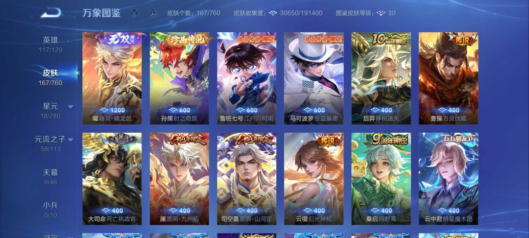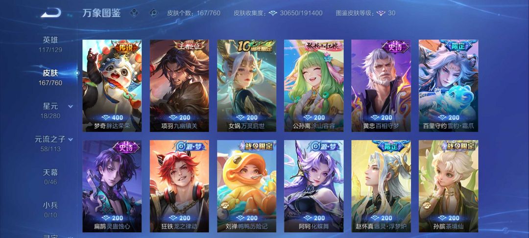 v10、12典藏520皮、马超无双飞将、韩信典藏、马可深海之熄、瑶珍品传说大耳狗之梦、青丘·九尾、枫霜尽、绯月行、前尘镜、至尊宝、天魔缭乱