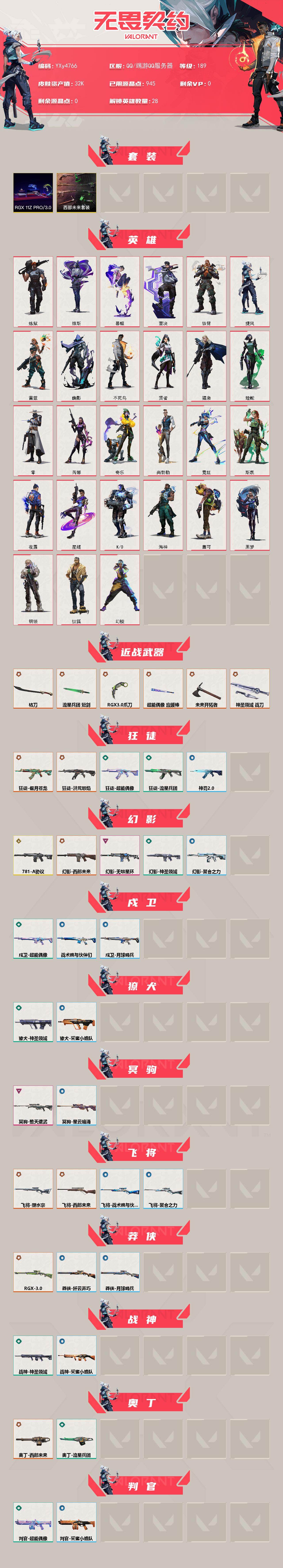 冻结三分钟内解除,短信通知重新上即可!喜欢收藏不迷路、游戏异常进小黑屋、时间不够请提前续租或者不要开局 【套装】:西部未来套装,RGX 11z Pro//3.0套装 【英雄】:幻棱,炼狱,维斯,暮蝶,钛狐,壹决,铁臂,捷风,雷兹,幽影,不死鸟,贤者,猎枭,蝰蛇,零,芮娜,奇乐,尚勃勒,霓虹,斯凯,夜露,星礈,K/O,海神,盖可,黑梦,钢锁 【近战武器】:近战武器-RGX 11z Pro//3.0 爪刀,近战武器-未来开拓者,近战武器-流星兵团 短剑,近战武器-超能偶像 应援棒,近战武器-祜刀,近战武器-神圣领域 战刀 【狂徒】:狂徒-洪荒怒焰,狂徒-偃月苍龙,狂徒-超能偶像,狂徒-流星兵团,狂徒-神罚//2.0 【幻影】:幻影-781-A协议,幻影-西部未来,幻影-无垠星环,幻影-神圣领域,幻影-聚合之力,幻影-西部未来 【戍卫】:戍卫-超能偶像,戍卫-战术熊与伙伴们,戍卫-月球哨兵 【獠犬】:獠犬-神圣领域,獠犬-采蜜小蜂队 【冥驹】:冥驹-堕天遗武,冥驹-星云暗涌 【飞将】:飞将-塑水宗,飞将-西部未来,飞将-聚合之力,飞将-战术熊与伙伴们 【莽侠】:莽侠-RGX 11z Pro//3.0,莽侠-纤云弄巧,莽侠-月球哨兵 【战神】:战神-神圣领域,战神-采蜜小蜂队 【奥丁】:奥丁-西部未来,奥丁-流星兵团 【判官】:判官-超能偶像,判官-采蜜小蜂队 【雄鹿】:雄鹿-离子武器,雄鹿-月球哨兵 【骇灵】:骇灵-塑水宗,骇灵-流星兵团,骇灵-星云暗涌 【蜂刺】:蜂刺-聚合之力,蜂刺-纤云弄巧,蜂刺-星云暗涌 【标配】:标配-超能偶像,标配-战术熊与伙伴们 【VCT手枪】:标配-VCT25 x 100T 【正义】:正义-RGX 11z Pro//3.0,正义-西部未来,正义-超限闪存,正义-复古浪潮,正义-纳米击,正义-纤云弄巧,正义-月球哨兵 【鬼魅】:鬼魅-流星兵团,鬼魅-诡秘蛇影,鬼魅-采蜜小蜂队,鬼魅-宿怨,鬼魅-星云暗涌 【狂怒】:狂怒-神圣领域,狂怒-聚合之力,狂怒-战术熊与伙伴们 【短炮】:短炮-纤云弄巧 【卡面】:终章:激斗汉堡 卡面,进入射程 卡面,《双城之战》拥抱 卡面,精灵大战 卡面,欢迎来到底城 卡面,南瓜盛典 卡面,修车达人 卡面,正义的化身 卡面,终章:生意人麦宝 卡面,铁之华 卡面,失而复得 卡面,时间到 卡面,最高舞台 卡面,复活专家 卡面,归乡 // 蝰蛇 卡面,RGX 11z Pro//3.0 卡面,超能偶像 卡面,生意人麦宝 卡面,音熊登场 卡面,先瓦为敬 - 银色 卡面,树懒大作战 卡面,声感陷阱设计图 卡面,红鳞松叶 卡面,霓帧牛蛙 卡面,钢锁工牌 卡面,战术小伙伴的夏日 卡面,采蜜小蜂队 卡面,聚合之力 卡面,梦幻奶茶 卡面,终章:打造专属狂徒 卡面,趁热吃 卡面,西装暴徒 卡面,失控边缘 卡面,哨卫者之领域 卡面,暮蝶工牌 卡面,战术熊与伙伴们 卡面,源能反应 卡面,流星兵团 卡面,纤云弄巧 卡面,暂别喧嚣 卡面,打造专属狂徒 卡面,零点嗅探设计图 卡面,表象之下 卡面,沙雕爆能器 卡面,无畏契约GO!一卷:芮娜 卡面,清除名单 卡面,无畏契约GO!一卷:零 卡面,龍记 卡面,《双城之战》金克丝 卡面,逆向独行 卡面 ,完美调谐 卡面 ,暗枪 卡面,夯实根基 卡面,"Luie" 卡面,热烈欢迎 卡面,铁臂设计图 卡面,代号红色 卡面,新兵报到 卡面,V契约 卡面,无畏契约 卡面 【喷漆】:嗨宝南瓜灯 喷漆,嘭! 喷漆,都算到了 喷漆,控场勿近 喷漆,小丑猫 喷漆,熊抱 喷漆,又被闪了 喷漆,终极羞辱 喷漆,超级粉丝 喷漆,黯兽卖萌 喷漆,捷风差距 喷漆,惊声尖叫 喷漆,五人成星 喷漆,超能偶像 喷漆,RGX 11z Pro//3.0 喷漆,放我出去 喷漆,战术熊的巴拉莱卡琴 喷漆,审判之爪 喷漆,掩护我 喷漆,大佬发枪 喷漆,边缘试探 喷漆,拼一枪 喷漆,聚合之力 喷漆,采蜜小蜂队 喷漆,梦幻小队 喷漆,五个全都齐了 喷漆,加油!加油! 喷漆,开心到爆炸 喷漆,皮蛋萌舞 喷漆,我觉得不行 喷漆,头号粉丝 喷漆,吸一口快乐 喷漆,永远的答案 喷漆,再来一次? 喷漆,别挡我的路! 喷漆,我的刀呢? 喷漆,当然可以 喷漆,流星兵团 喷漆,战术熊与伙伴们 喷漆,禁止喷漆 喷漆,纤云弄巧 喷漆,霓光四射 喷漆,UWU 喷漆,新潮流 喷漆,双击点赞 喷漆,买装还是存钱 喷漆,醒狮贺春 喷漆,蕊形灯 喷漆,这招不行了 喷漆,老铁困了 喷漆,口袋贤者 喷漆,胜利属于无畏契约 喷漆,GLHF 喷漆,无畏契约 喷漆 【挂饰】:V25第三幕:超凡 挂饰,第九季:超凡 挂饰,终章:猫猫木乃伊 挂饰,悠闲鸡块 挂饰,伞绳 挂饰,《双城之战》小蛋糕 挂饰,第九季//第三幕 纪念币 挂饰,工具腰带 挂饰,无畏契约GO!一卷 芮娜 挂饰,无畏契约GO!一卷 零 挂饰,熔岩灯 挂饰,第九季//第二幕 纪念币 挂饰,薰衣草之心 挂饰,终章:这瓜保熟 挂饰,炼狱雪糕 挂饰,糖葫芦 挂饰,袖珍捷风 挂饰,冲上云霄 挂饰,超能偶像 挂饰,RGX 11z Pro//3.0 挂饰,丢麦 挂饰,迷你浓缩 挂饰,尤克里里 挂饰,这瓜保熟 挂饰,Z世代特饮 挂饰,动力机箱 挂饰,采蜜小蜂队 挂饰,第九季//一幕 纪念币 挂饰,聚合之力 挂饰,终章:迷你机甲 挂饰,犯困的布鲁诺 挂饰,战术河童 挂饰,招财猫熊 挂饰,迷你机甲 挂饰,荧光棒 挂饰,章鱼烧先生 挂饰,流星兵团 挂饰,云开见日 挂饰,第八季//第三幕 纪念币 挂饰,终章:扭结饼干 挂饰 ,瓶中信 挂饰,传世莲华 挂饰,第八季//第二幕 纪念币 挂饰 ,天外飞客 挂饰,好运福爪 挂饰,第八季//一幕 纪念币 挂饰,高音谱号 挂饰,冬日絮语 挂饰,海豹的认可 挂饰,第七季//第三幕 纪念币 挂饰,幸运中国结 挂饰,无畏契约 纪念币 挂饰;西部未来 奥丁,洪荒怒焰 狂徒,塑水宗 飞将,堕天遗武 冥驹,西部未来 飞将,RGX 11z Pro//3.0 莽侠,西部未来 正义,