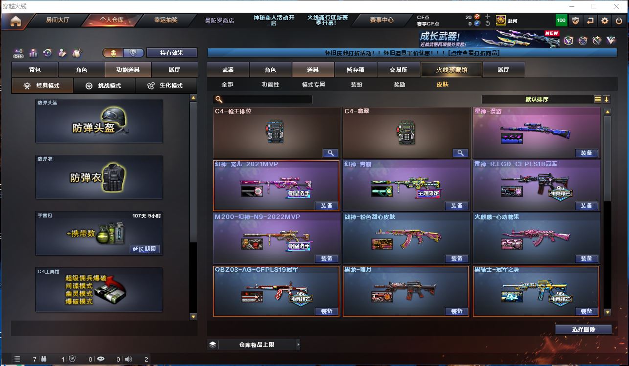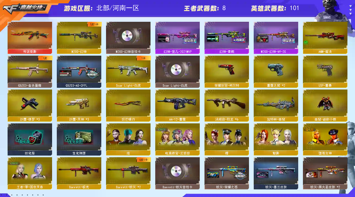 【亮点解析 幻神三件套 哔哩哔哩名片名片】【M200-幻神+音效卡+幻神-宠儿+幻神-青鹤+幻神-N9】【传说夜影】【白虎之魄】【ScarLight-白虎+音效卡】【QBZ03-金色蔷薇】【生化 炼狱 6烈龙 迷你小钢 死亡之眼】【裁决】【毁灭+音效卡+毁灭-荣耀之怒】【极光】【火麒麟】【黑龙】【雷神+音效卡】【黑骑士+黑骑士-冠军之势】【王者之心 王者之武 王者之魄】【死神 黑武士 天启 超新星 黑鲨】【11手枪 修罗*3 天神*3 cop雷霆*2 usp雷暴 柯尔特荣耀世冠】【16近战 屠龙*4 龙啸 擎天*3 麒麟刺*2 斩神刀雷暴 炽芒蝶刃蝴蝶刀 王者之锋】【手雷 雷霆雷*5 雷暴雷 竞技荣光】【四防 王者零国色天香 云悠悠】【幻神音效卡 ScarLight-白虎音效卡】;USP-雷暴,荣耀世冠-柯尔特,炽芒蝶刃,电竞教官-云悠悠,QBZ03-金色蔷薇,M200-幻神,Scar Light-白虎,