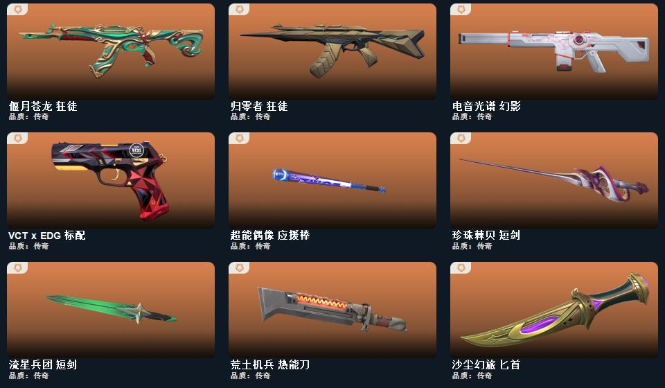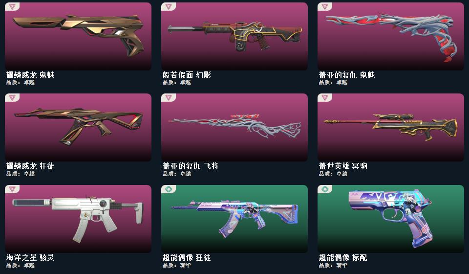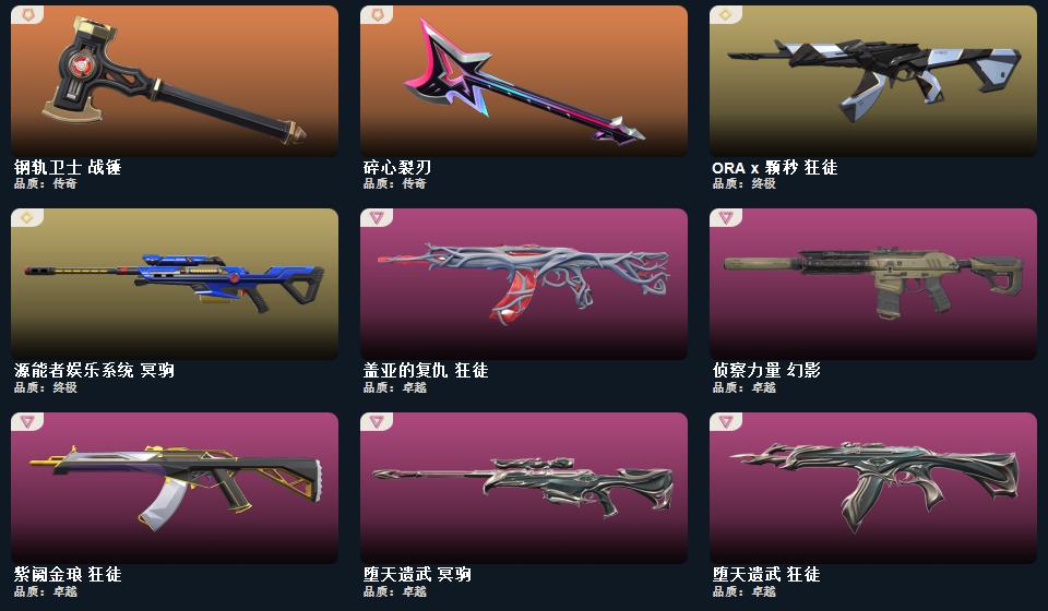 wegame无畏契约★126皮肤,甜心猎手 短炮,诛心猎手 正义,幻心猎手 鬼魅,纳米打击 正义,逆冲蛮牛 狂怒,荒土机兵 标配,浮光跃金 标配,模拟赫兹 鬼魅,超能偶像 标配,奇点 正义,聚合之力 狂怒,采蜜小蜂队 鬼魅,流星兵团 鬼魅,纤云弄巧 正义,VCT x EDG 标配,战术熊与伙伴们 狂怒,纤云弄巧 短炮,战术熊与伙伴们 标配,珍珠棘贝 狂怒,深海水族 短炮,复古浪潮 正义,钢轨卫士 短炮,钢轨卫士 狂怒,光导纤维 标配,光导纤维 鬼魅,耀鳞威龙 鬼魅,盖亚的复仇