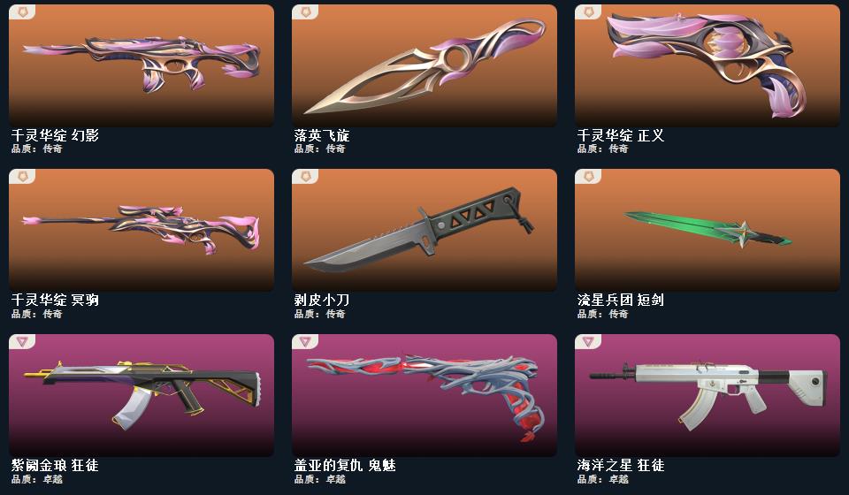 wegame无畏契约★武器皮肤数量:26,幻心猎手 鬼魅,星云暗涌 鬼魅,纳米打击 正义,超能偶像 标配,流星兵团 鬼魅,纤云弄巧 正义,千灵华绽 正义,战术熊与伙伴们 标配,纤云弄巧 短炮,战术熊与伙伴们 狂怒,盖亚的复仇 鬼魅