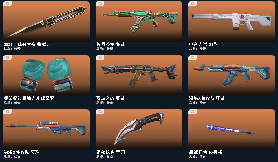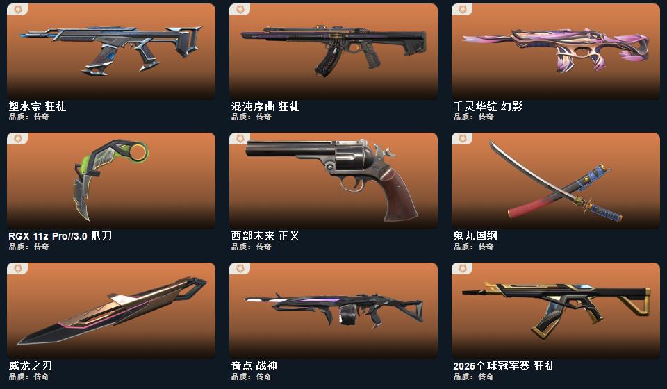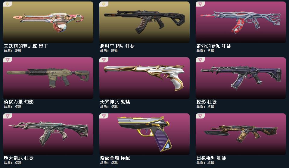 wegame无畏契约★武器皮肤数量:167,幻心猎手 鬼魅,星际猎兵 标配,阿特拉斯指挥部 标配,日耀风暴 正义,幻语魔咒 狂怒,甜蜜战术 鬼魅,诡秘蛇影 鬼魅,折光棱晶 标配,末日之翼 短炮,星云暗涌 鬼魅,西部未来 正义,神圣领域 狂怒,月球哨兵 正义,天界神兵 鬼魅,纳米打击 正义,荒土机兵 标配,逆冲蛮牛 狂怒,般若假面//2.0 狂怒,超限闪存 正义,紫阙金琅 标配,超能偶像 标配,聚合之力 狂怒,采蜜小蜂队 鬼魅,流星兵团 鬼魅,传奇制造 正义,纤云弄巧 正义,