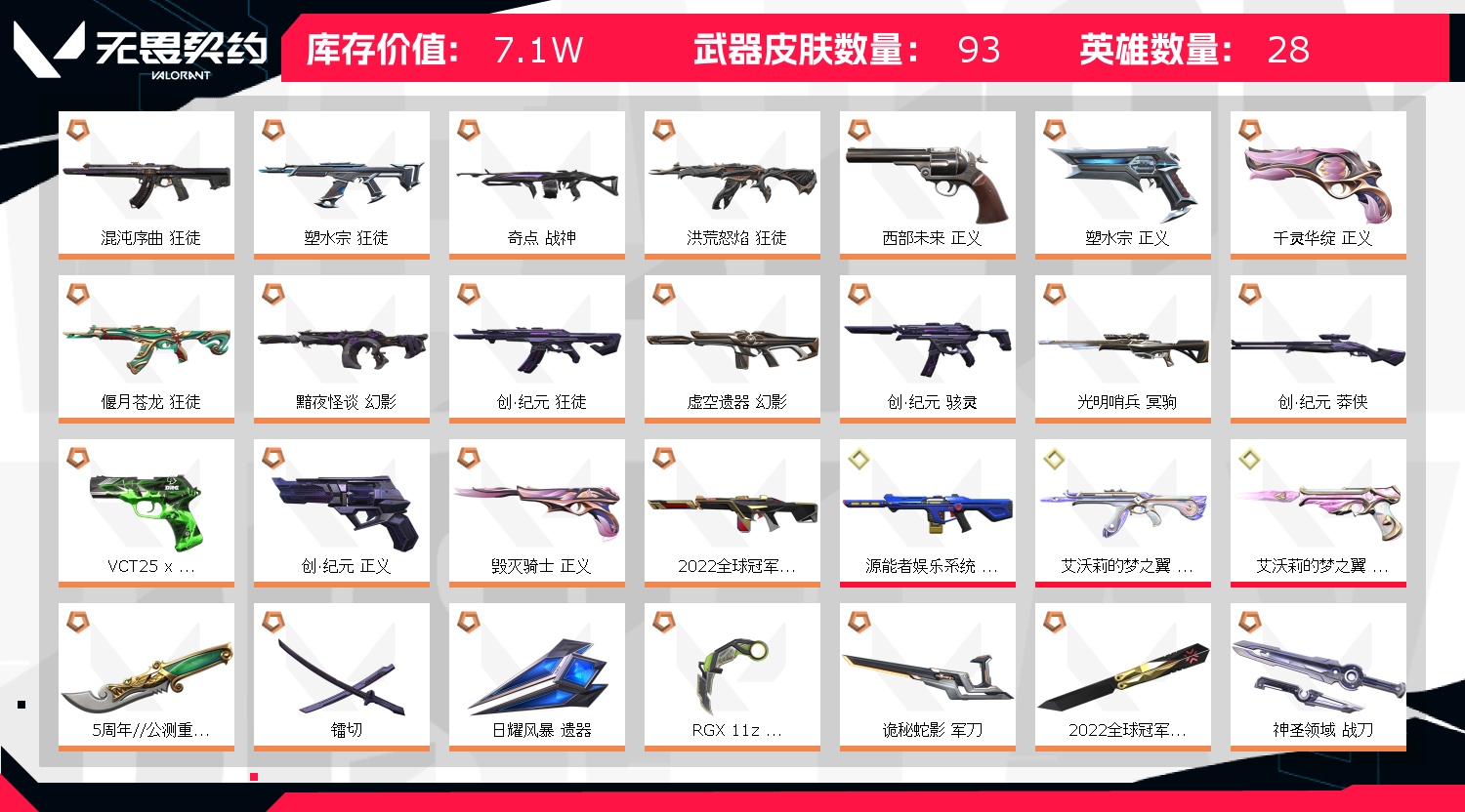 【拥有套装】2022全球冠军赛套装(2022全球冠军赛-幻影,2022全球冠军赛-蝴蝶刀)创纪元套装(创·纪元-狂徒,创·纪元-莽侠,创·纪元-骇灵,创·纪元-正义,镭切) 【拥有近战武器】5周年//公测重制版-苍龙之刃,RGX-11z-Pro//3.0-爪刀, 【拥有步枪】虚空遗器-幻影,混沌序曲-狂徒,黯夜怪谈-幻影,洪荒怒焰-狂徒,塑水宗-狂徒,偃月苍龙-狂徒,艾沃莉的梦之翼-狂徒,源能者娱乐系统-幻影,离子武器//2.0-狂徒,紫阙金琅-狂徒,盖亚的复仇-狂徒,侦察力量-幻影,冰点凝冻-狂徒,源能者危机001-幻影,般若假面-幻影,掠影-狂徒,掠影-戍卫 【拥有狙击枪】光明哨兵-冥驹,盖世英雄-冥驹,咒缚双界-冥驹 【拥有机枪】奇点-战神,紫阙金琅//2.0-奥丁 【拥有冲锋枪】奇幻朋克-骇灵 【拥有霰弹枪】紫阙金琅//2.0-雄鹿 【拥有手枪】VCT25-x-DRG-标配,西部未来-正义,毁灭骑士-正义,千灵华绽-正义,塑水宗-正义,艾沃莉的梦之翼-鬼魅,紫阙金琅-标配,耀鳞威龙-鬼魅,离子武器-正义 【稀有挂件】V25第三幕钻石挂饰,危化小分队小麦挂饰,危化小分队小黑挂饰, 【卡面信息】万圣夜卡面,危化小分队双双受困卡面,危化小分队差点玩完卡面,;奇点 战神,5周年//公测重制版 苍龙之刃,镭切,盖亚的复仇 狂徒,掠影 戍卫,洪荒怒焰 狂徒,掠影 狂徒,