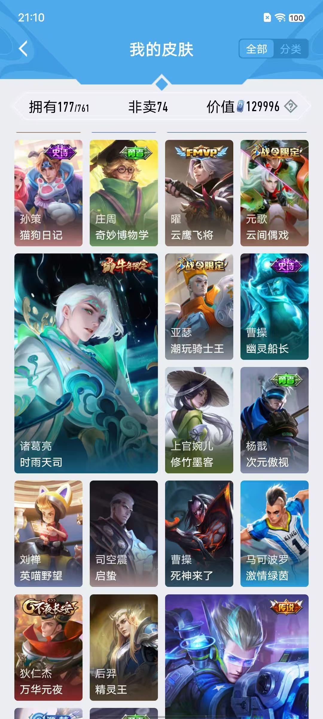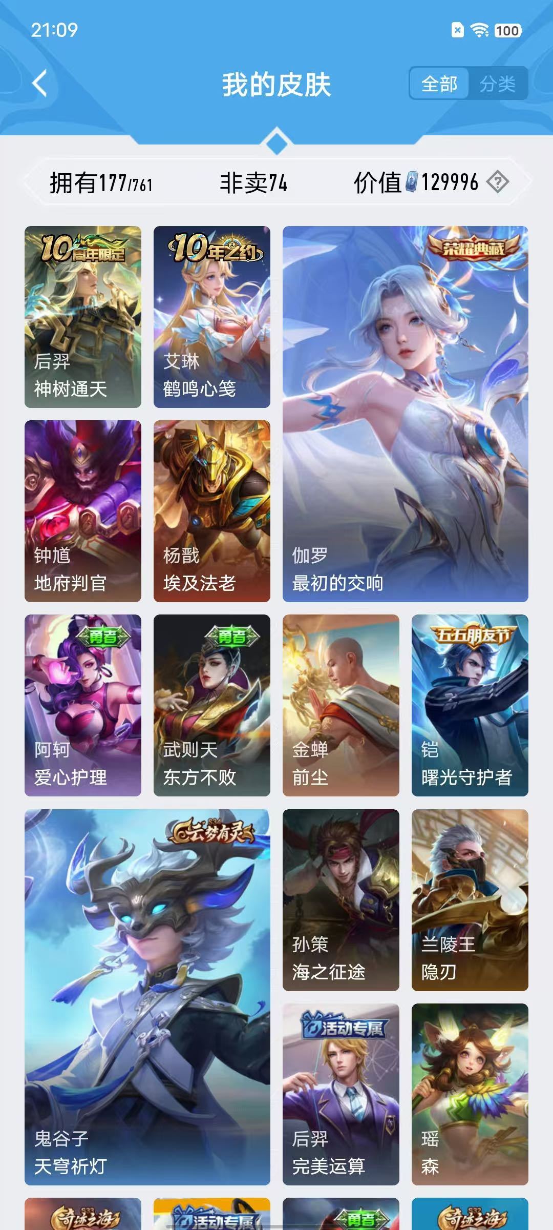v10、524皮5水4无双、遇见神鼓、齐天大圣、白虎志、韩信荣耀典藏、72传说、愿照·九州拓、时之魔女、瑶无双、青丘、九尾、神器明辉仪