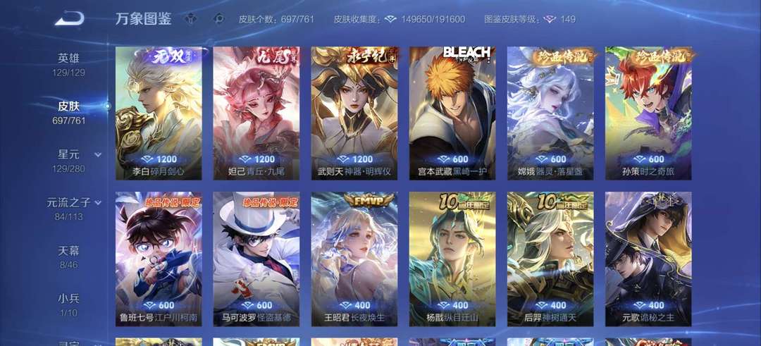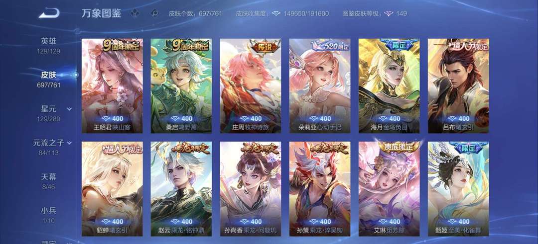 V11至尊宝无双飞将齐天大圣馥梦繁花李逍遥神威126英雄697 皮肤/8水晶9星传说