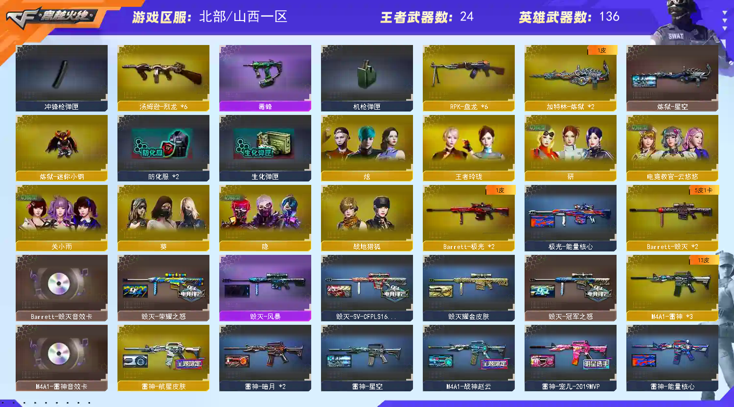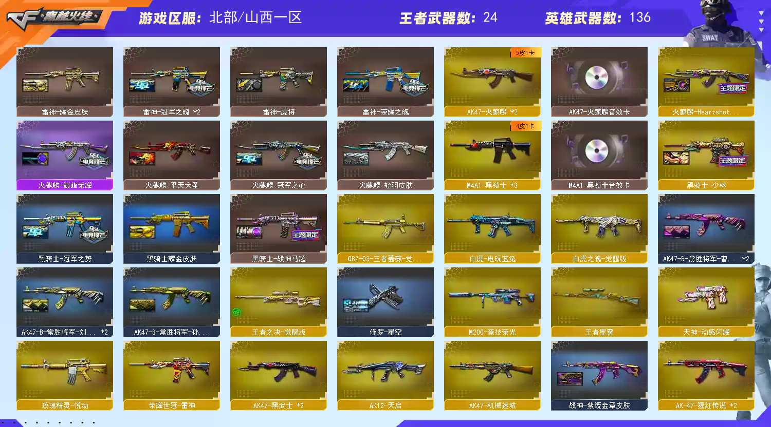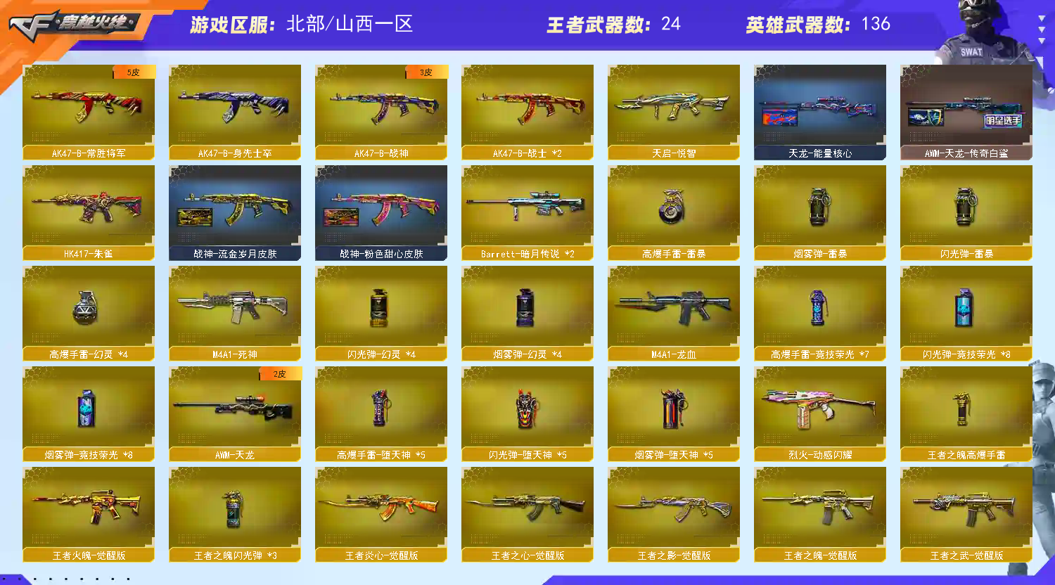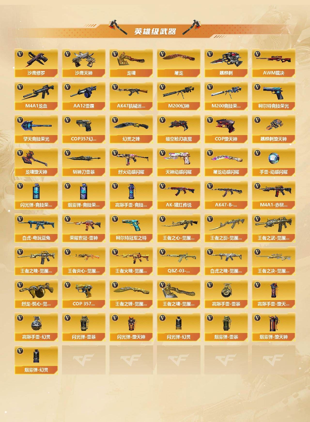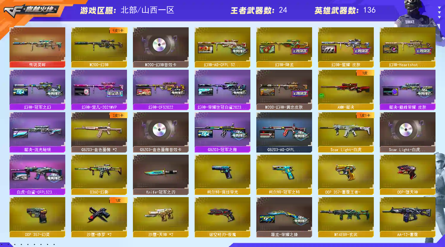 【传说武器】:传说灵眸【热门武器】:传说灵眸,G36C-幻影,QBZ03-金色蔷薇*2,M14EBR-玄武,Scar Light-白虎,HK417-朱雀,M200-幻神,M200-竞技荣光,死亡之眼,荣耀世冠-雷神,白虎-电玩蓝兔,柯尔特-冠军之特,金色小号,C.A.T,炼狱-迷你小钢,毒蜂,牛牛-AK47,M4A1-黑骑士*3,汤姆逊-烈龙*6,RPK-盘龙*6,加特林-炼狱*2,雷神-小红,毁灭-孙三炮,COP-白鲨,COP-堕天神,COP 357-幻灵,沙鹰-修罗*2,Knife-冠军之刃,炽芒蝶刃-荣耀世冠白鲨2023 皮肤【王者炫金武器】:天启-悦智,玫瑰精灵-悦动,王者星霆,王者之啸*2,炫金骑士,炫金黑龙,王者之魄高爆手雷,王者之魄闪光弹*3【音效卡】:烈火-动感闪耀 音效卡,M200-幻神音效卡,AK47-火麒麟音效卡,M4A1-雷神音效卡,M4A1-黑骑士音效卡,Barrett-毁灭音效卡,Scar Light-白虎音效卡,绝迹语音包,HK417-朱雀音效卡【皮肤】:M200-幻神-黄忠皮肤,幻神-冠军之幻,幻神-宠儿-2021MVP,幻神-CFS2022,幻神-降龙,幻神-星耀 皮肤,幻神-Heartshot 皮肤,幻神-荣耀世冠白鲨2023 皮肤,幻神-AG-CFPL S24冠军 皮肤,白虎-白鲨-CFPLS23冠军,QBZ03-冠军之薇,QBZ03-AG-CFPLS19冠军,裁决-流光秘银,裁决-巅峰荣耀 皮肤,雷神-暗月*2,雷神-能量核心,雷神-荣耀之魄,雷神-星空,雷神-虎将,雷神-耀金皮肤,雷神-冠军之魄*2,M4A1-战神赵云,雷神-宠儿-2019MVP,雷神-航星皮肤,火麒麟-雷神,火麒麟-冠军之心,火麒麟-轻羽皮肤,火麒麟-平天大圣,火麒麟-巅峰荣耀,毁灭-荣耀之怒,毁灭耀金皮肤,毁灭-冠军之怒,毁灭-SV-CFPLS16冠军,毁灭-风暴,M4A1-黑龙-361,黑骑士耀金皮肤,黑骑士-冠军之势,黑骑士-战神马超,黑骑士-少林,战神-粉色甜心皮肤,战神-紫绶金章皮肤,战神-流金岁月皮肤,AK47-B-常胜将军-曹操*2,AK47-B-常胜将军-刘备*2,AK47-B-常胜将军-孙权,天龙-能量核心,AWM-天龙-传奇白鲨,极光-能量核心,炼狱-星空,修罗-星空,屠龙-荣耀之锋,炽芒蝶刃-荣耀世冠白鲨2023 皮肤【角色】:葵,炫,电竞教官-云悠悠,关小雨,研,隐,战地猎狐,王者玲珑,乔伊教练,修道士,云海玲珑,空,暗夜-X,嘉年华灵狐,卡塔琳娜,职业选手【人偶武器】:雷神-小红,COP-白鲨,毁灭-孙三炮,炼狱-迷你小钢,巴雷特-零-水下丽影*2【英雄级武器】:AK47-火麒麟*2,M4A1-雷神*3,M4A1-黑骑士*3,M4A1-死神,AK47-黑武士*2,AK12-天启,AK47-机械迷城,M4A1-龙血,HK417-朱雀,Scar Light-白虎,M14EBR-玄武,G36C-幻影,QBZ03-金色蔷薇*2,烈火-动感闪耀,王者之心-觉醒版,王者之影-觉醒版,王者之武-觉醒版,王者之魄-觉醒版,AK-47-猩红传说*2,AK47-B-战神,王者炎心-觉醒版,王者火魄-觉醒版,AK47-B-常胜将军,QBZ-03-王者蔷薇-觉醒版,白虎-电玩蓝兔,白虎之魄-觉醒版,荣耀世冠-雷神,AWM-天龙,Barrett-毁灭*2,Barrett-极光*2,AWM-裁决,M200-幻神,M200-竞技荣光,王者之决-觉醒版,RPK-盘龙*6【道具】:EP战队炫彩背包,XROCK炫彩背包,亚洲杯纪念炫彩背包,炫彩背包,背包-葫芦兄弟,虎牙炫彩背包,超级背包*2,防弹头盔*4,防弹衣*4,C4工具钳*2,手雷包*2】;柯尔特-冠军之特,Knife-冠军之刃,电竞教官-云悠悠,RPK-盘龙,QBZ03-金色蔷薇,G36C-幻影,M200-幻神,