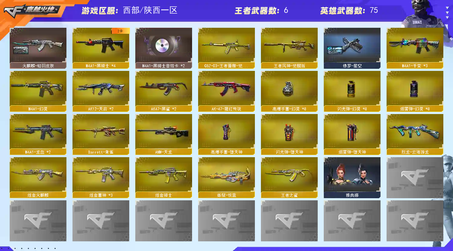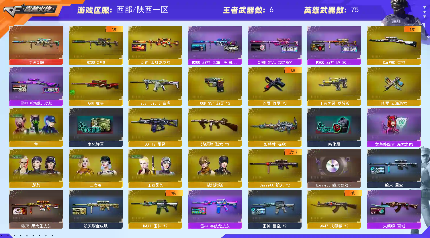西部号 148V可排🔥传说灵眸/星神+枪娘/王者风神/幻神+四皮🔥幻灵套装🔥百城/纸灯笼/孔明等/四防【陕西一区登录】【炫金稀有顶1V介意者勿租】【恶意投诉、撤单不想玩了租错号了等非帐号问题1律拉黑】【此号已备案请勿以身试法】【开挂必究账号价值超高】详细武器请看下方 【重要套装】幻灵套装/四防角色 【重要角色】隼/_影豹/王者春/王者影豹/雅典娜/灵动武士/幽/灵狐者-职业经理/云海玲珑 【传说武器】传说灵眸 【英雄武器】_M200-幻神/Barrett-毁灭(2)/Barrett-朱雀/Kar98K-星神/AWM-天龙/AWM-裁决/M4A1-雷神(2)/M4A1-龙血(2)/M4A1-千变(3)/M4A1-黑骑士(4)/黑骑士-海王/M4A1-幻灵/Scar Light-白虎/AK12-天启(2)/AK47-火麒麟(2)/AK47-黑鲨(2)/AK-47-猩红传说/QBZ-03-王者蔷薇-觉醒版/9A91-烈火/汤姆逊-烈龙(3)/AA-12-雷霆/加特林-炼狱/COP 357-幻灵(2)/王者之灵-觉醒版/沙鹰-修罗(3)/麒麟刺-堕天神/屠龙(2)/幻灵之锋/王者之锋-觉醒版/高爆手雷-幻灵(8)/高爆手雷-堕天神/烟雾弹-幻灵(8)/烟雾弹-堕天神/闪光弹-幻灵(8)/闪光弹-堕天神/王者风神-觉醒版/烈龙-云海游龙/修罗-云海游龙/擎天-云海游龙/龙啸-烈火龙威/手雷-云海游龙 【王者武器】王者之鲨/炼狱-悦蓝 【小人枪】雷神-小红 【其他重要武器】炫金雷神(3)/炫金火麒麟/炫金骑士/火麒麟-能量核心/黑骑士-摸金校尉/激光毁灭者III-白马银枪/冰龙粉碎者-白马银枪/激光毁灭者III/黄金AK-47(2)/AK47-轮回/M14EBR-情人节2020(2)/AK47-枪娘/M4A1-紫狱/M4A1-战龙/海浪AK47-浏览器/M14EBR-天羽/9A91-蓝色骑士/AK47-万圣节2018/M4A1-十年火线/AK47-娜塔莎/AK47-死亡之翼/AK47-丹龙/AK47-苍龙(3)/M4A1-圣诞2021/AK47-盛典-CFS 2022/M4CQBR-AP-孔明/M4A1-秘银赤龙/M4A1-C-海浪/QBZ03-锋芒破茧(2)/M4A1-水枪-机甲核心(2)/G3A3-SS-枪王排位/M4A1-樱/AK47-齐天大圣/AK-47-二次元(3)/XM8-炫彩/M4A1枪王排位II/AK47-SS/AK47-绚樱/Barrett-孔明/AWM-红色悦动/M200-大黄蜂(3)/AWM-摸金校尉/M200-牡丹/AWM-枪娘/AWM-恶棍-枪王排位/FN弩炮-CFS2017纪念版/M200-万圣节/暗金M200/AWM-十周年/AWM-盛典-CFS 2022/AWM-A-圣诞2021/Barrett-耀龙/蓝色魅影/AWM-A-彩虹/AWM-Red/AWM-蓝水晶/AWM-小故障/凤凰之力(5)/AWM-A枪王排位II/AWM-卡通/AWM-Pink/KAC-小动物/MG3-翔龙/阿梅利轻机枪-暗夜风暴/斯泰尔-巧克力/EVO3A1-火线13周年(2)/AA12-擎天柱/试炼破坏者III/SPAS-12-雷电核心(2)/沙鹰-青龙(2)/Anaconda-黑金神龙/幻影Anaconda-枪王排位/COP-金蝉子-枪王排位(2)/新USP-怒火大圣/凤凰之灵/新USP-枪王排位奖励(6)/沙鹰-万圣节2018/沙鹰-枪王排位(2)/蟒蛇-炫彩/愤怒公牛左轮-丹龙/愤怒公牛左轮-枪王排位/幻影扳手-枪王排位/虹光丛林匕首-枪王排位(2)/丛林匕首-枪王排位/斩神刀-青帝/鹰爪-枪王排位/匕首-幻能朋克/Laser Sword-夏日/幻影双斧-枪王排位/蝴蝶刀-枪王排位/手雷-能量核心/闪光弹-枪王排位(10)/胜利奖杯闪光弹-枪王排位(2)/胜利奖杯烟雾弹-枪王排位(4)/胜利奖杯手雷-枪王排位 【重要武器皮肤】幻神-纸灯龙皮肤/M200-幻神-荣耀世冠白鲨/M200-幻神-N9-2022MVP/幻神-宠儿-2021MVP/极光-能量核心/巴雷特-毁灭-CFPL冠军/毁灭-星空/毁灭耀金皮肤/毁灭-黑大圣皮肤/星神-枪娘默 皮肤/雷神-宇航兔皮肤/雷神-星空/M4A1-千变-孔明皮肤/火麒麟-百城/火麒麟-轻羽皮肤/AK-47-雷神/修罗-星空 【重要光效】M4A1-黑龙金色光效/加特林-炼狱蓝色光效/M4A1-黑骑士蓝粉色光效/M200-幻神紫橙光效/M4A1-黑龙紫色光效/M4A1-黑骑士绿色光效/屠龙绿色光效 【重要音效卡】Barrett-极光音效卡/M4A1-黑骑士音效卡/M4A1-黑龙音效卡/Barrett-毁灭音效卡 【重要戒指】8周年戒1/龙眼(鹰)/16赛季纪念戒指-枪王耀金/17赛季纪念戒指-耀金/18赛季纪念戒指-耀金/21赛季纪念戒指-耀铜(食指)/21赛季纪念戒指-耀银(拇指)/22赛季纪念戒指-耀铜(食指)/22赛季纪念戒指-耀银(拇指)/23赛季纪念戒指-耀铜(食指)/23赛季纪念戒指-耀银(拇指)/24赛季纪念戒指-耀银(食指) /24赛季纪念戒指-耀银(拇指)/26赛季纪念戒指-耀金(拇指)/26赛季纪念戒指-耀金(食指);