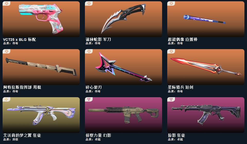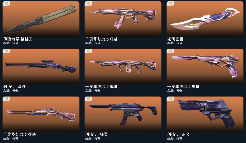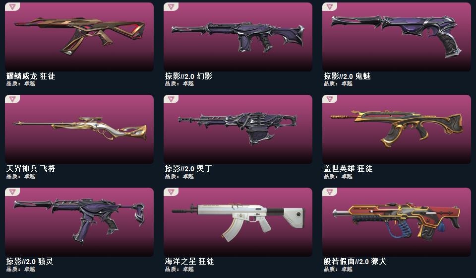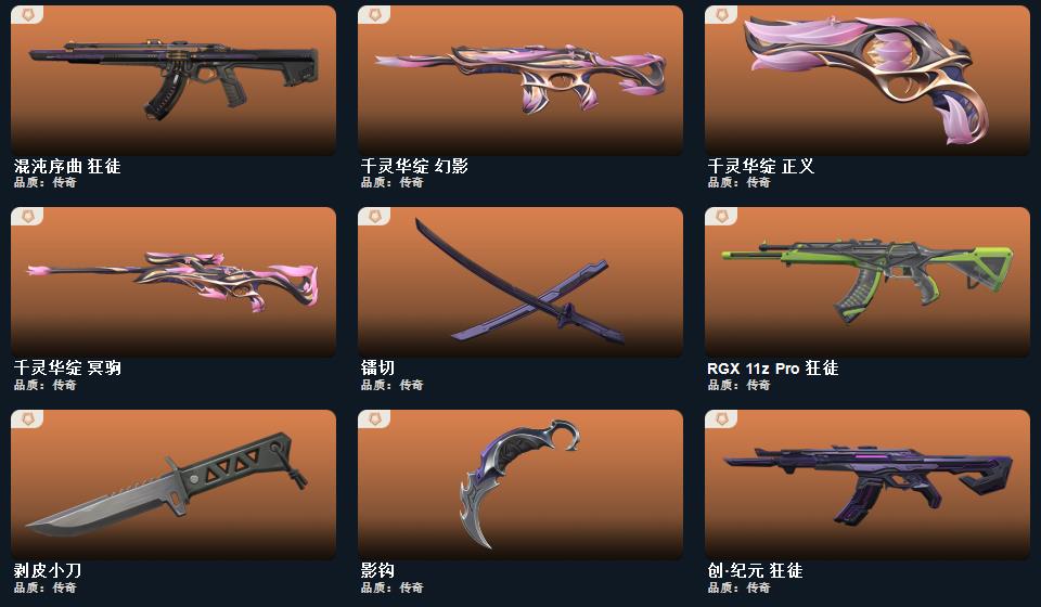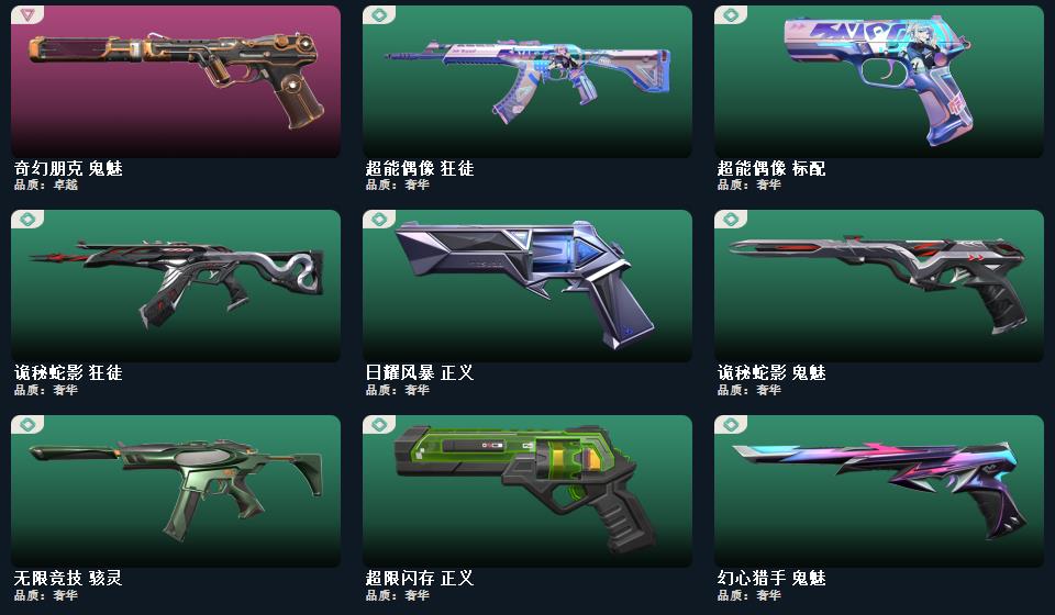 wegame无畏契约★ 枪皮数量102 甜心猎手 短炮,诛心猎手 正义,千灵华绽//2.0 鬼魅,幻心猎手 鬼魅,星际猎兵 标配,光环序列 狂怒,瑰梦艺语 鬼魅,好搭档 短炮,阿特拉斯指挥部 标配,太空穿梭 正义,悠闲猫生 短炮,掠影//2.0 鬼魅,千灵华绽 正义,奇幻朋克 鬼魅,日耀风暴 正义,灵魂消声者 鬼魅,VCT25 x BLG 标配,诡秘蛇影 鬼魅,折光棱晶 标配,末日之翼 短炮,星云暗涌 鬼魅,创·纪元 正义,纳米打击 正义,超限闪存 正义,聚合之力 狂怒,采蜜