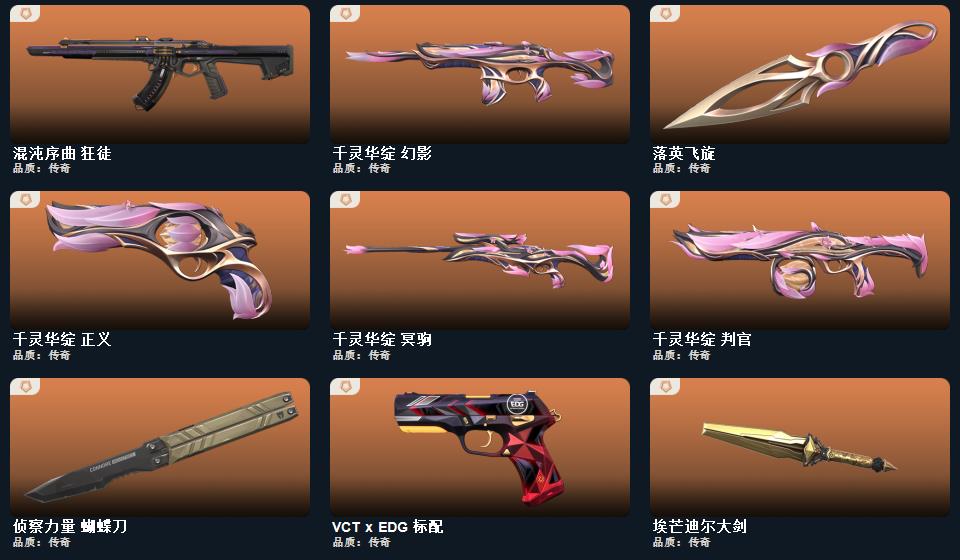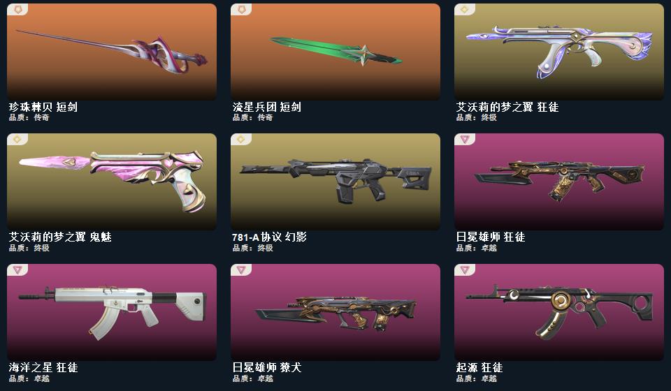 wegame无畏契约★侦察力量 蝴蝶刀,埃芒迪尔大剑,流星兵团 短剑,落英飞旋,珍珠棘贝 短剑,星际猎兵 标配,聚合之力 蜂刺,采蜜小蜂队 獠犬,聚合之力 飞将,采蜜小蜂队 判官